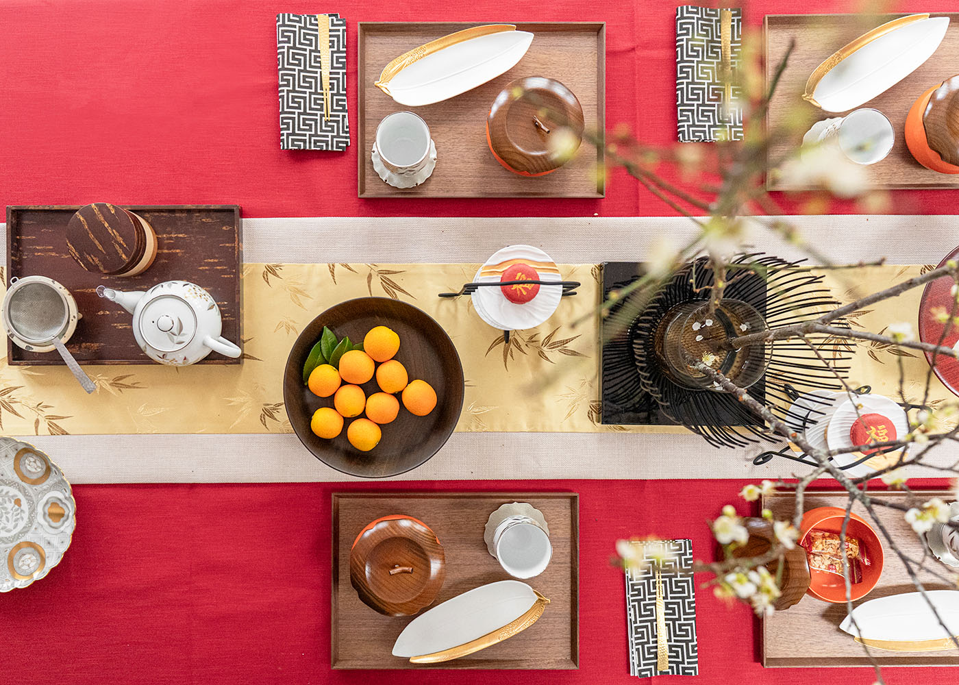 緋紅桌布疊加金色竹影桌旗,濃郁色彩與熠熠金光,竹影隨光影若隱若現正好契合新春佳節動靜皆宜的雅致。