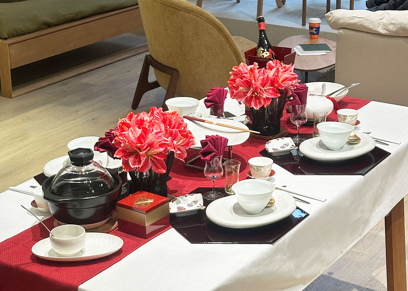 盛開的 紅禧花藝、緋紅酒杯餐布、陶土鍋具與精緻酒器 並陳的擺設技巧,正是在現代簡約居家空間裡,演繹雍容時尚年味的最佳示範。