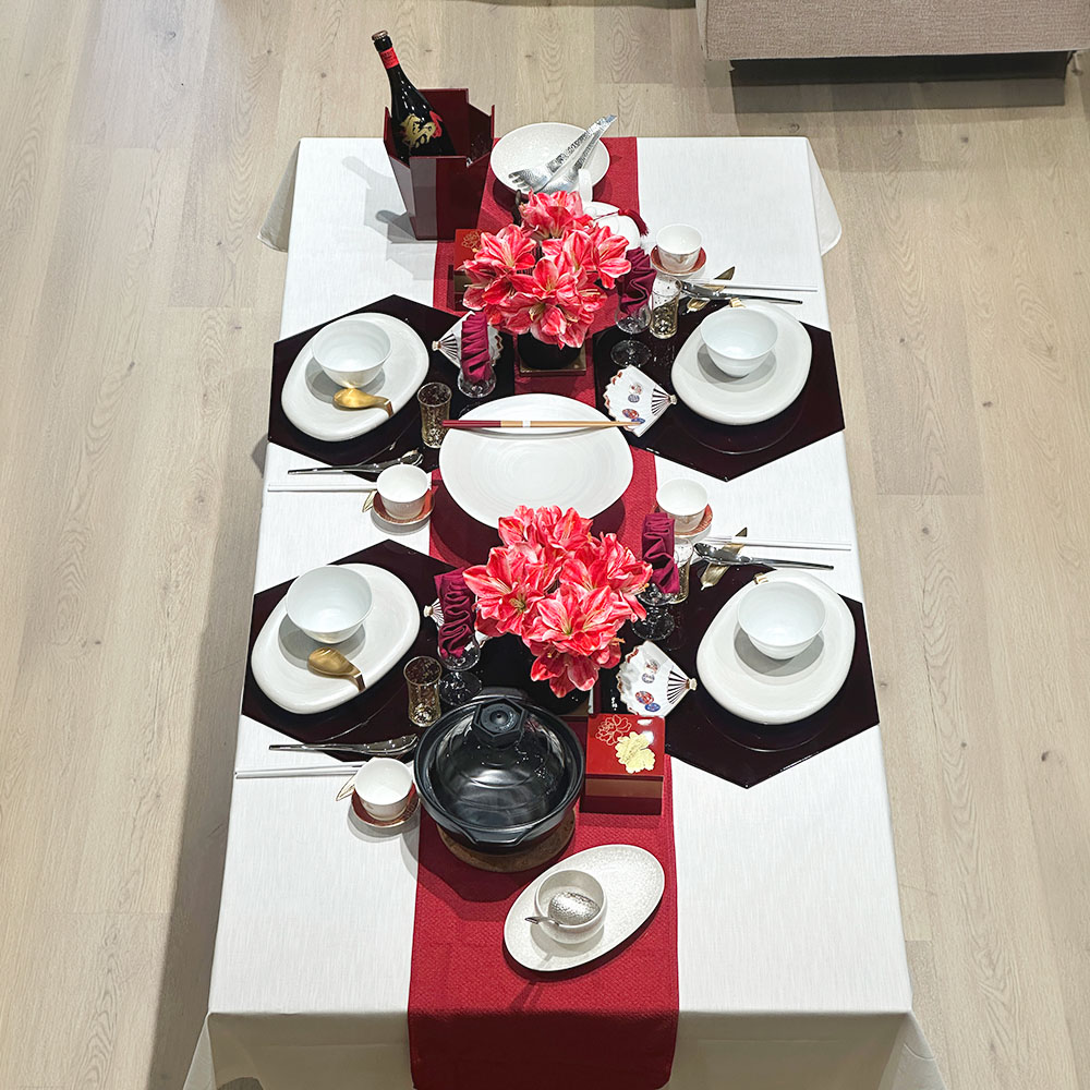 中央以一抹緋紅桌旗點睛,「白搭紅」的純淨配比,賦予了現代感的透亮,為團圓時分留出自在的視覺呼吸空間。