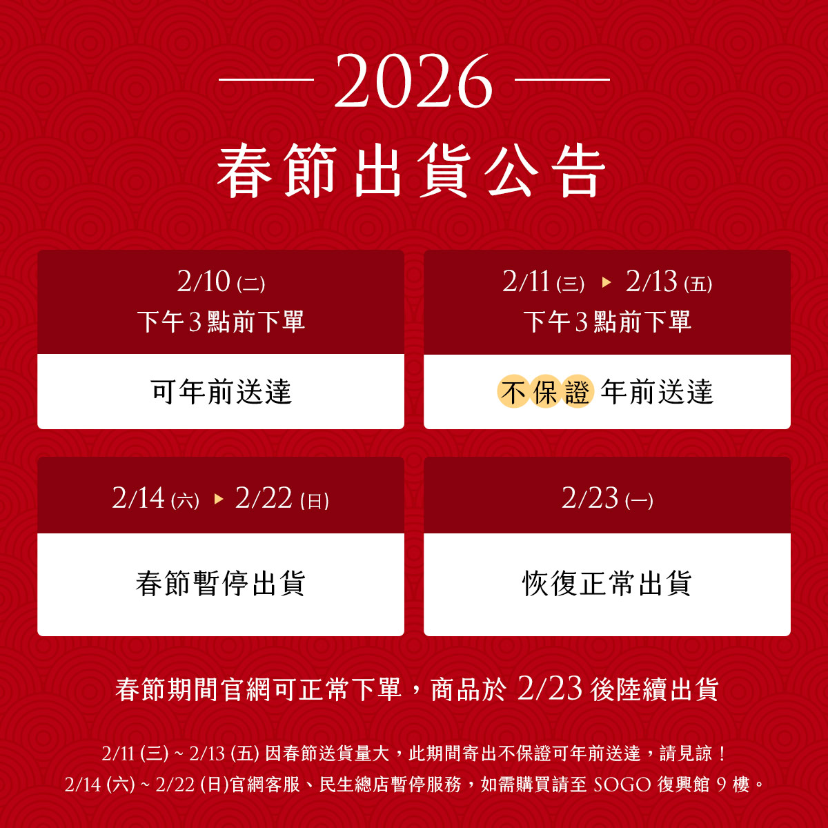 2/14 (六) ~ 2/22 (日) 春節公休 ,如需購買請至SOGO復興館9樓櫃位