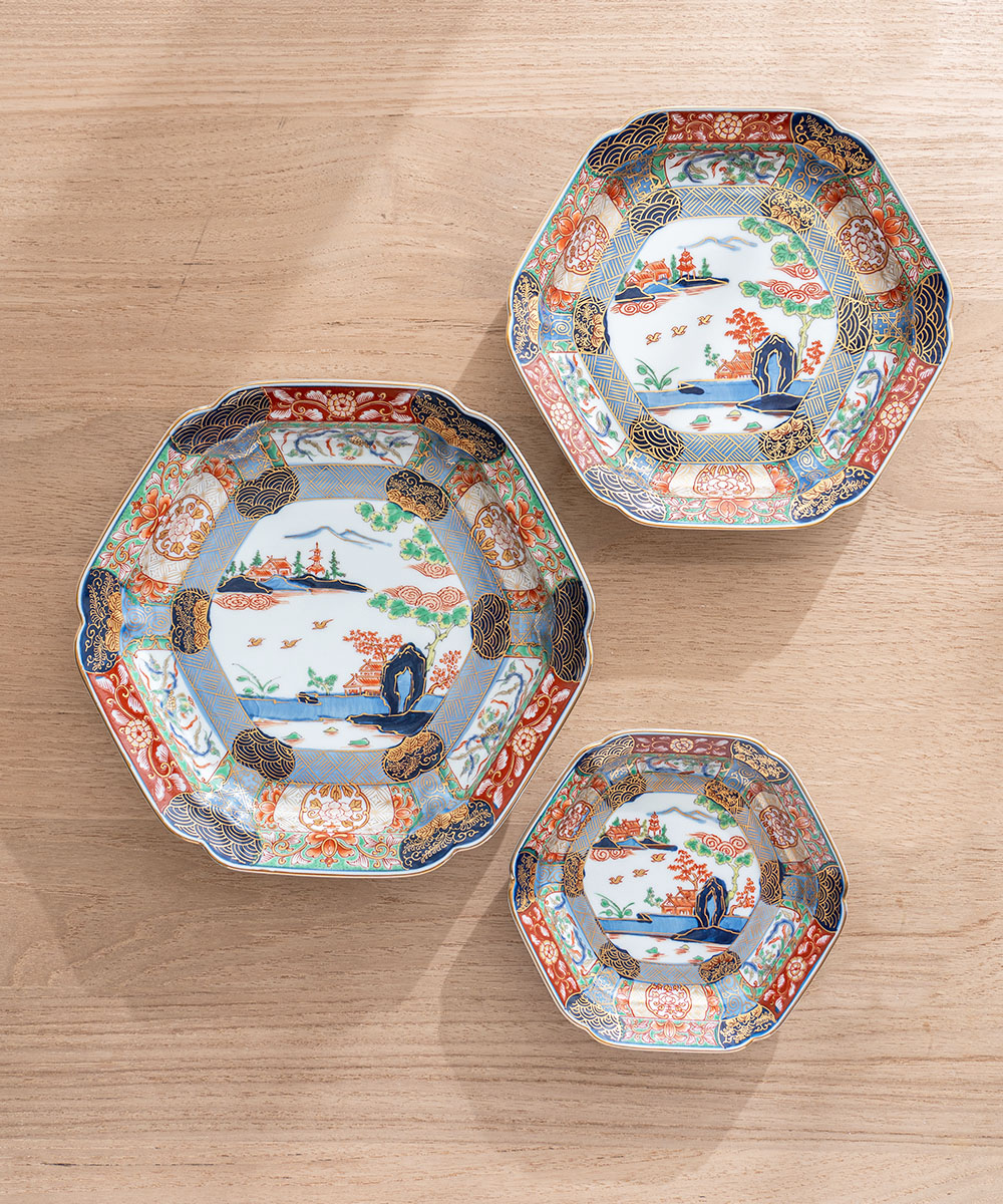 「古伊萬里樣式」是承襲歷史悠久的有田技法的三大樣式之一。古伊萬里的獨特技法,是以紅綠釉彩為底,再繪上金色的華麗釉彩。六角盤鮮明的色彩、金色和白色的完美平衡,讓它成為一個高雅而驚豔的作品。不僅適合搭配日常餐點,也是送給熱愛日本藝術與工藝之人的絕佳禮物。