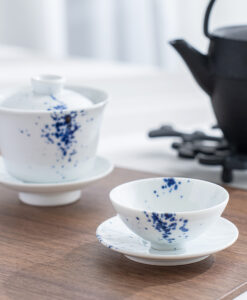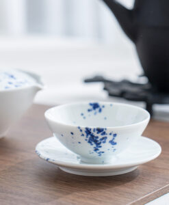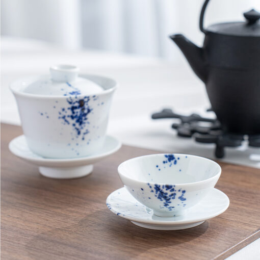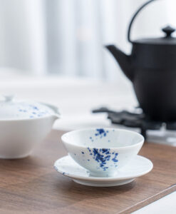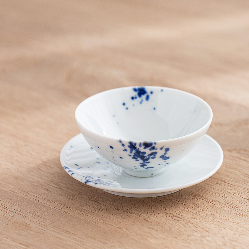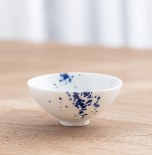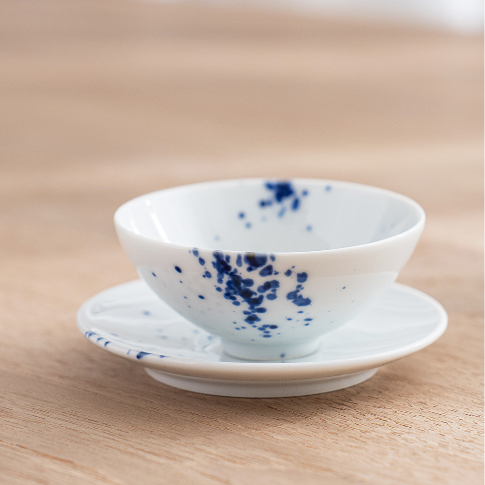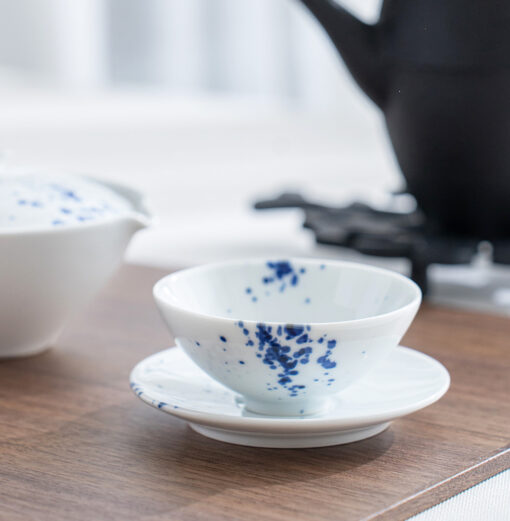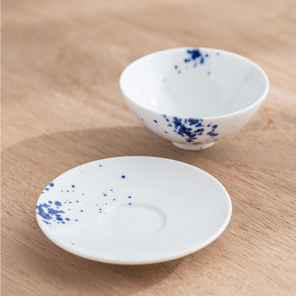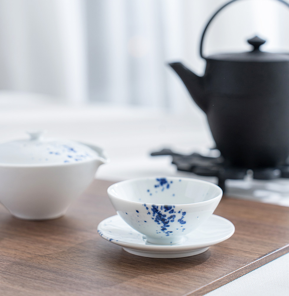 創意而具風雅的吹墨圖紋,在明亮細緻的白瓷上特別有型。壺身一角有著錯落不一的吹墨紋,是李莊窯出品沈穩優雅風格的經典茶具之一。圓潤敞口的設計,不僅方便品飲,也展現出雅緻的美感,令人愛不釋手。