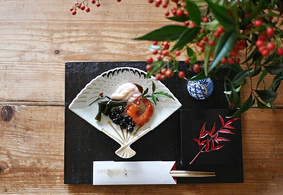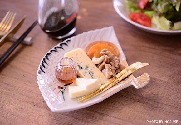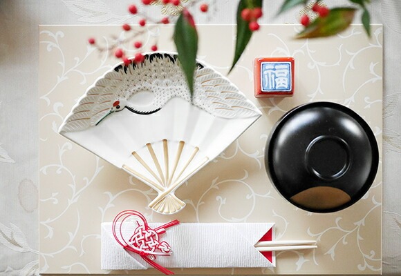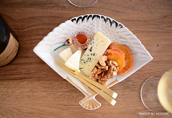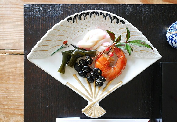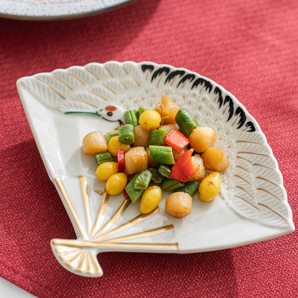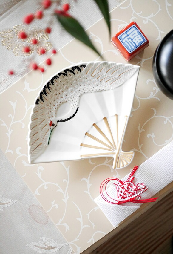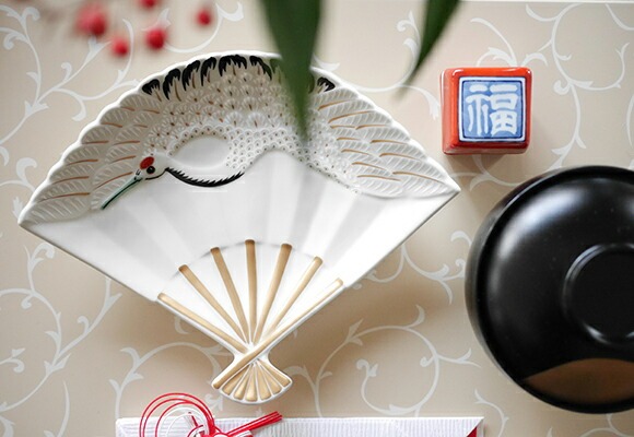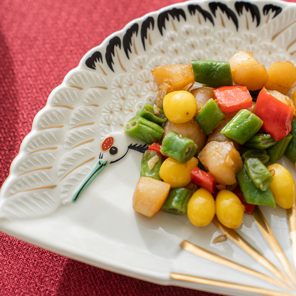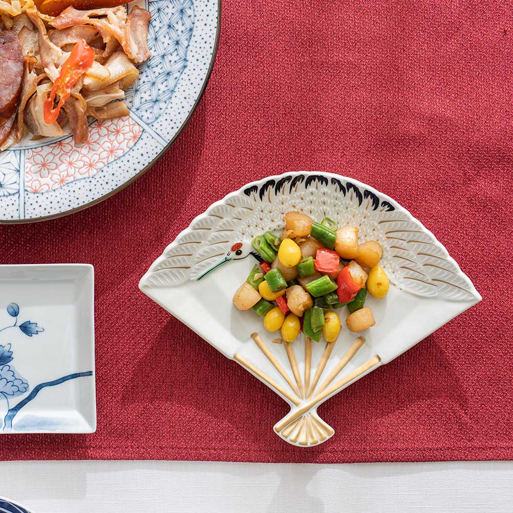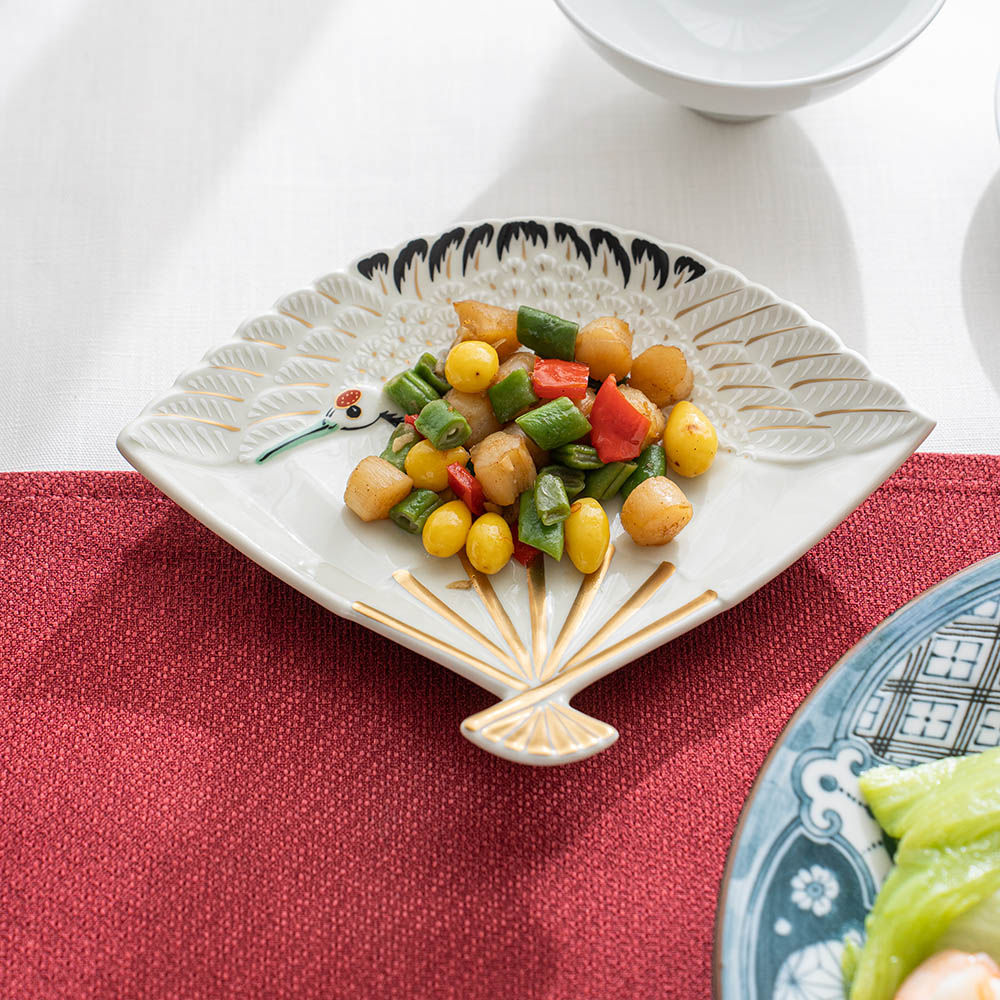 這款「扇鶴」造型盤以展開的扇面為造型,線條優雅、份量剛好,特別適合用來盛裝前菜、小菜、漬物或和風冷盤。器皿表面以細緻的羽紋浮雕搭配金彩描線,低調的白瓷底色襯出節慶的華麗感;扇面一隅點綴鶴的圖樣,寓意吉祥長壽,擺上桌就有儀式感。