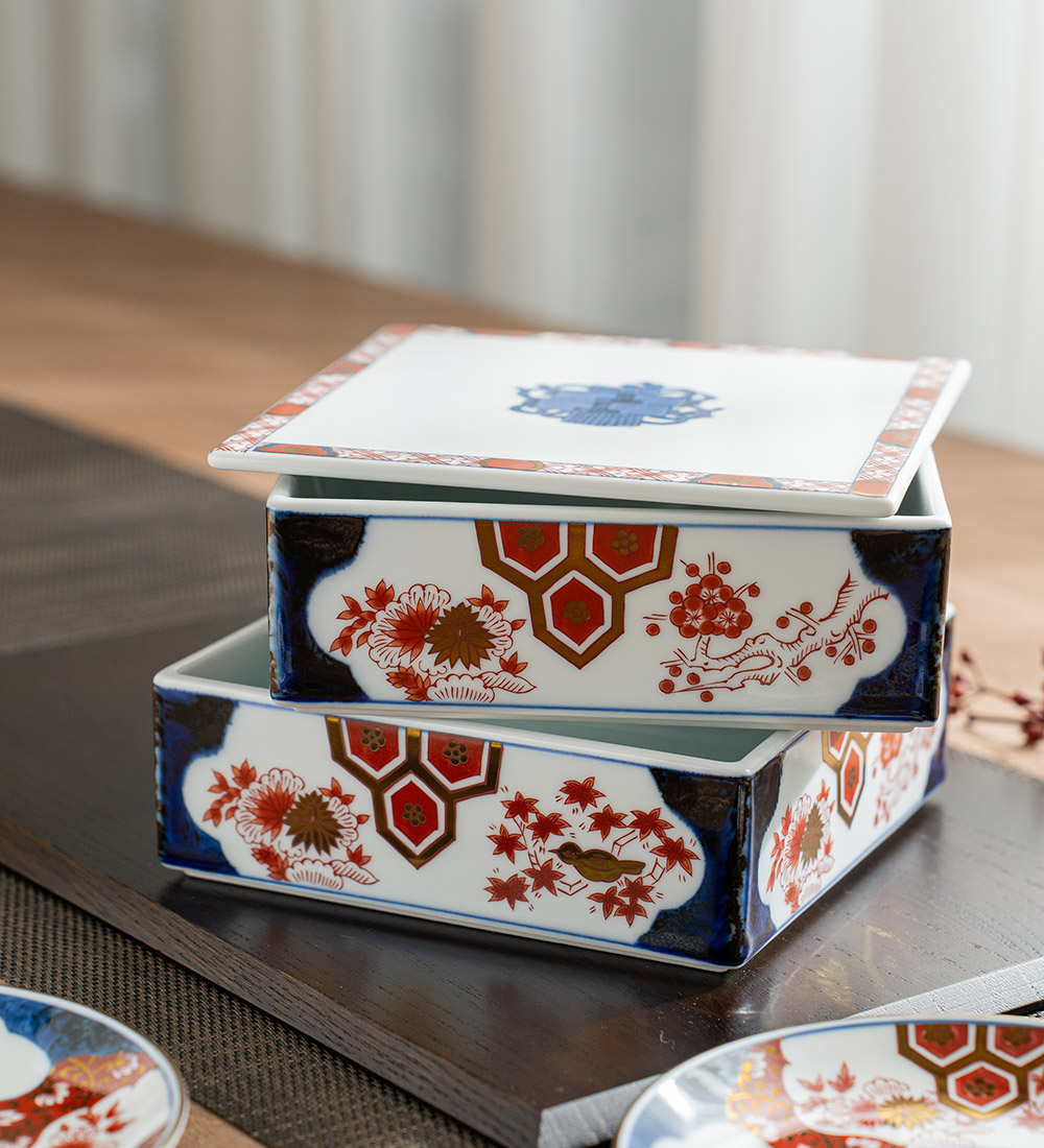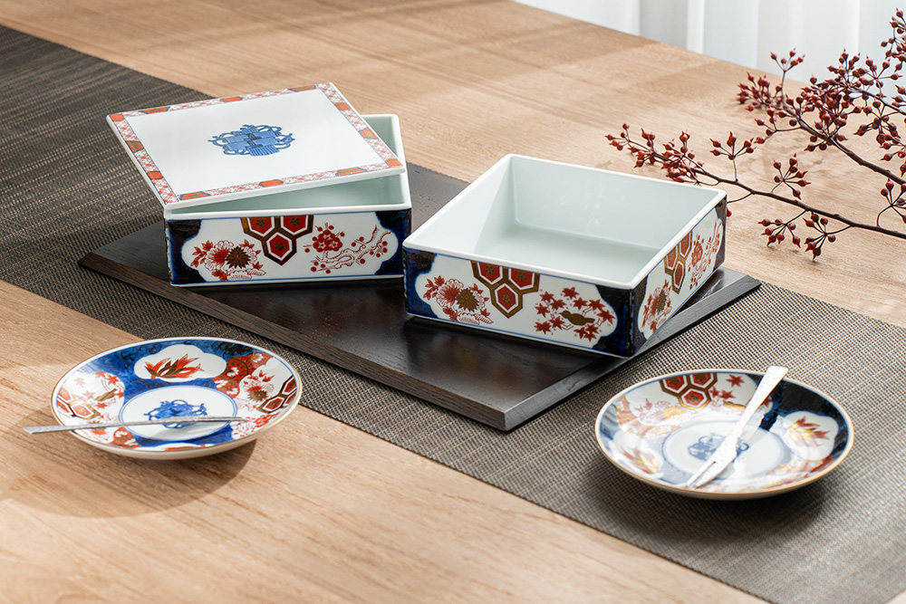新彌左衛門窯系列,是將傳統的彌左衛門窯圖紋,透過減少色彩的數量並加入優雅設計,呈現出具現代感的全新伊萬里圖紋。四君子梅、菊、蘭、竹四種植物,一直是象徵高雅尊貴的吉祥圖紋,職人們以金彩及紅藍釉彩手繪出的雅緻畫面,帶來華麗而時尚的餐桌風情,也希望能豐富使用者的心靈及品味生活。