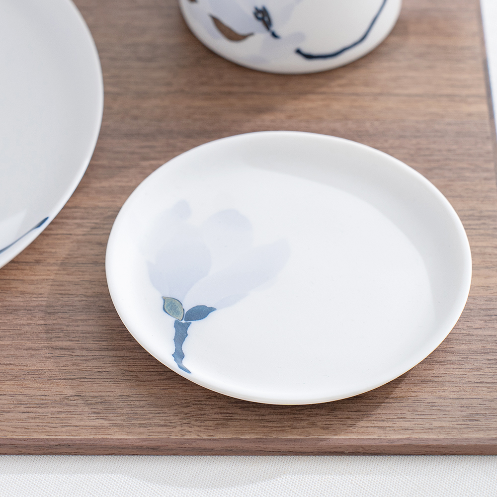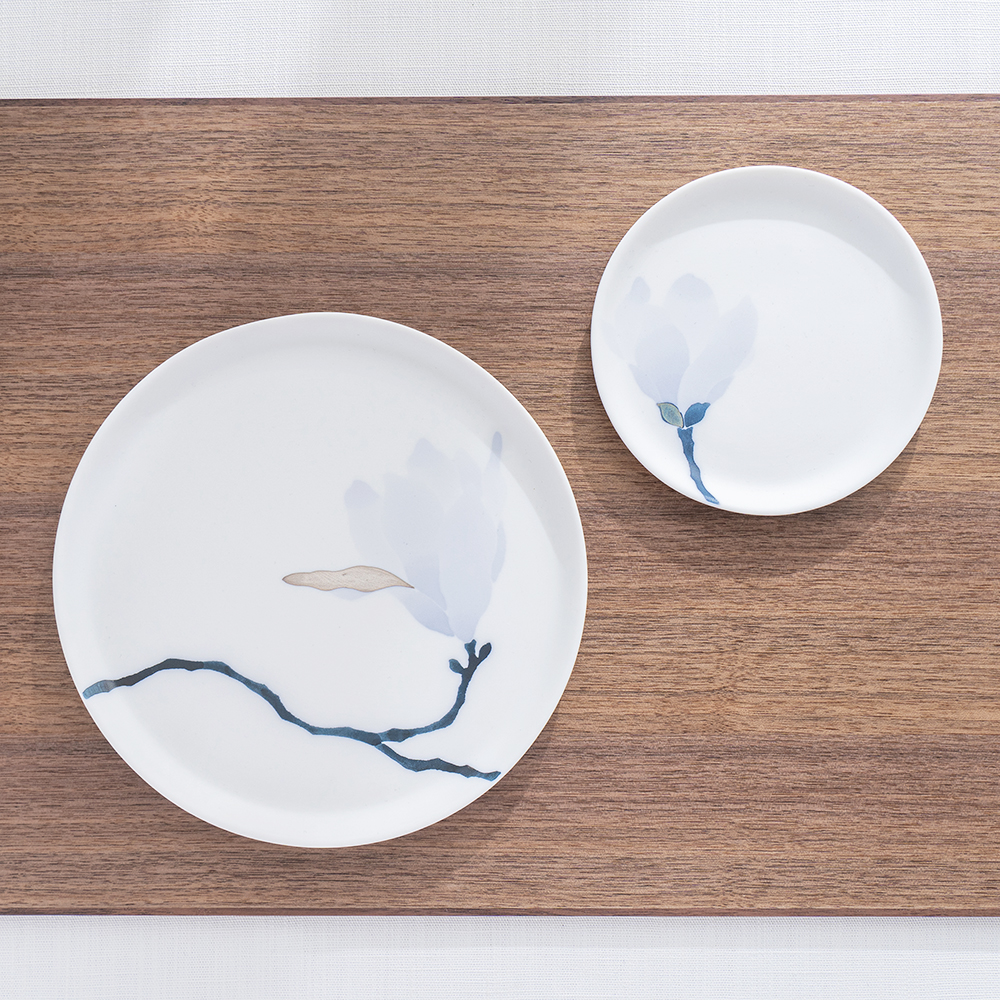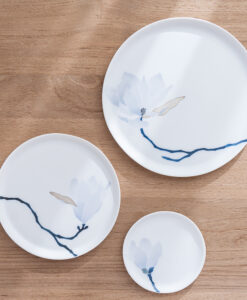 系列商品,依序為木蓮花銀彩圓盤 (大),木蓮花銀彩圓盤 (中),木蓮花銀彩圓盤 (小)