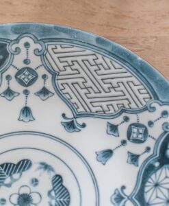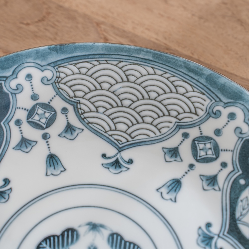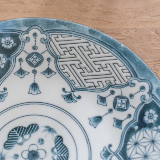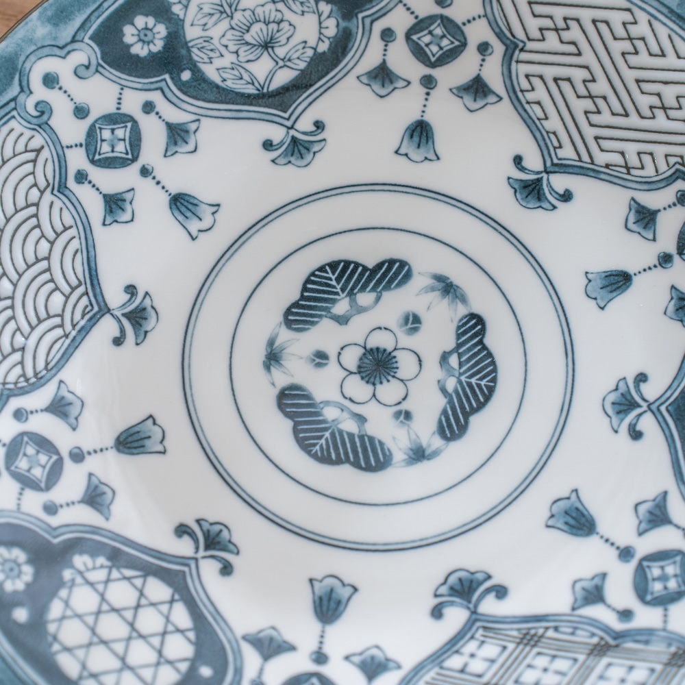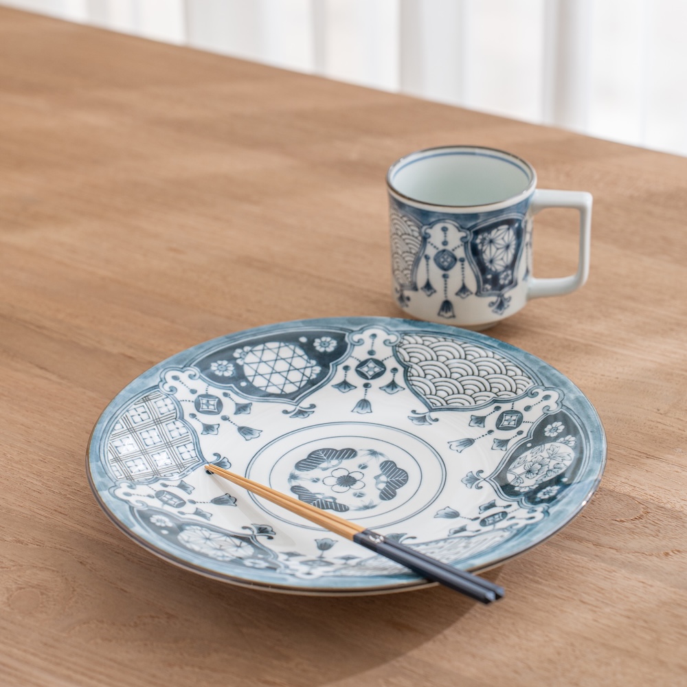 這款大盤延續日本傳統紋樣的細緻之美,屬於以吉兆與幸運象徵構成的高雅「祥瑞系列」。盤面以經典的 瓔珞紋 為主題——象徵連綿不絕的幸福、富足與庇佑。細膩的染付藍色線條勾勒於純白瓷面之上,呈現出端正、靜謐又富含文化深度的風格。