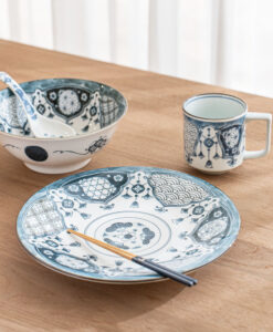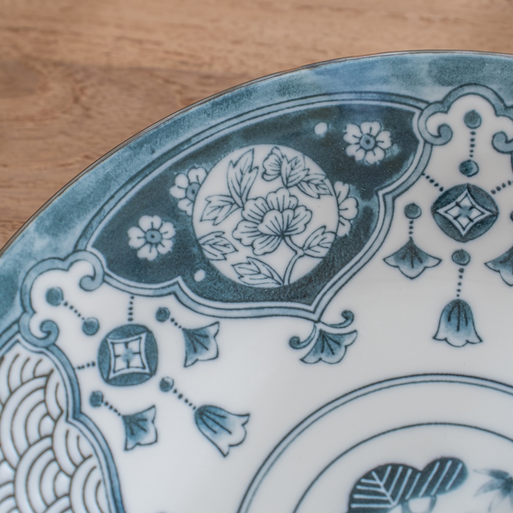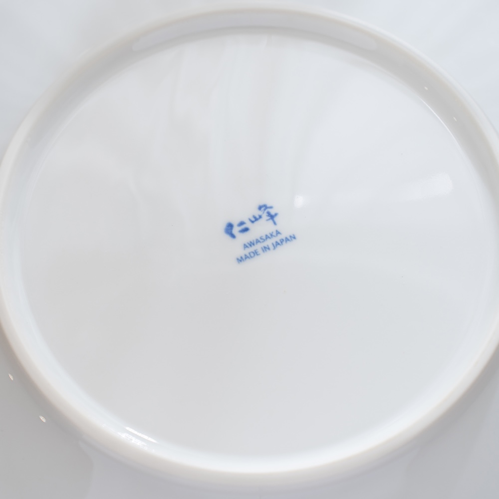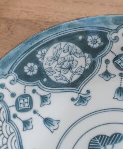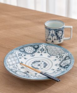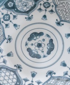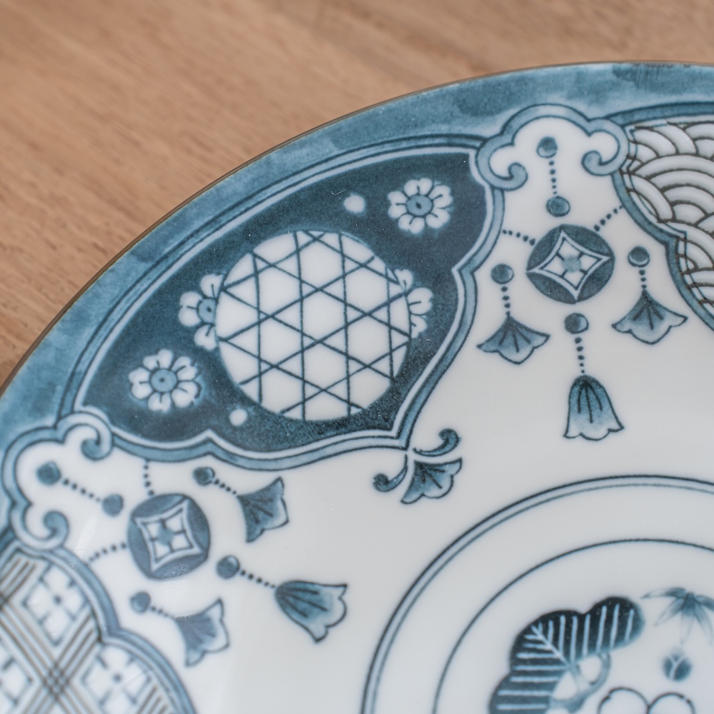 這款大盤延續日本傳統紋樣的細緻之美,屬於以吉兆與幸運象徵構成的高雅「祥瑞系列」。盤面以經典的 瓔珞紋 為主題——象徵連綿不絕的幸福、富足與庇佑。細膩的染付藍色線條勾勒於純白瓷面之上,呈現出端正、靜謐又富含文化深度的風格。