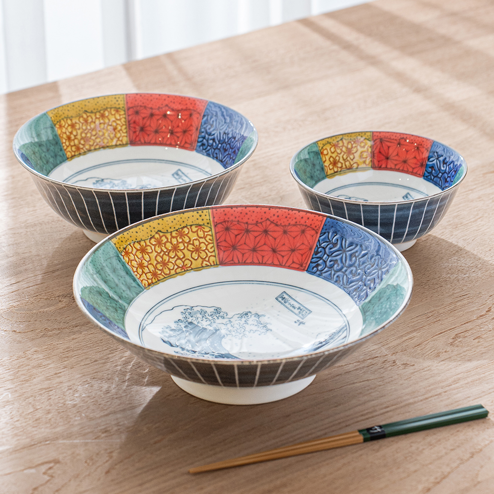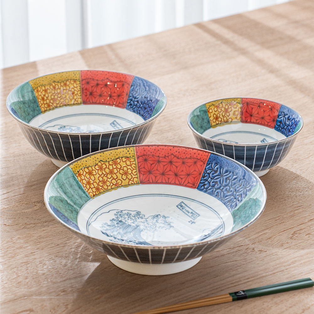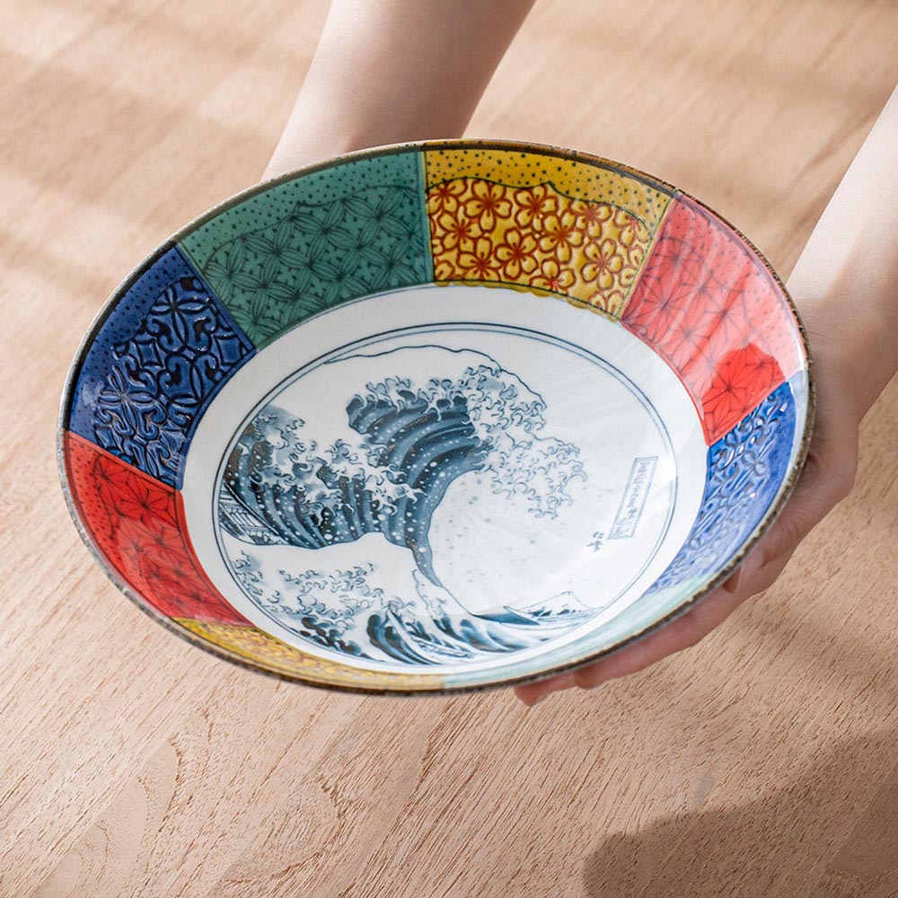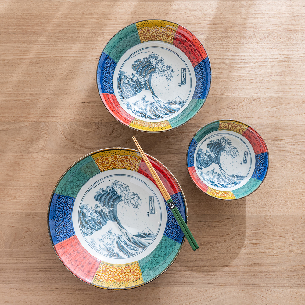 大缽具有充裕的深度與容量,使用情境多元,適合拉麵、烏龍麵、義大利麵等麵類料理,也能完美盛裝咖哩、燉菜、魚類燉煮等湯汁豐富的菜色。其實用性與美感兼具,是日常與宴客皆可登場的萬用之選。盛裝份量十足的料理時,壯闊的北齋波圖樣能與之相互輝映,使餐桌華麗而大器;搭配精緻料理時,大缽又能成為低調優雅的舞台,完美烘托料理細節。