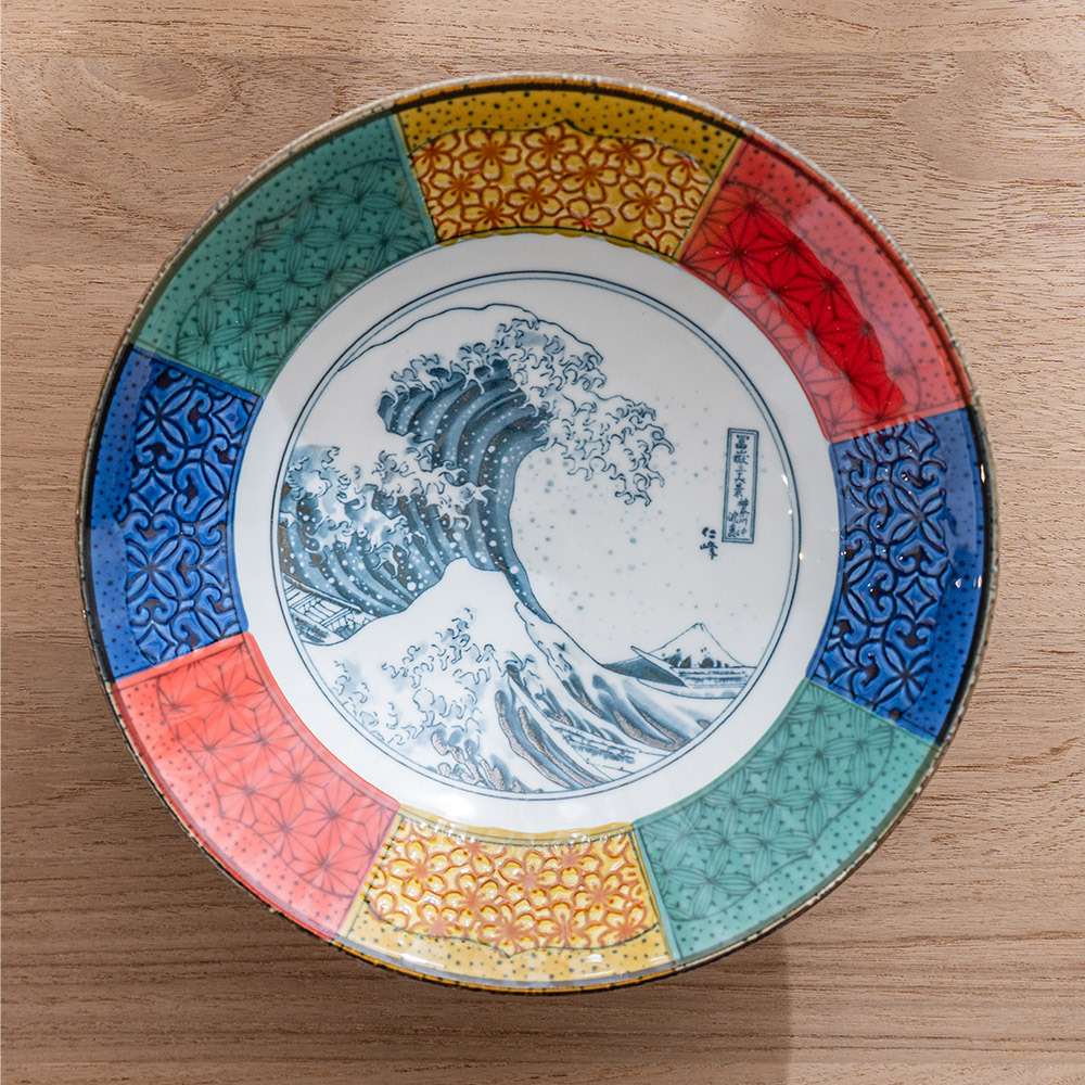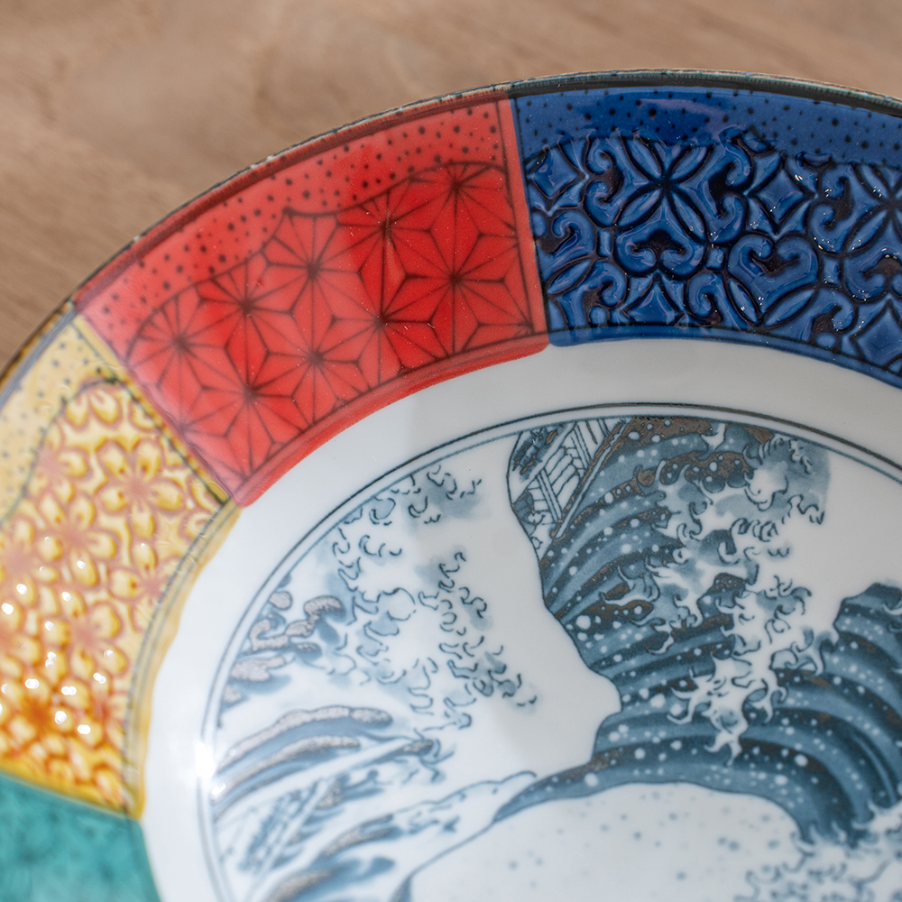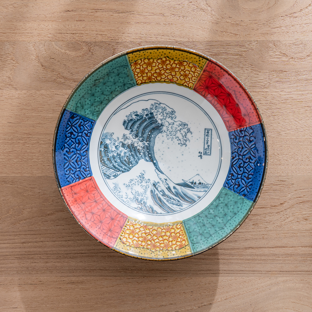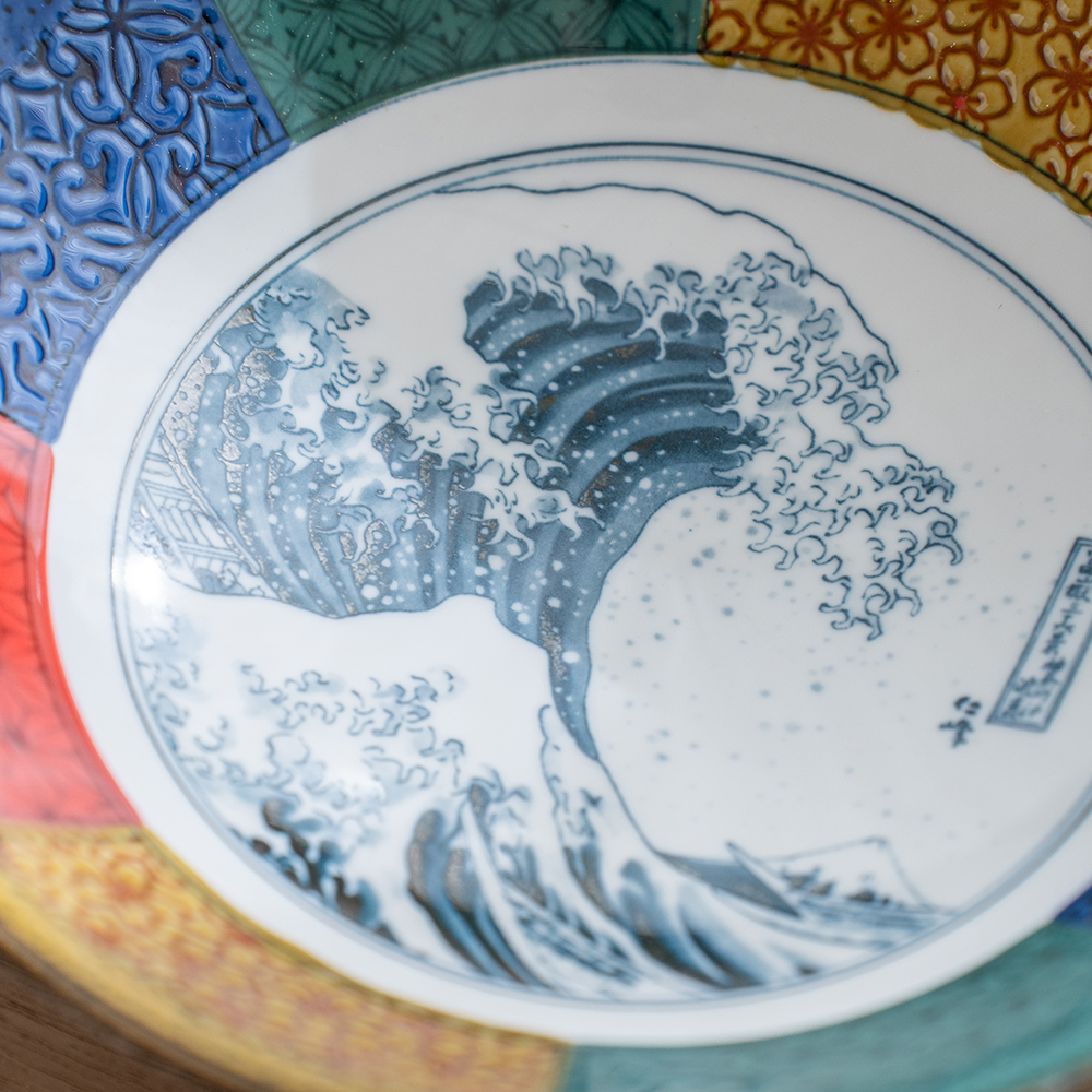 這款大缽延續日本傳統紋樣的雅致之美,是象徵吉兆與福運的「祥瑞」系列。缽心採用葛飾北齋的世界名作 「北齋波」—氣勢磅礴的浪濤與遠方的富士山相互映襯,象徵力量、守護與繁榮,寓意深遠。