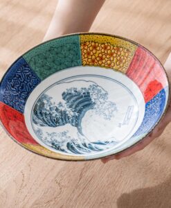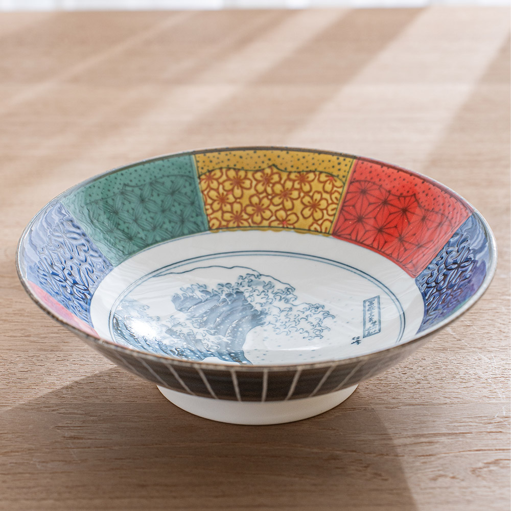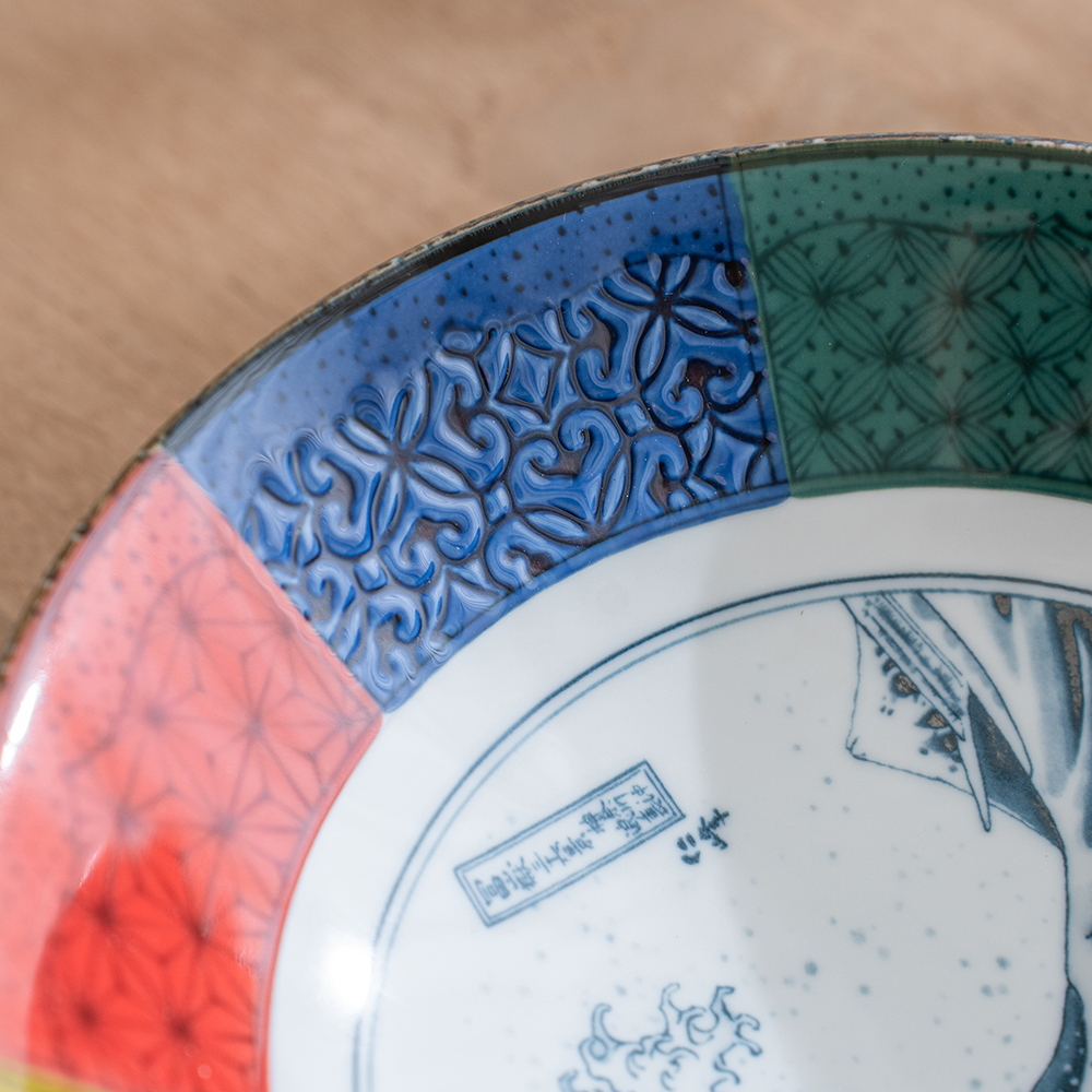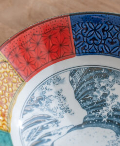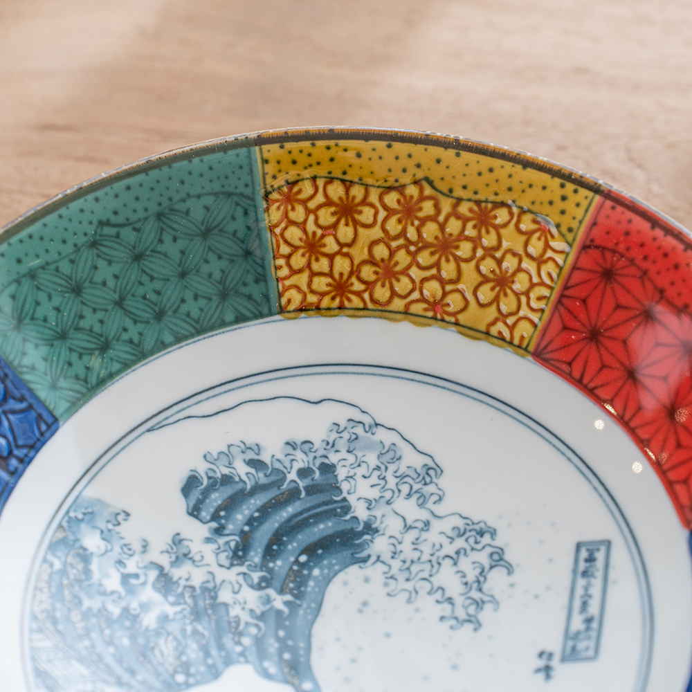 這款大缽延續日本傳統紋樣的雅致之美,是象徵吉兆與福運的「祥瑞」系列。缽心採用葛飾北齋的世界名作 「北齋波」—氣勢磅礴的浪濤與遠方的富士山相互映襯,象徵力量、守護與繁榮,寓意深遠。