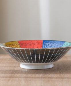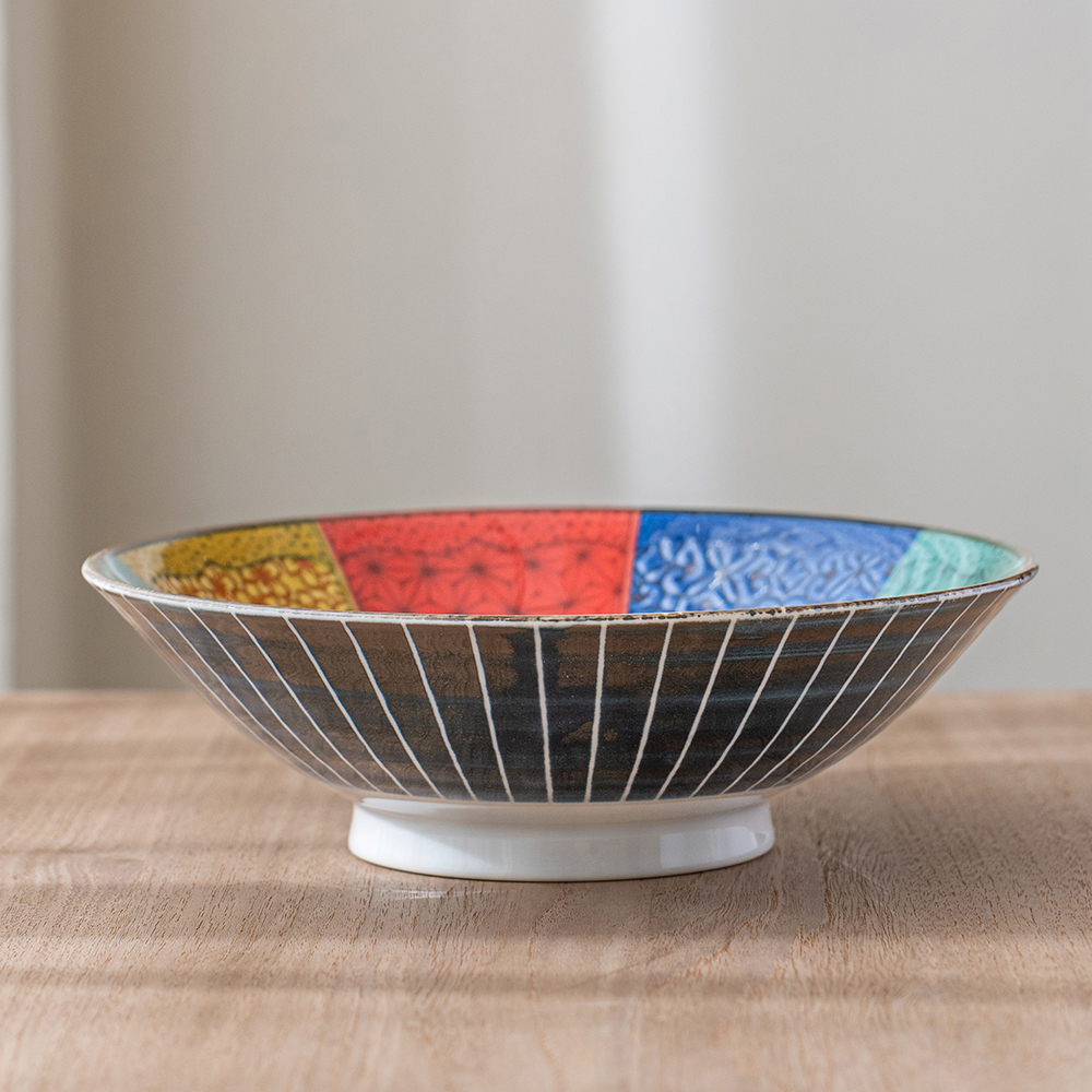 外側彩繪以紅、綠、黃、紫與深藍為基調,呈現被稱為 「九谷五彩」的經典日本傳統色繪。鮮明而華麗的色調層層交織,形成燦爛、富麗的視覺效果,讓這只器皿本身彷彿一件藝術品般耀眼。