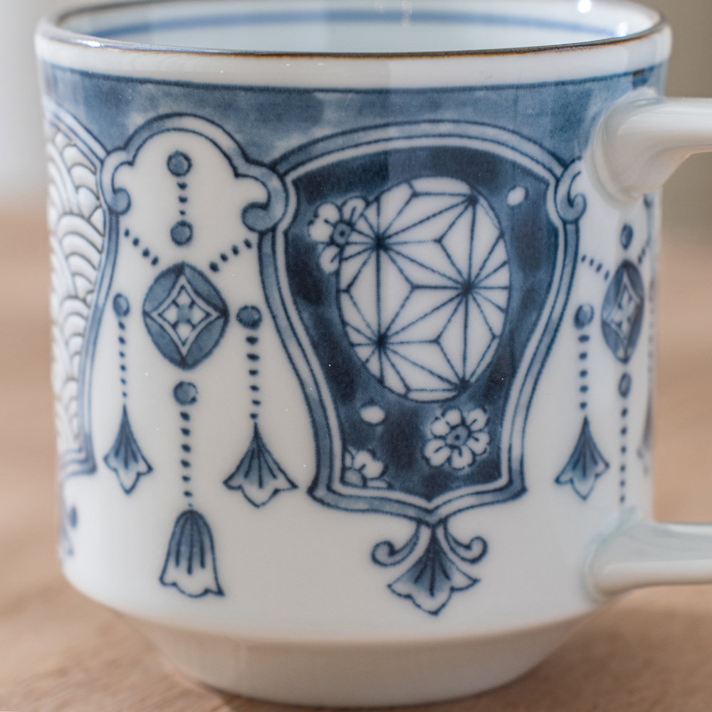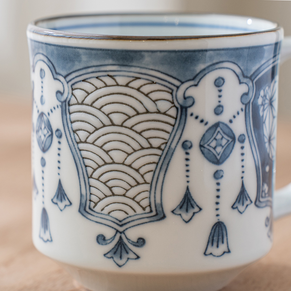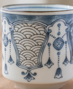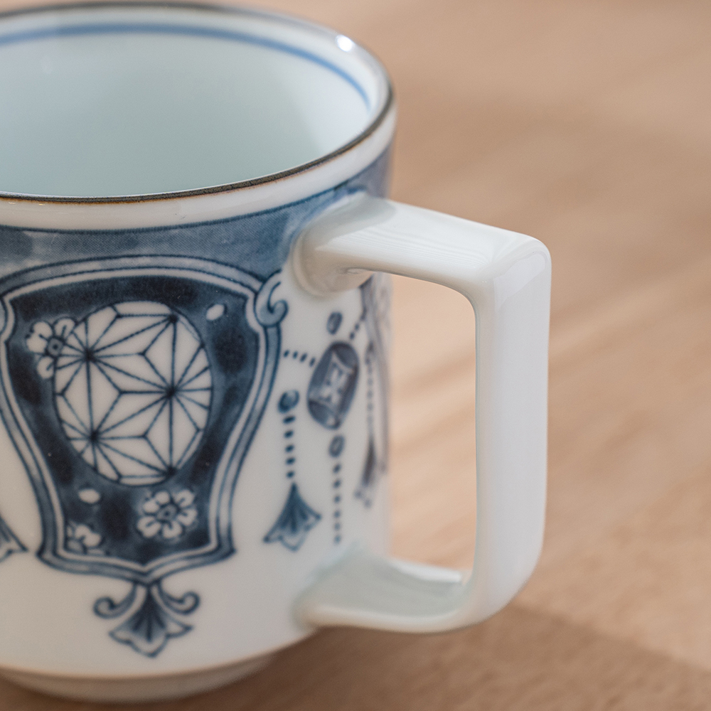 瓔珞紋象徵連綿不斷的幸福、富足與護佑,以細緻的染付藍色線條勾勒於潔白瓷面之上,呈現出端莊、靜謐且富有文化底蘊的風格。藍與白之間的清雅對比,讓日常飲品時光也多了一份沉靜與儀式感。