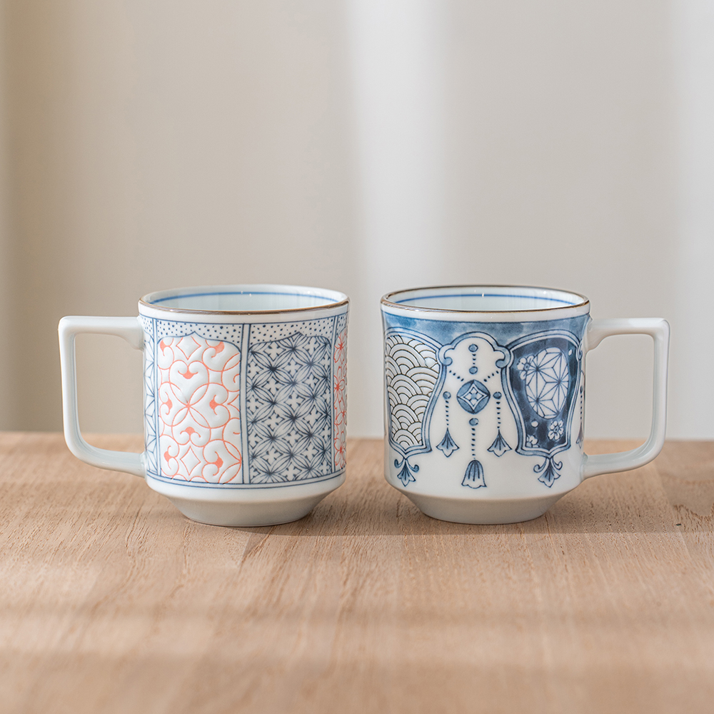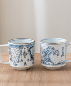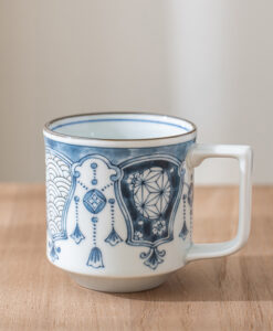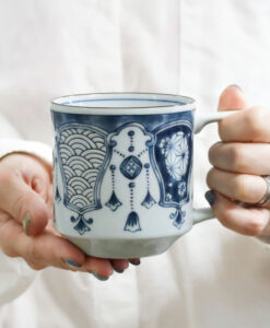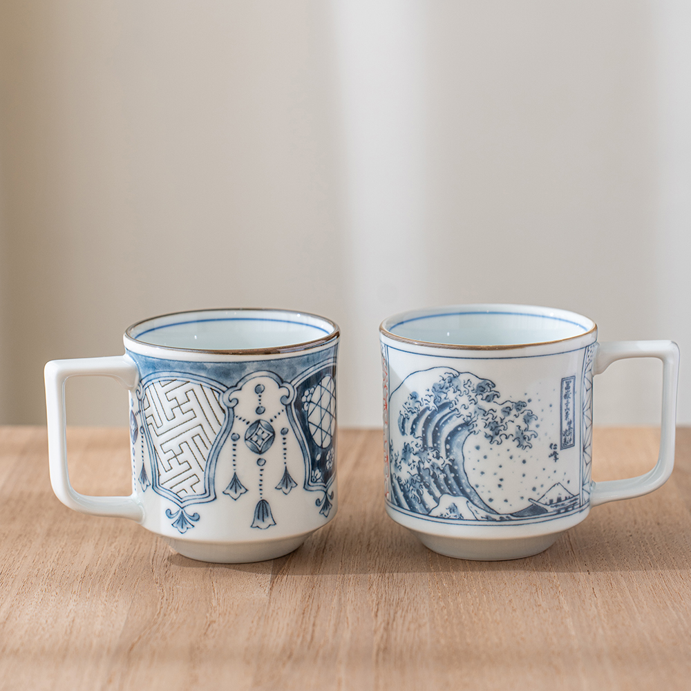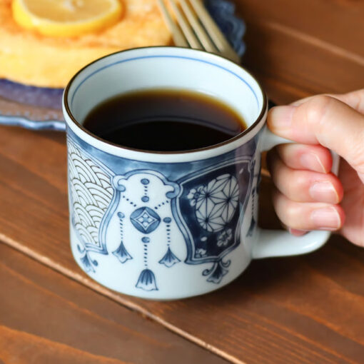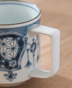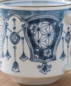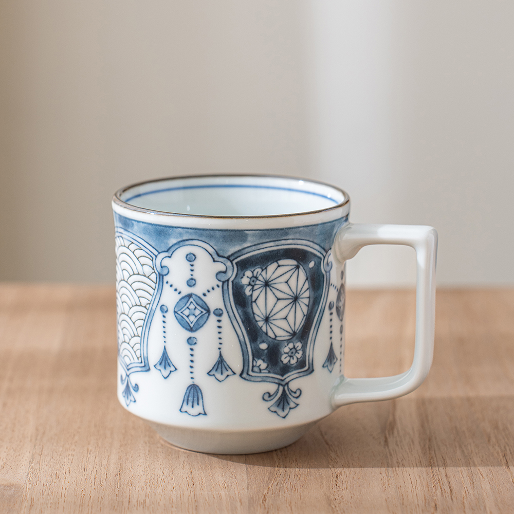 瓔珞紋象徵連綿不斷的幸福、富足與護佑,以細緻的染付藍色線條勾勒於潔白瓷面之上,呈現出端莊、靜謐且富有文化底蘊的風格。藍與白之間的清雅對比,讓日常飲品時光也多了一份沉靜與儀式感。