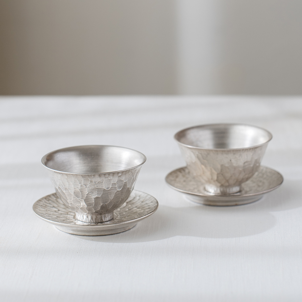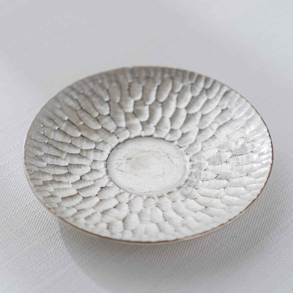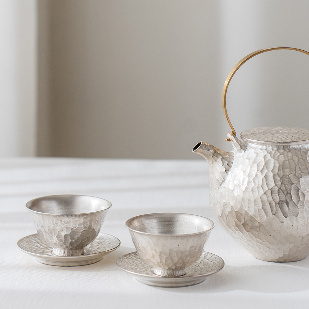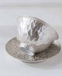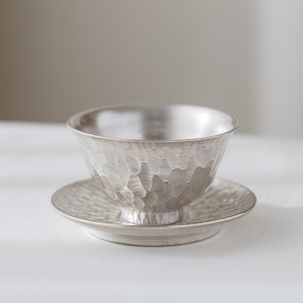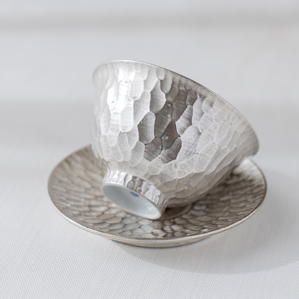 彷手敲槌目紋路的設計風格茶杯,獨有的銀彩釉料,營造出如銀壺般的華麗,卻有著瓷器的圓潤及溫暖手感,在任何空間中都能創造出品味風情。銀彩釉料會隨著使用時間,因氧化而色澤逐漸變成淡金色或棕金色,可體驗欣賞器皿在不同時間,呈現多樣面貌的樂趣。在氧化變色時,可使用拭銀布擦拭壺身,即可恢復原來的銀彩色澤。