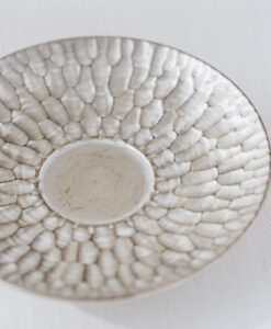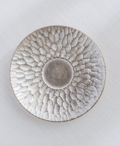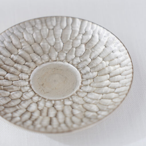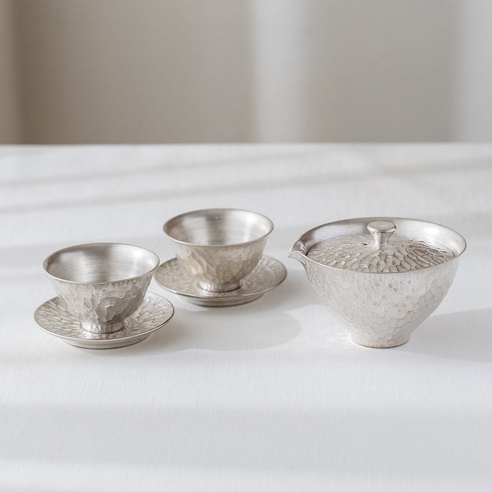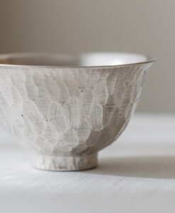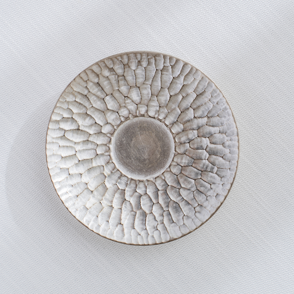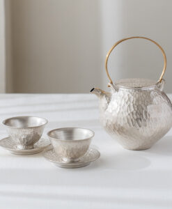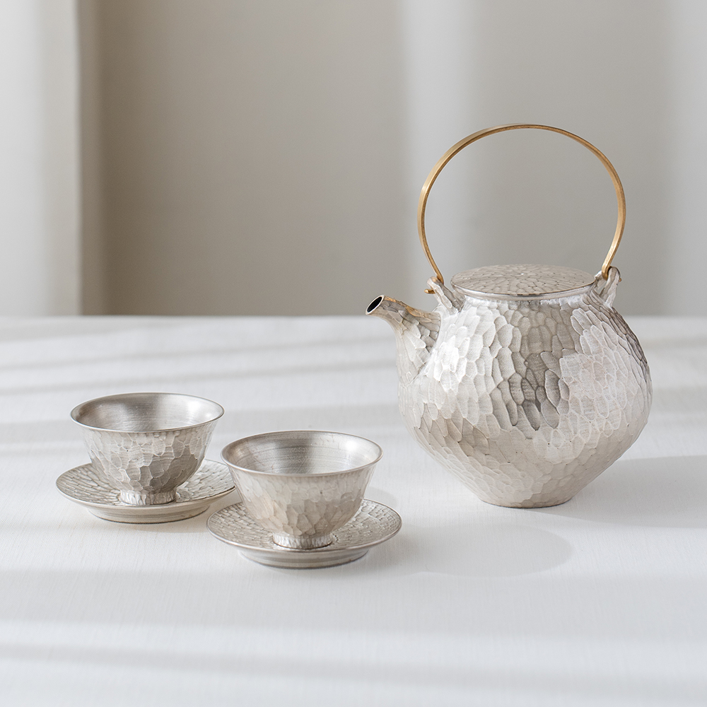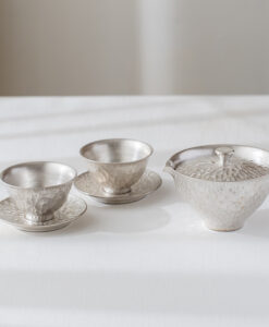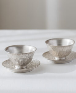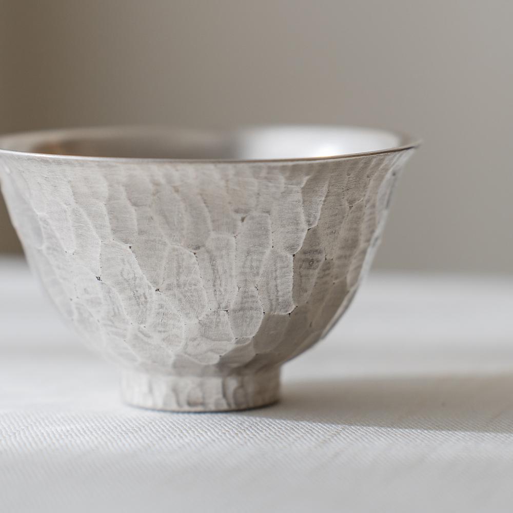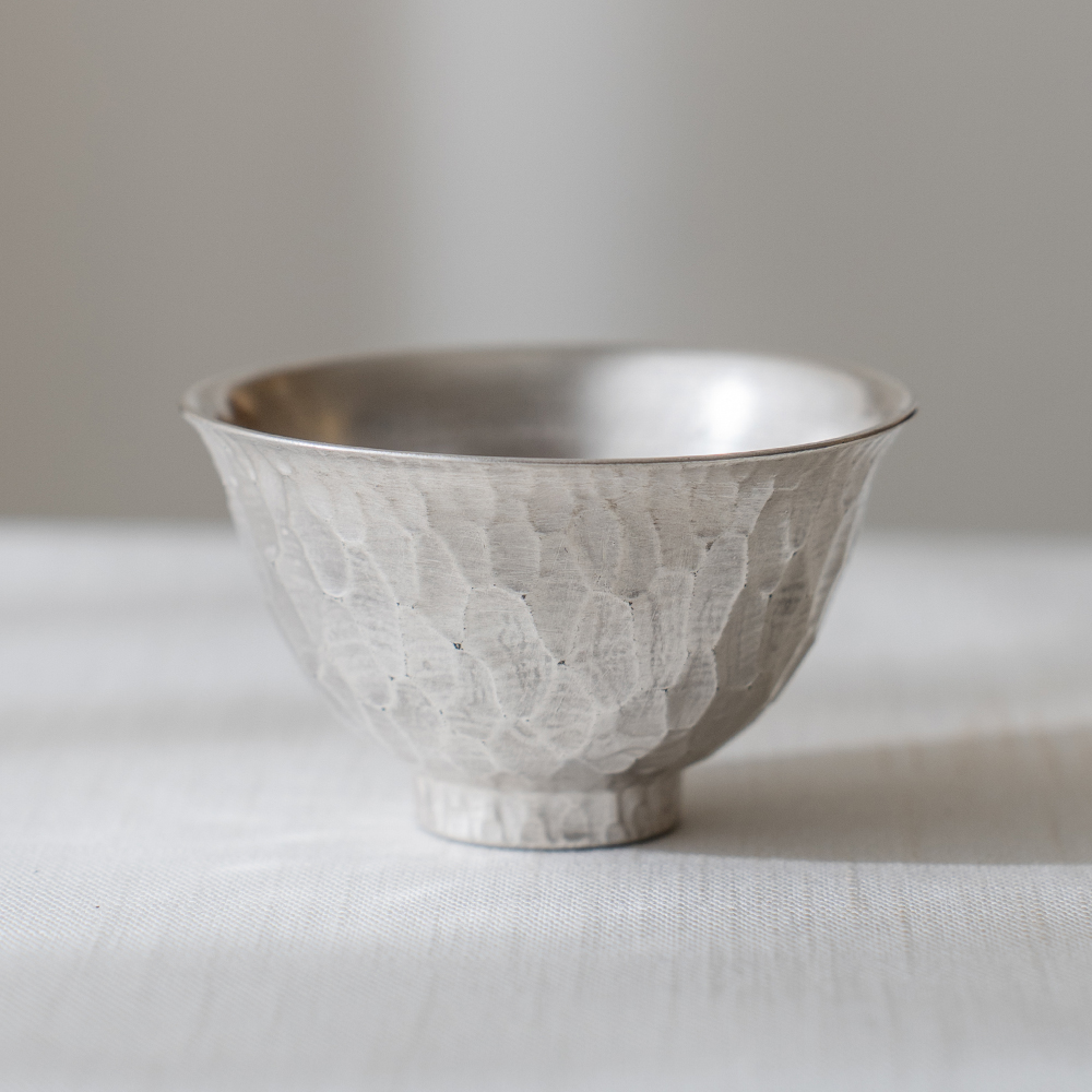 彷手敲槌目紋路的設計風格茶杯,獨有的銀彩釉料,營造出如銀壺般的華麗,卻有著瓷器的圓潤及溫暖手感,在任何空間中都能創造出品味風情。銀彩釉料會隨著使用時間,因氧化而色澤逐漸變成淡金色或棕金色,可體驗欣賞器皿在不同時間,呈現多樣面貌的樂趣。在氧化變色時,可使用拭銀布擦拭壺身,即可恢復原來的銀彩色澤。