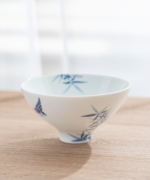 細膩手繪的生動飄逸竹葉,深淺相間的葉片,風雅有型,搭配雙飛的雀鳥,在碗身的四週。飯碗的每一面,都有著讓人陶醉的風景。