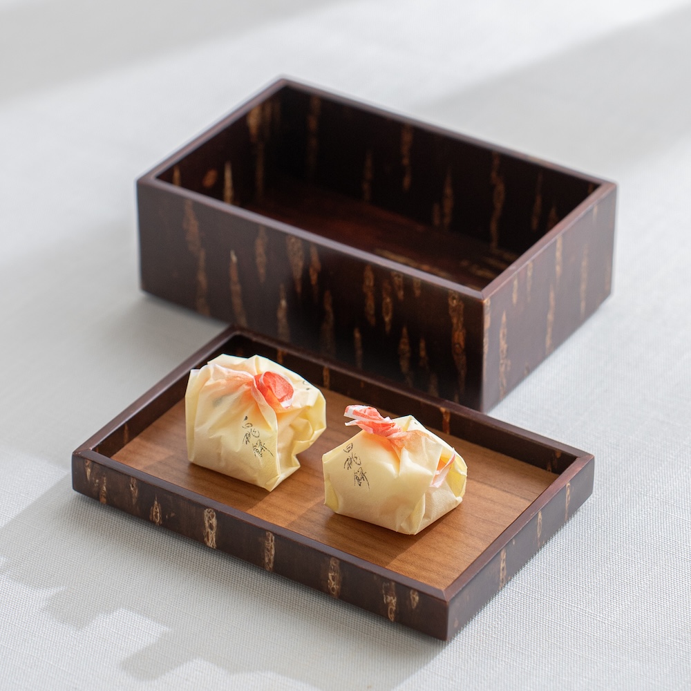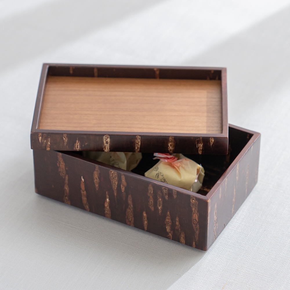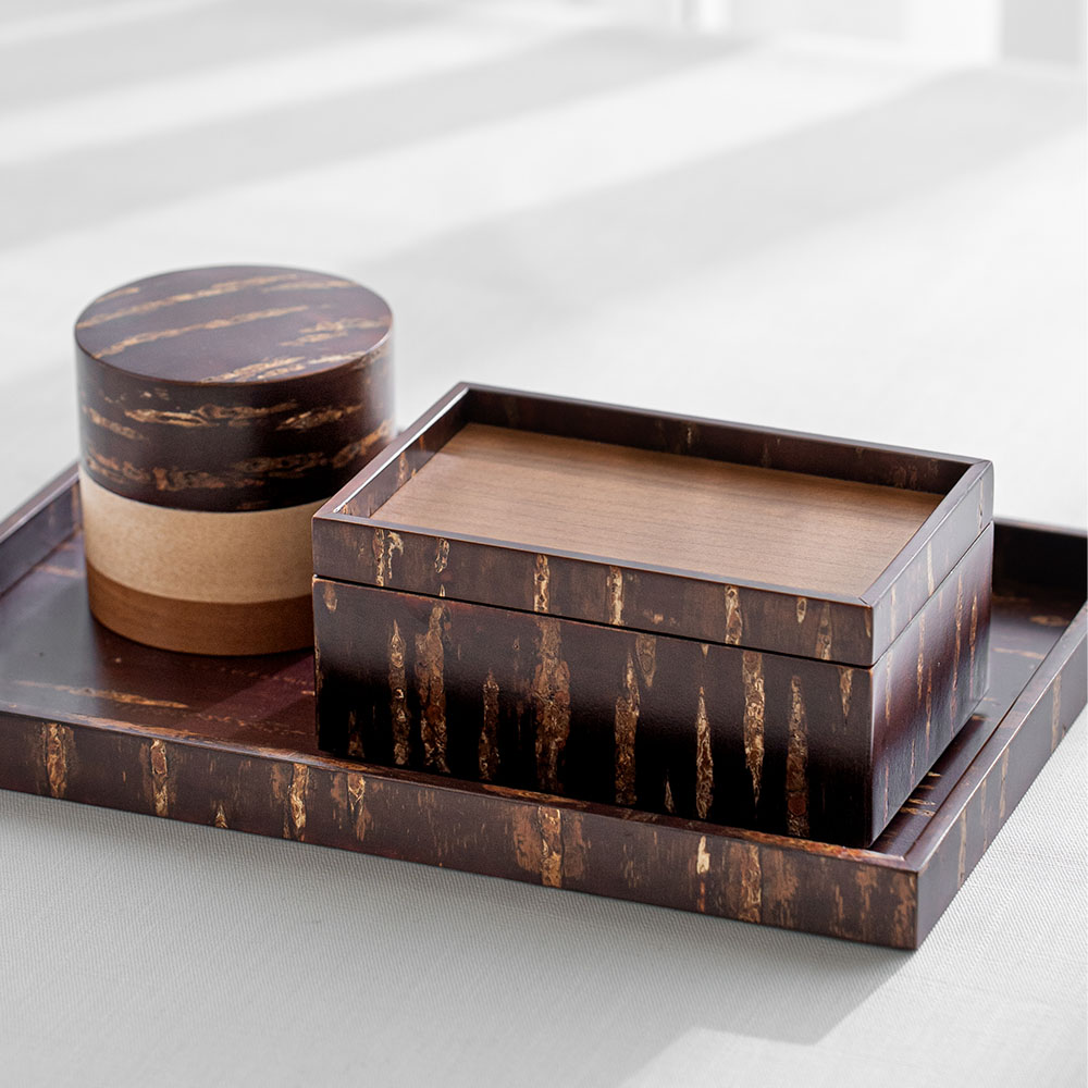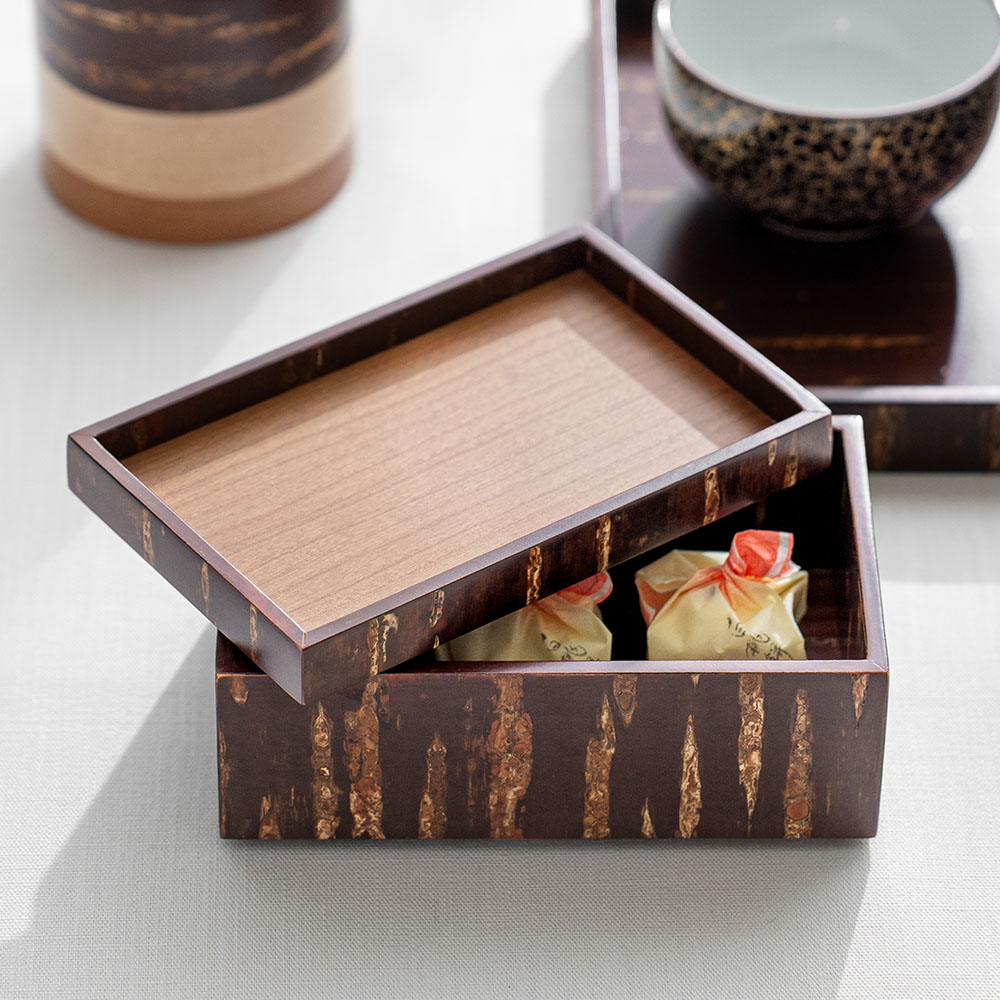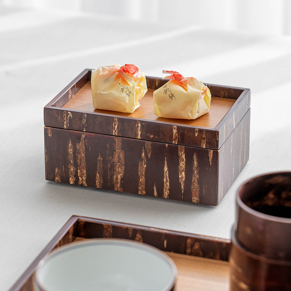 工匠使用特殊工法,利用高溫加熱技術將山櫻皮完美貼合在木底材上,進而形塑出自然紋路之箱體。點心盒的盒身及盒蓋都能做為擺放點心使用,是午茶時的造型器物。商品也可透過疊放進行收納,為你的午茶餐桌增添風味。