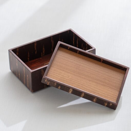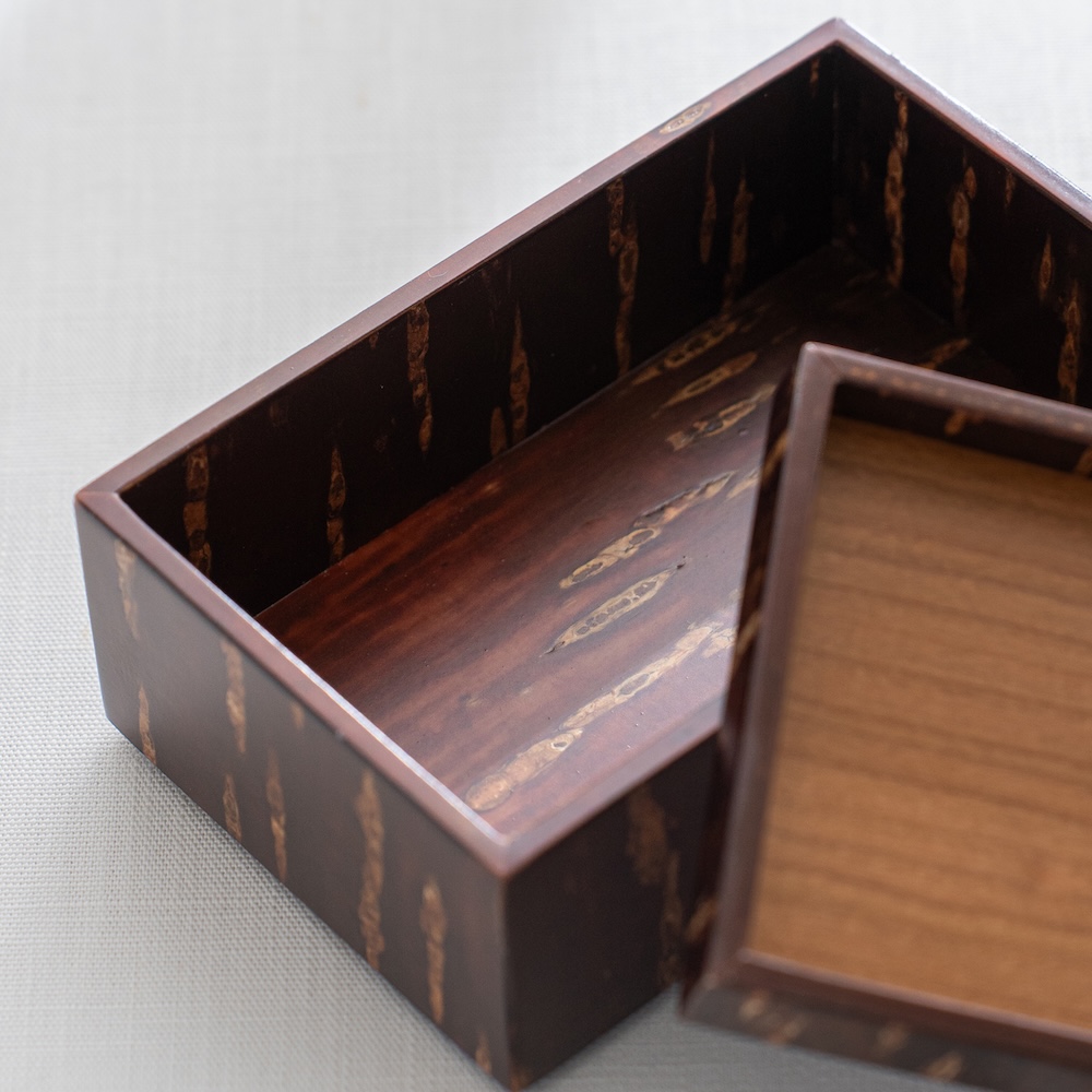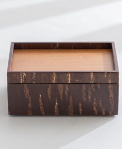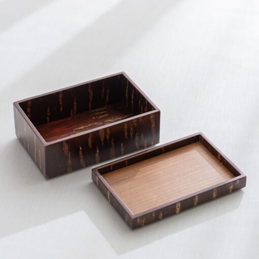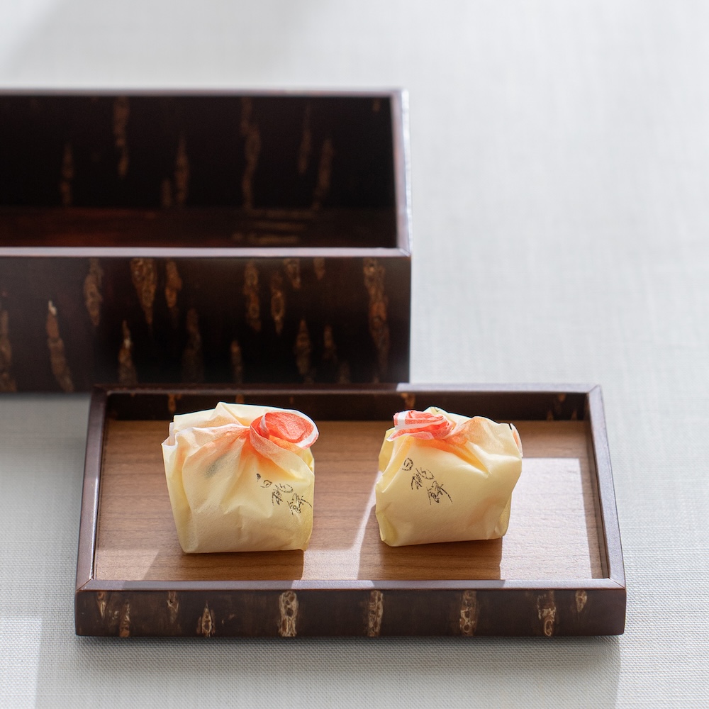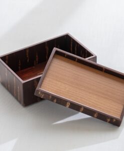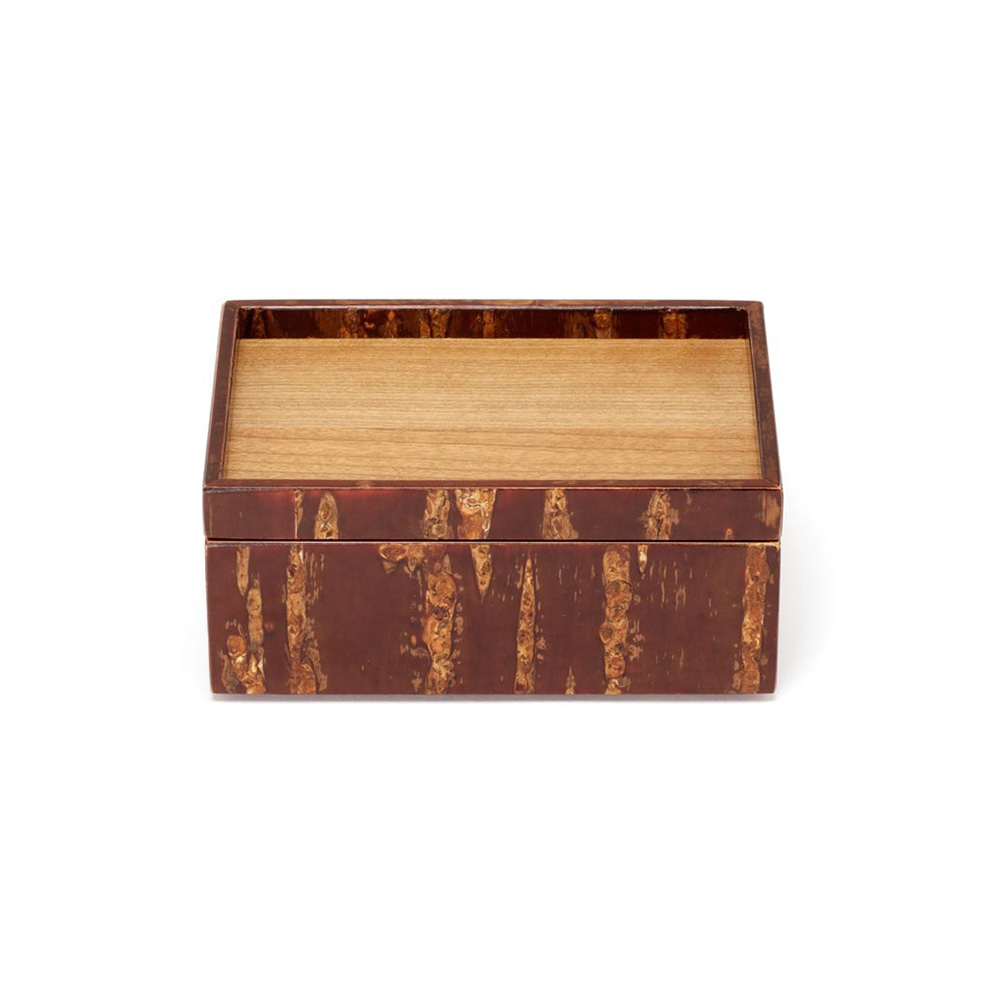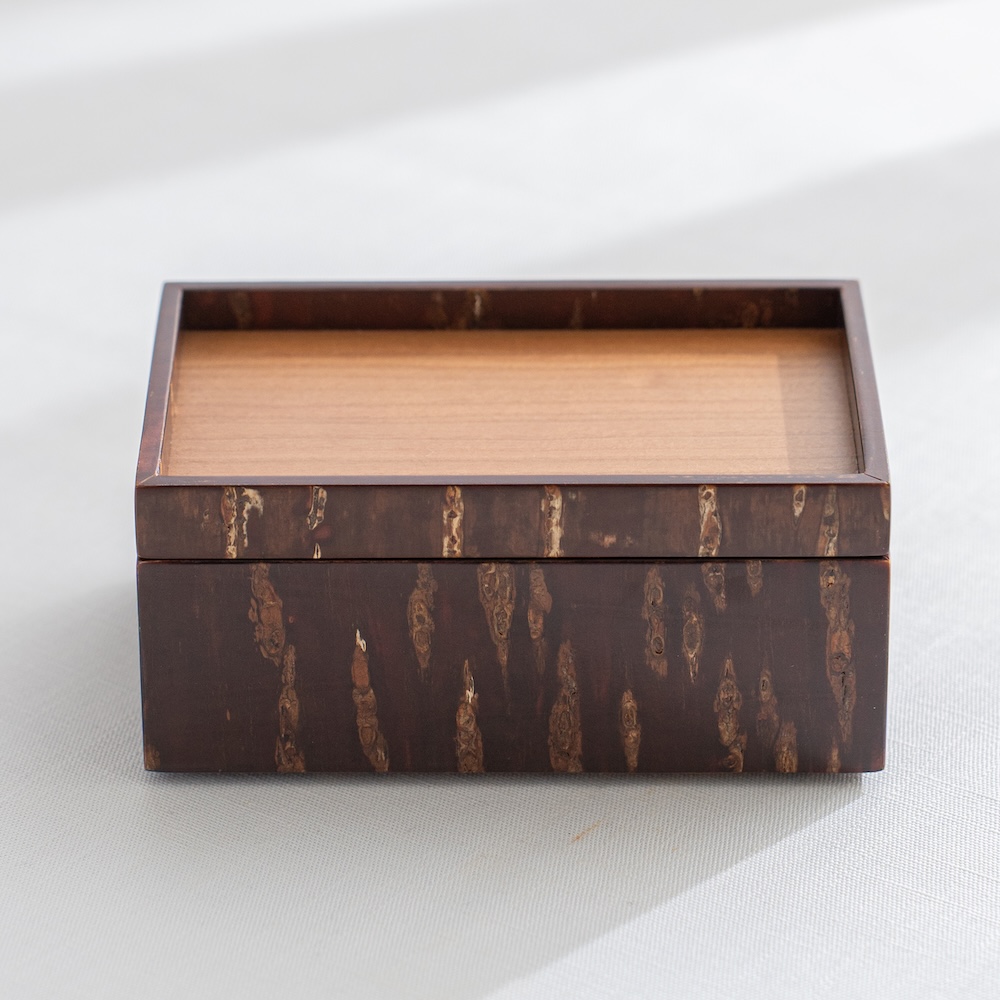 工匠使用特殊工法,利用高溫加熱技術將山櫻皮完美貼合在木底材上,進而形塑出自然紋路之箱體。點心盒的盒身及盒蓋都能做為擺放點心使用,是午茶時的造型器物。商品也可透過疊放進行收納,為你的午茶餐桌增添風味。