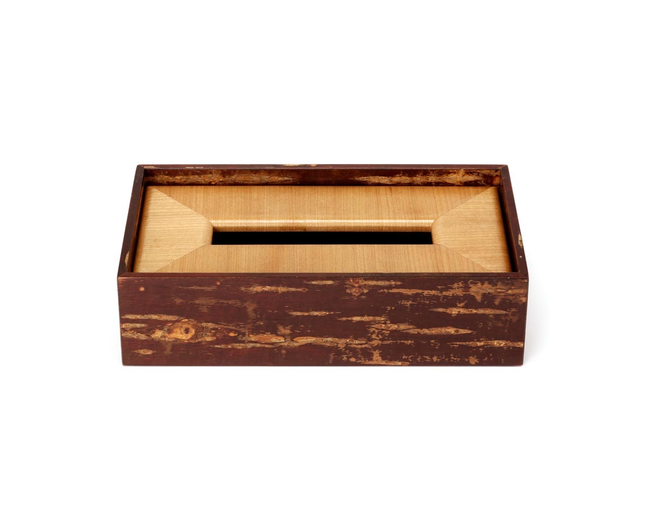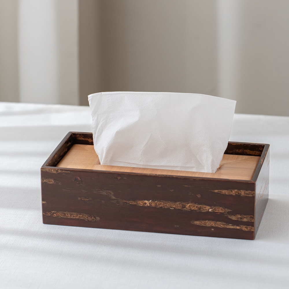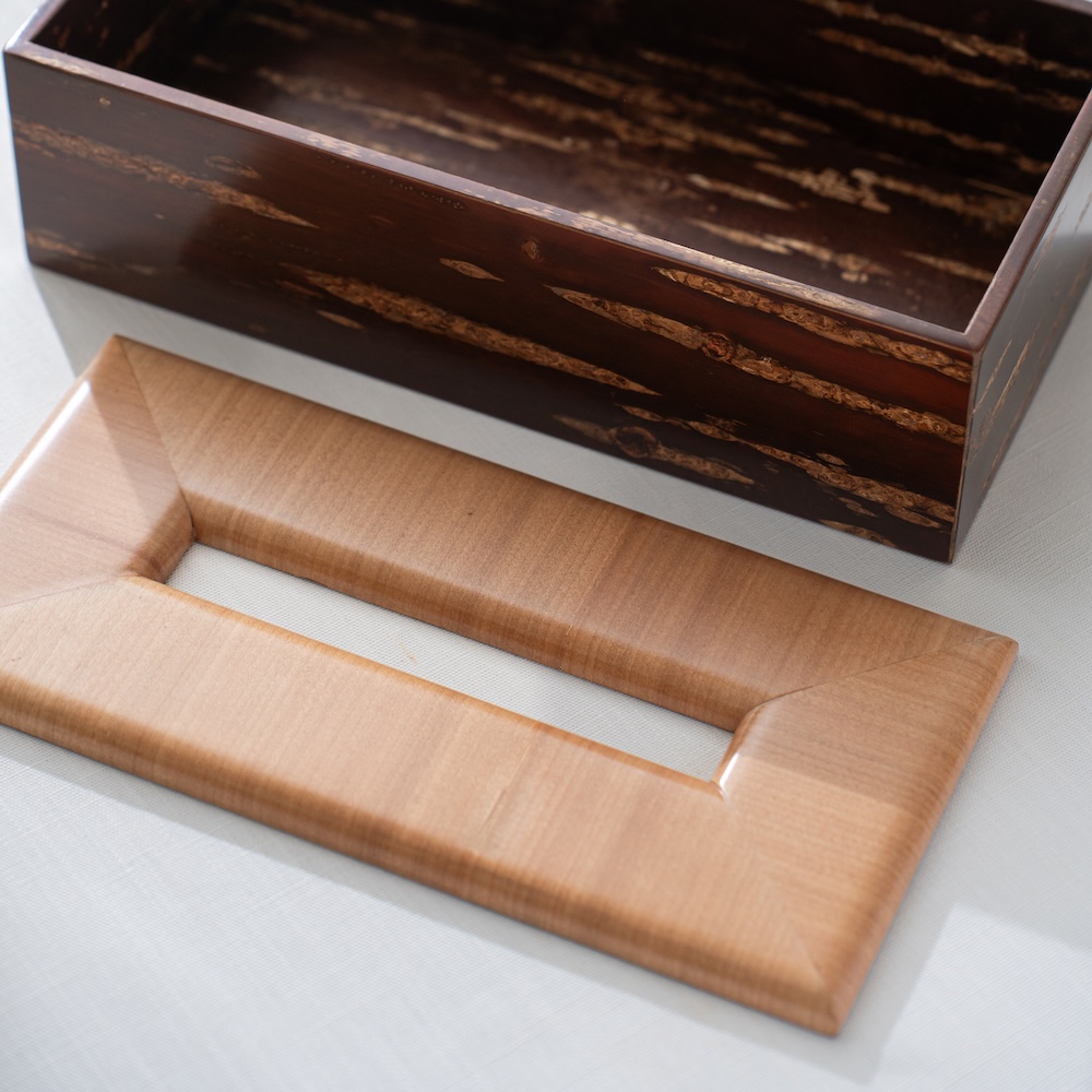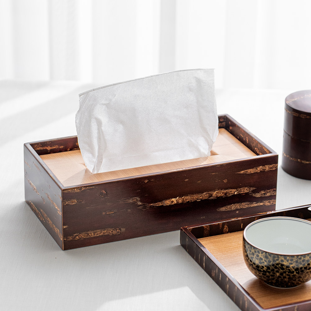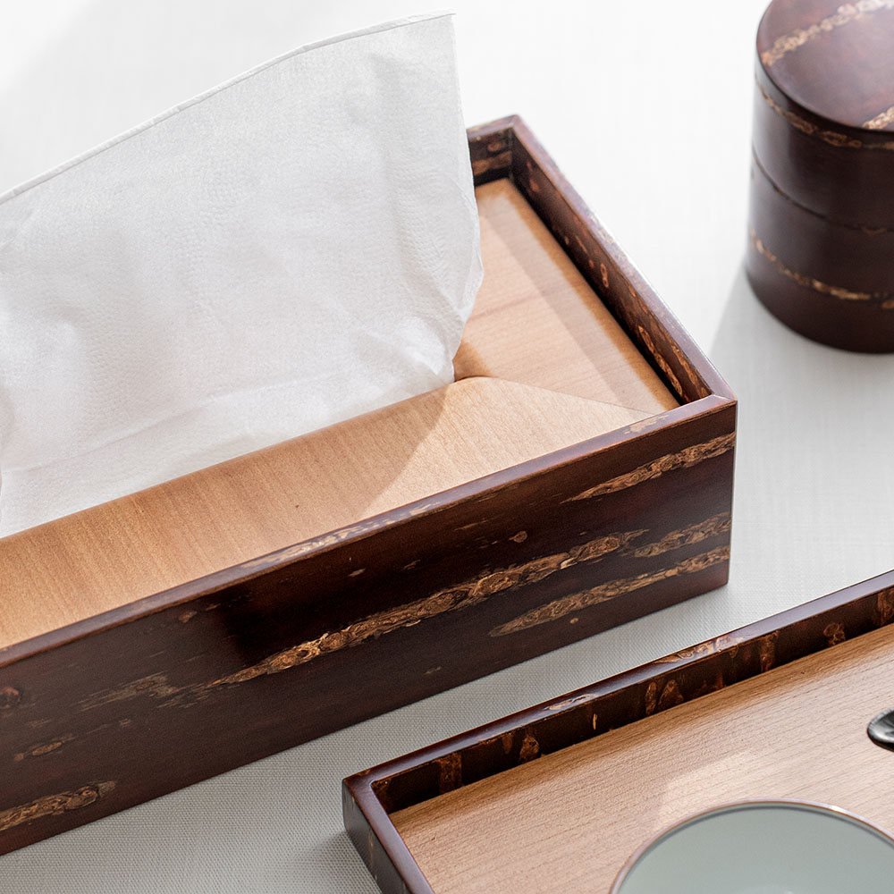 工匠使用特殊工法,利用高溫加熱技術將山櫻皮完美貼合木盒上,只需打開面紙盒上蓋即可放入面紙,為日常生活增添日式風采。
