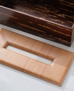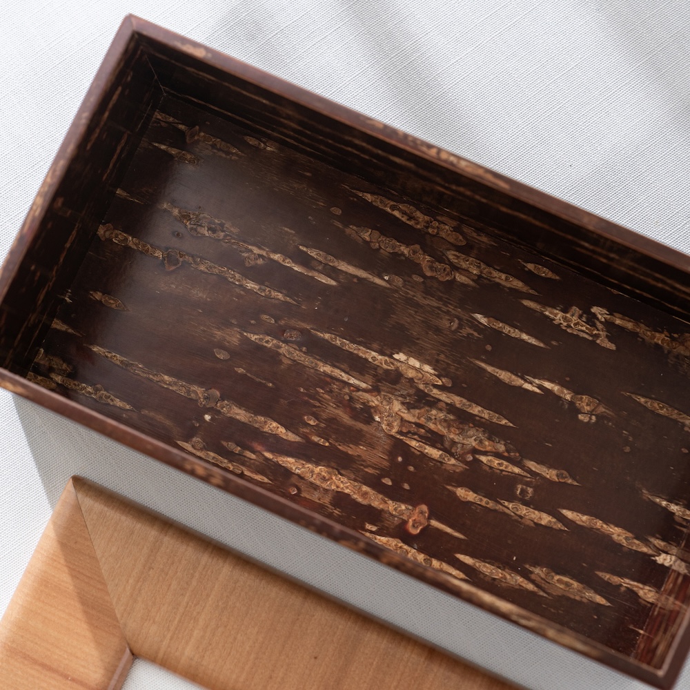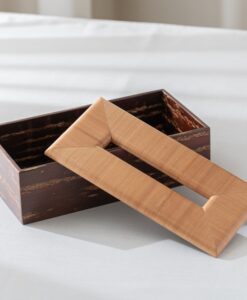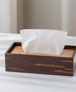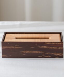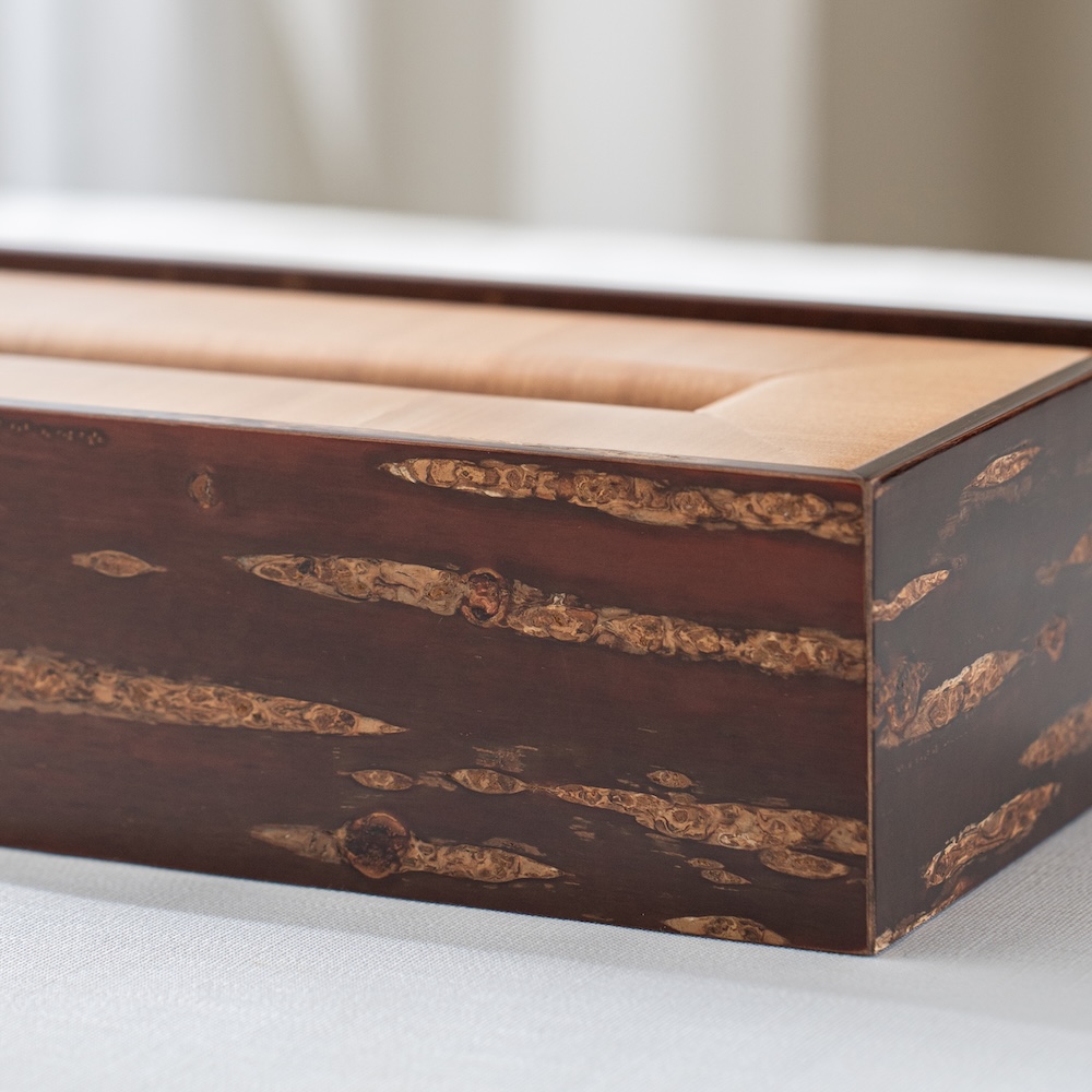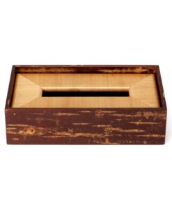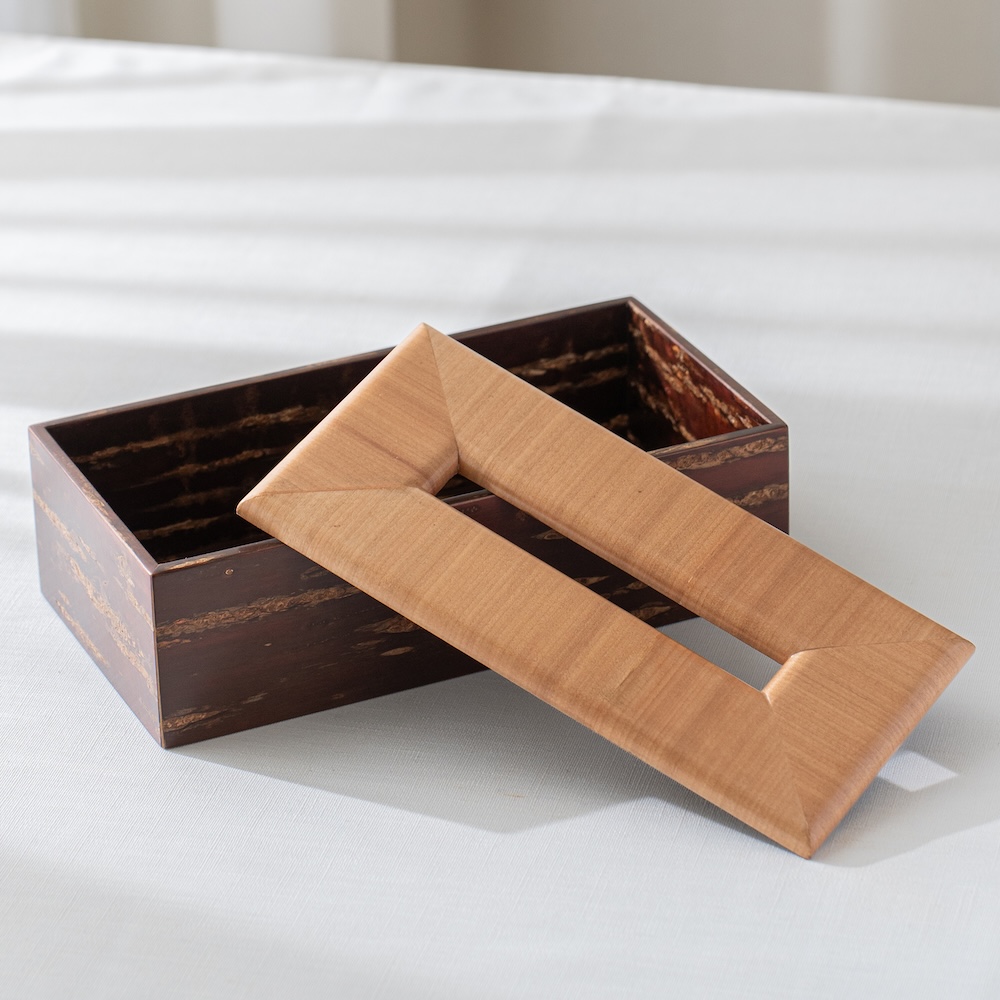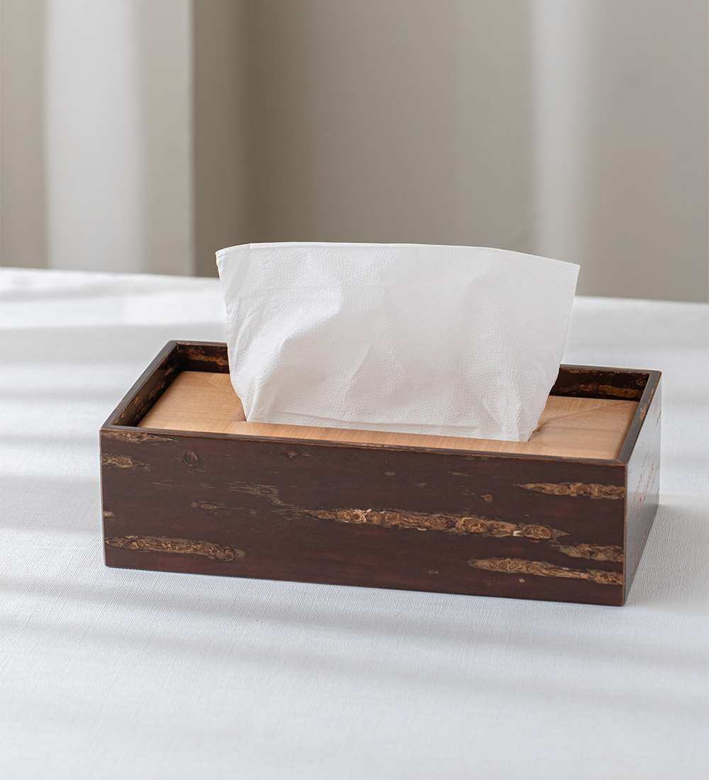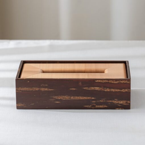 工匠使用特殊工法,利用高溫加熱技術將山櫻皮完美貼合木盒上,只需打開面紙盒上蓋即可放入面紙,為日常生活增添日式風采。