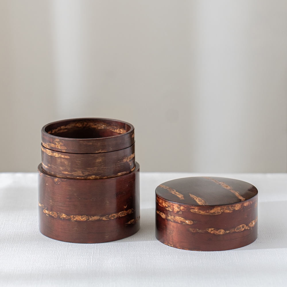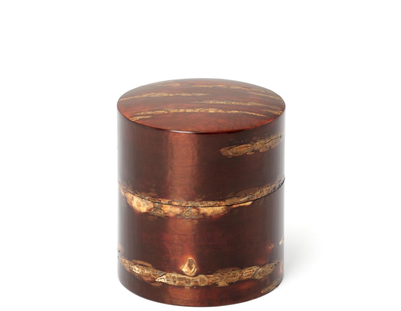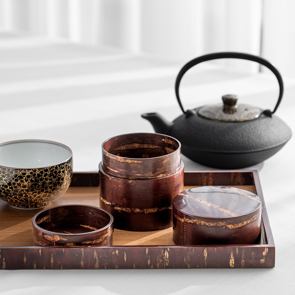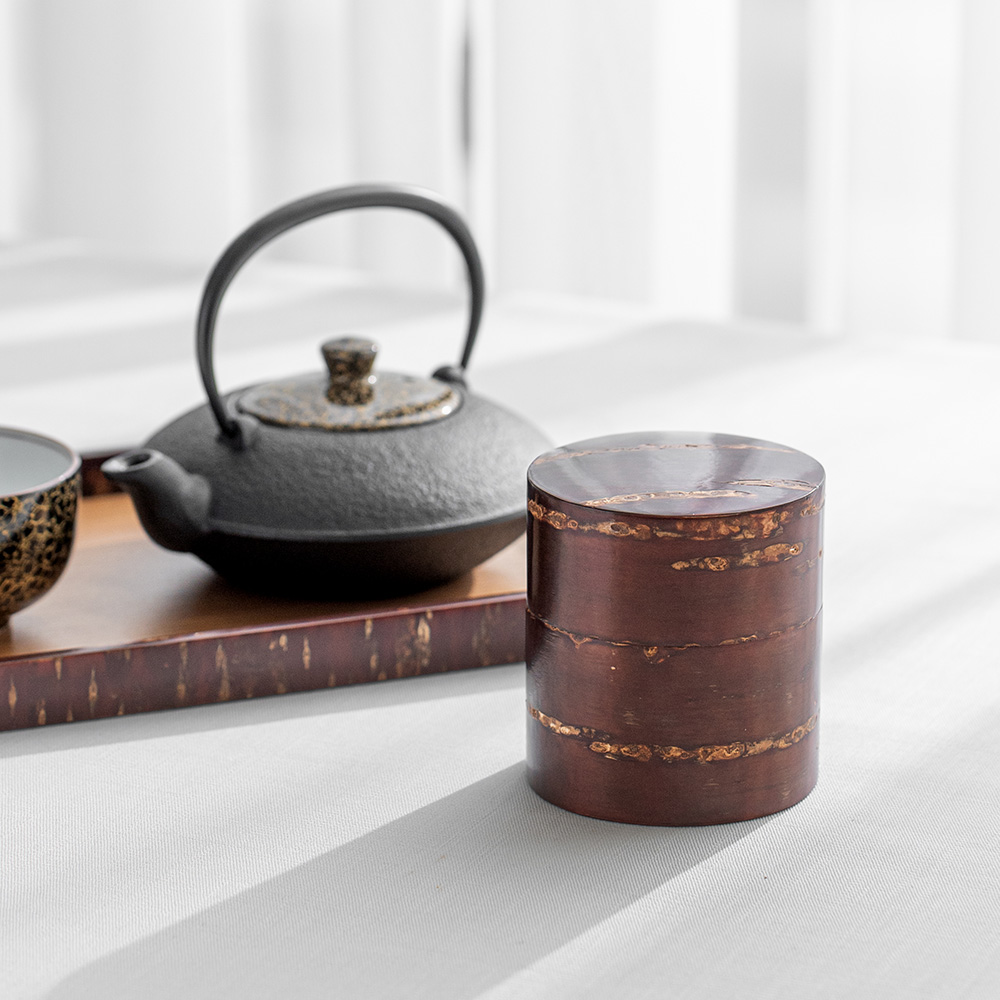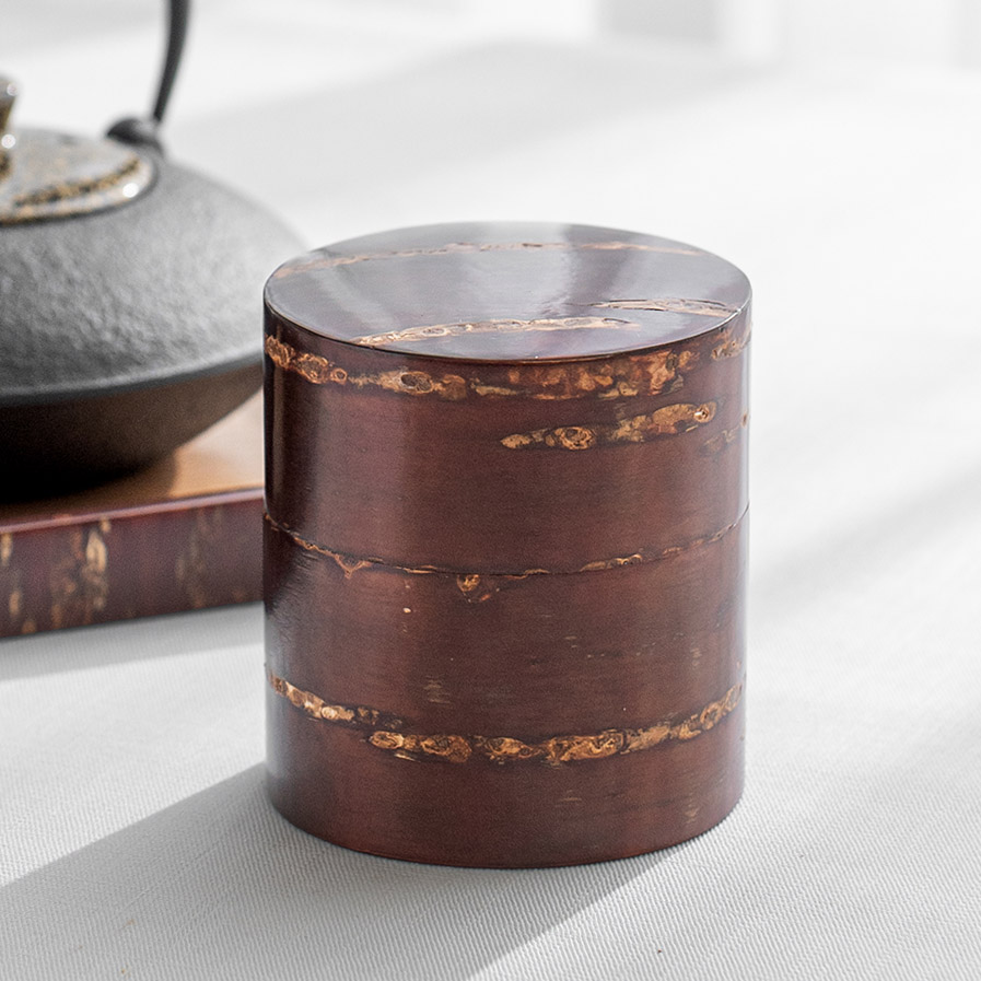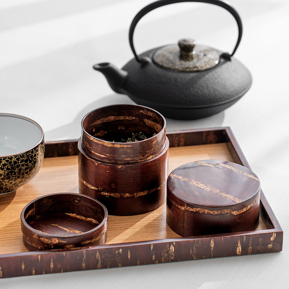 角館傳四郎的茶筒是品牌工藝原點之一,長久以來持續製作並深受喜愛。特色是密閉性高,同一支筒身切割製成各零件,濕度變化也能維持緊密貼合。內外皆貼有櫻皮,連茶筒內側與蓋內側也貼覆櫻皮,質感更顯高級。天然木材保有通氣特質,茶葉於罐中將能保持最佳狀態。