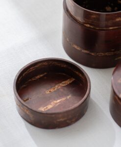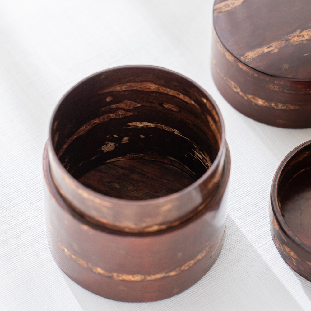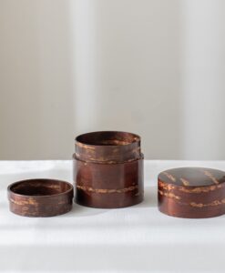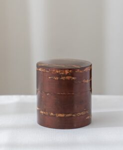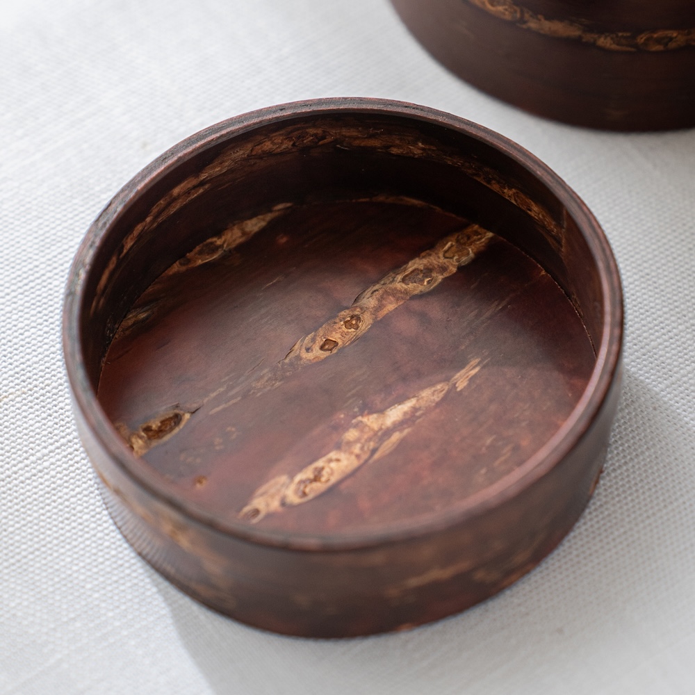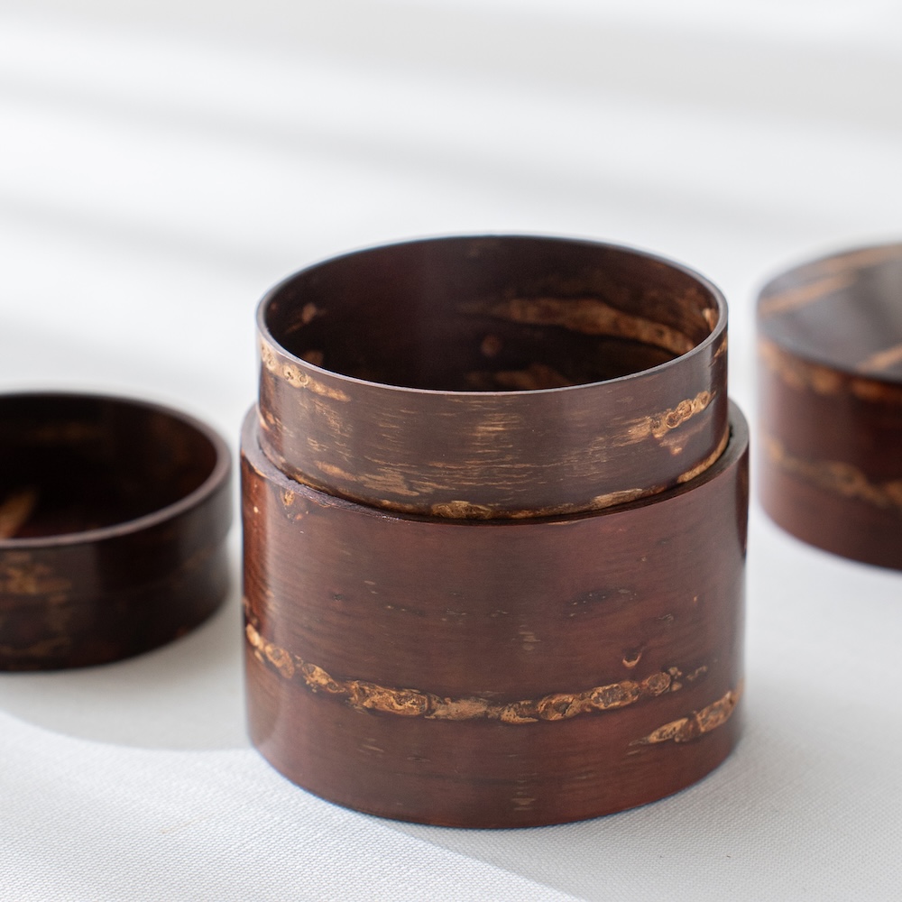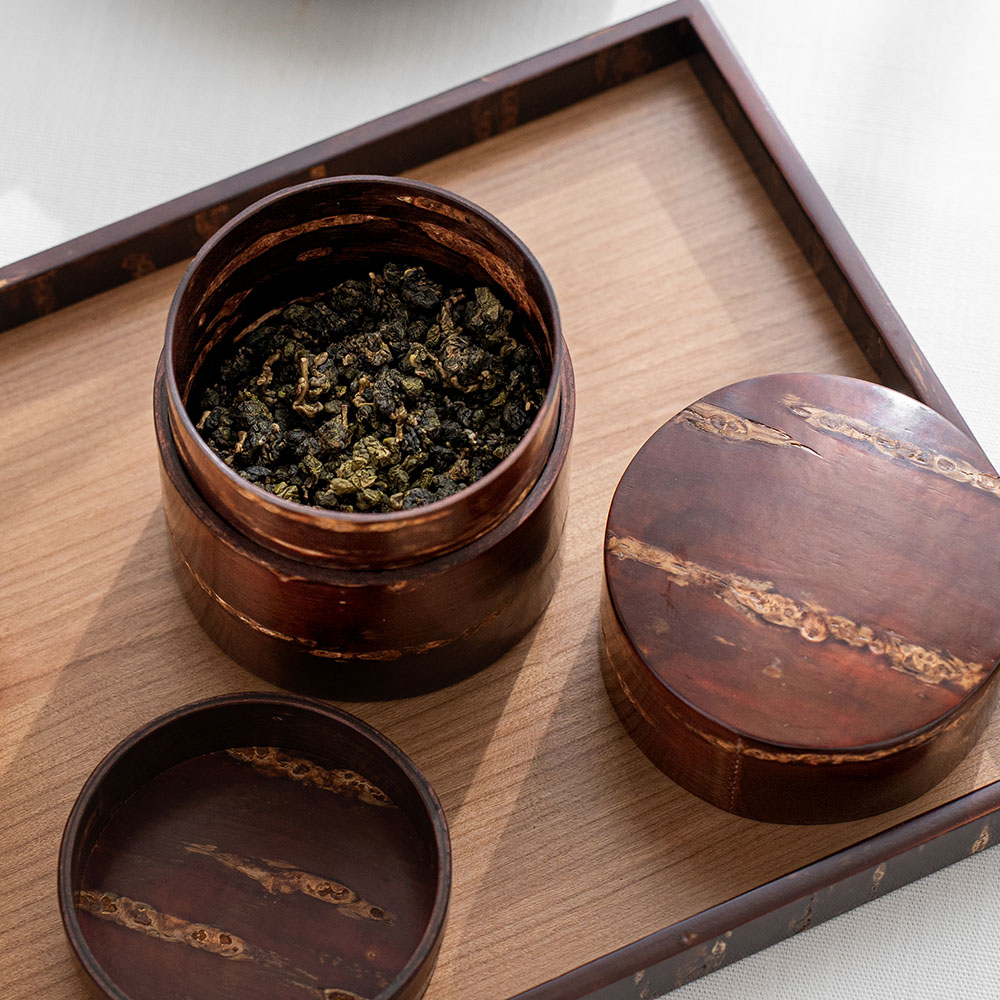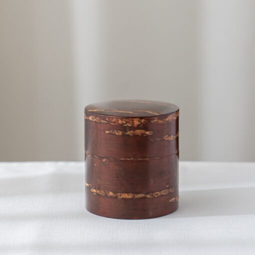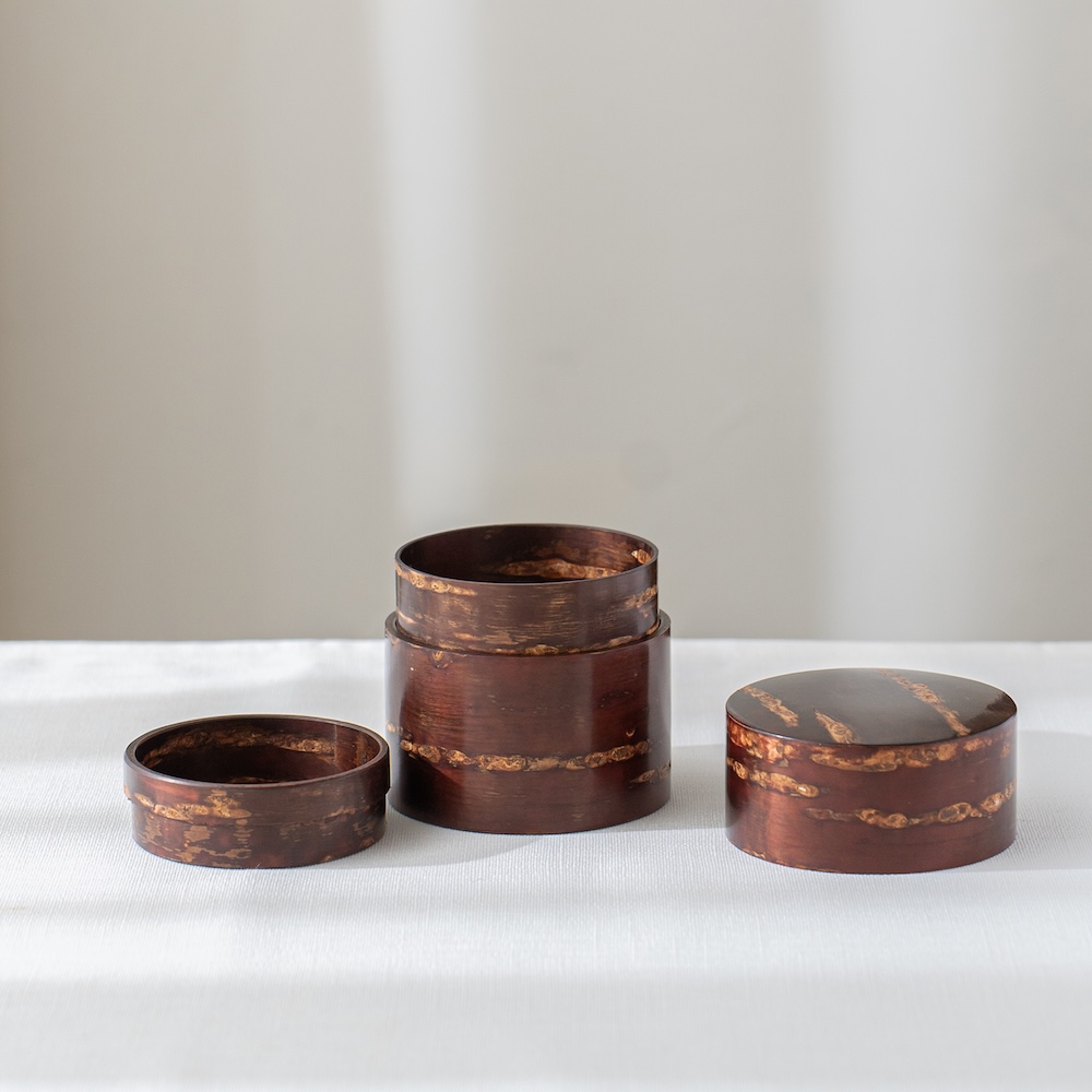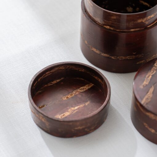 角館傳四郎的茶筒是品牌工藝原點之一,長久以來持續製作並深受喜愛。特色是密閉性高,同一支筒身切割製成各零件,濕度變化也能維持緊密貼合。內外皆貼有櫻皮,連茶筒內側與蓋內側也貼覆櫻皮,質感更顯高級。天然木材保有通氣特質,茶葉於罐中將能保持最佳狀態。