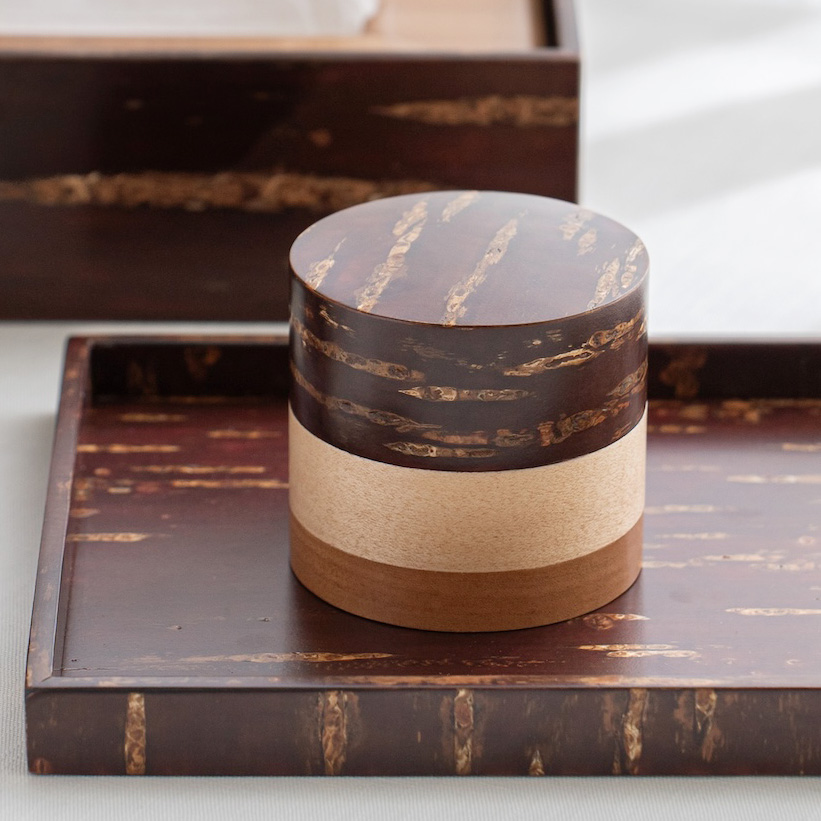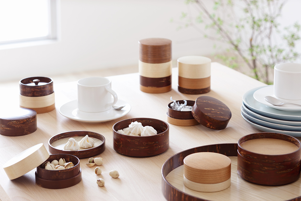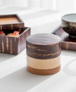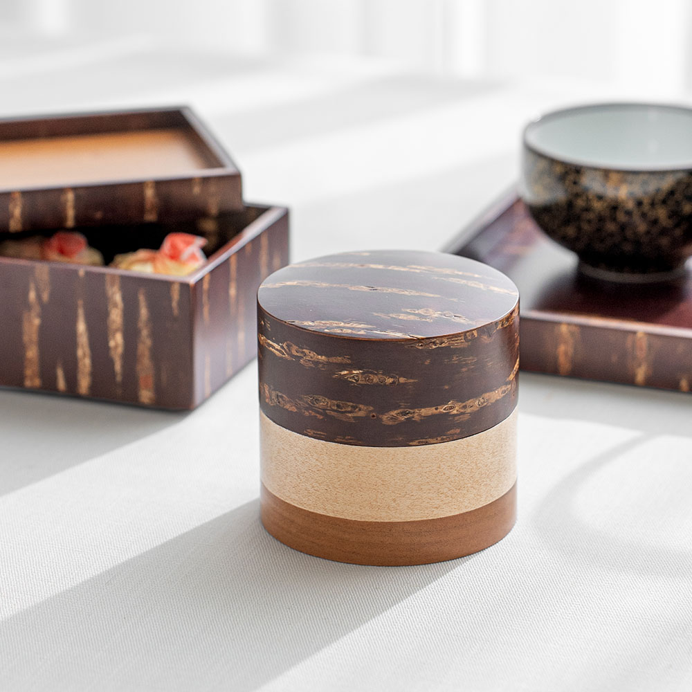 角館傳四郎的茶筒是品牌工藝原點之一,長久以來持續製作並深受喜愛。特色是密閉性高,同一支筒身切割製成各零件,濕度變化也能維持緊密貼合。內外皆貼有櫻皮,連茶筒內側與蓋內側也貼覆櫻皮,質感更顯高級。天然木材保有通氣特質,茶葉於罐中將能保持最佳狀態。