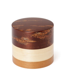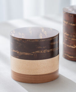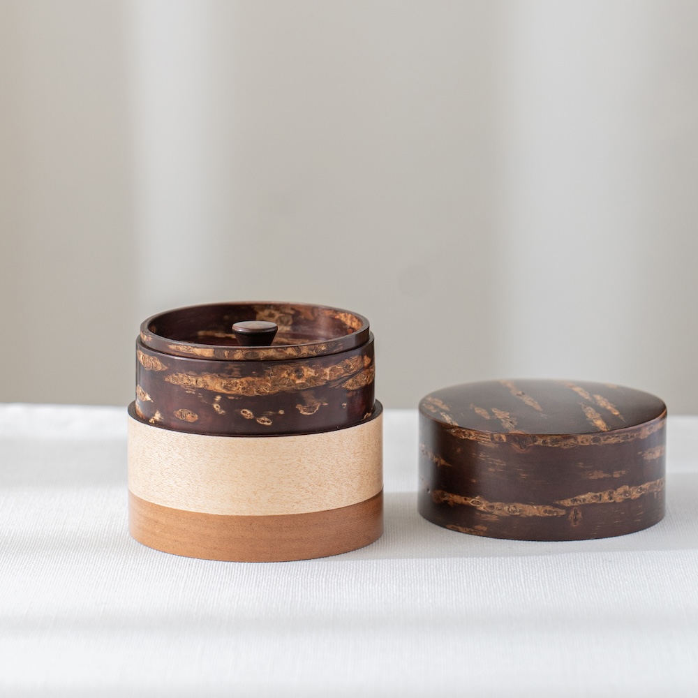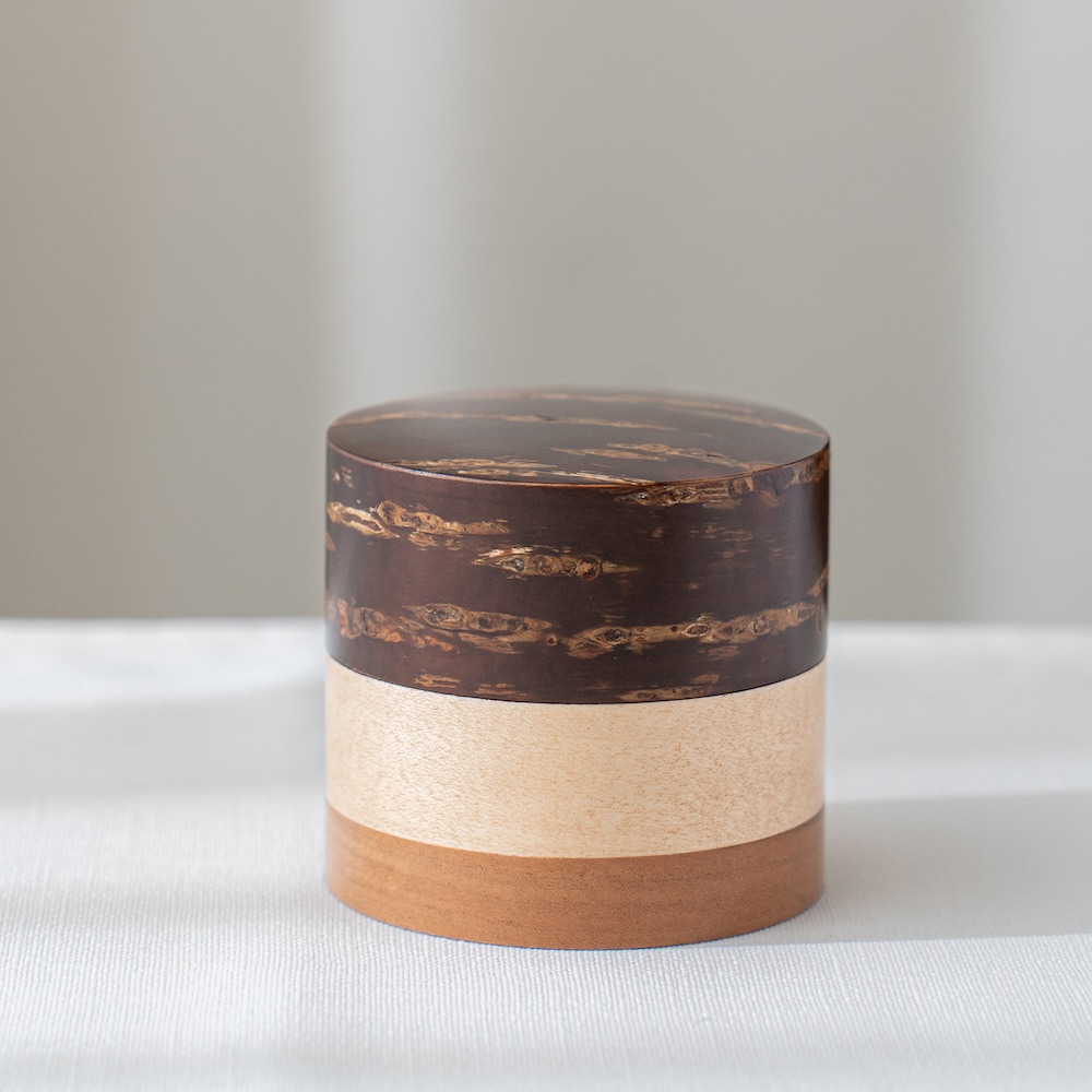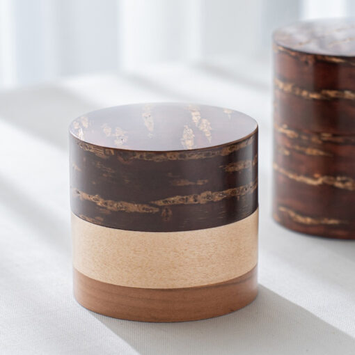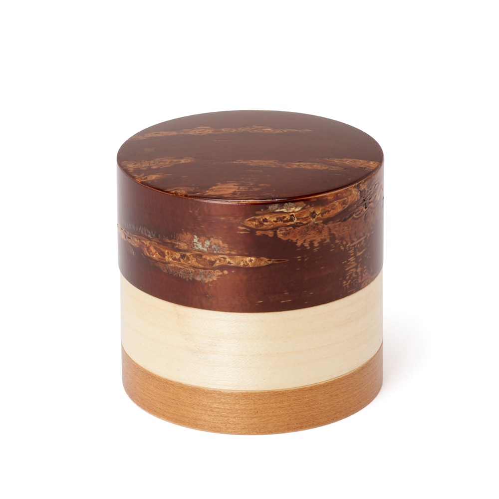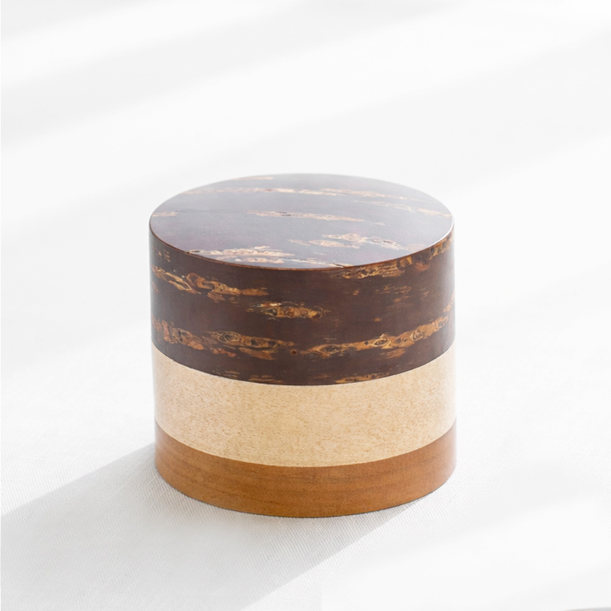輪筒系列筒身分別由櫻木皮、櫻花木、和楓木製成,三段設計作工精細感受職人滿滿的細心與堅持,打造出這款色彩豐富的茶筒。不同木皮的自然色澤,襯托出櫻皮獨有的質感表情,更顯層次與魅力。製作時先分別做出以櫻皮、櫻木、楓木組成的外筒,再將每一種外筒切成四段圓環,重新排列組合後套在內筒外側,便形成具有環狀拼接效果的輪筒造型。