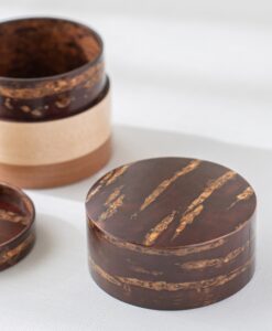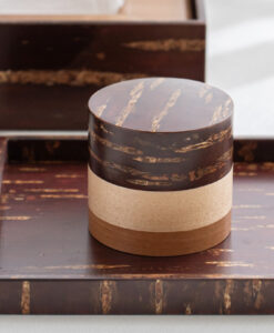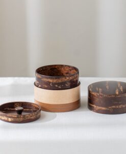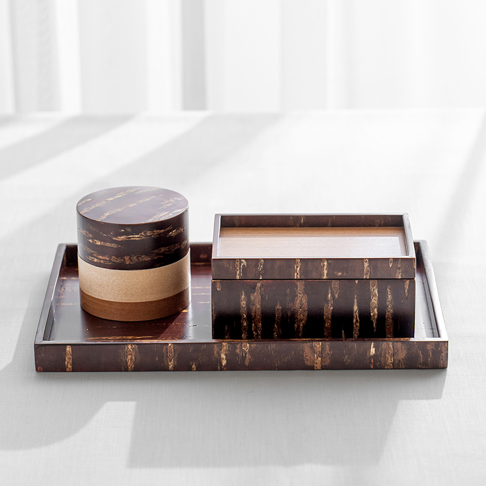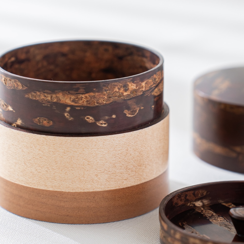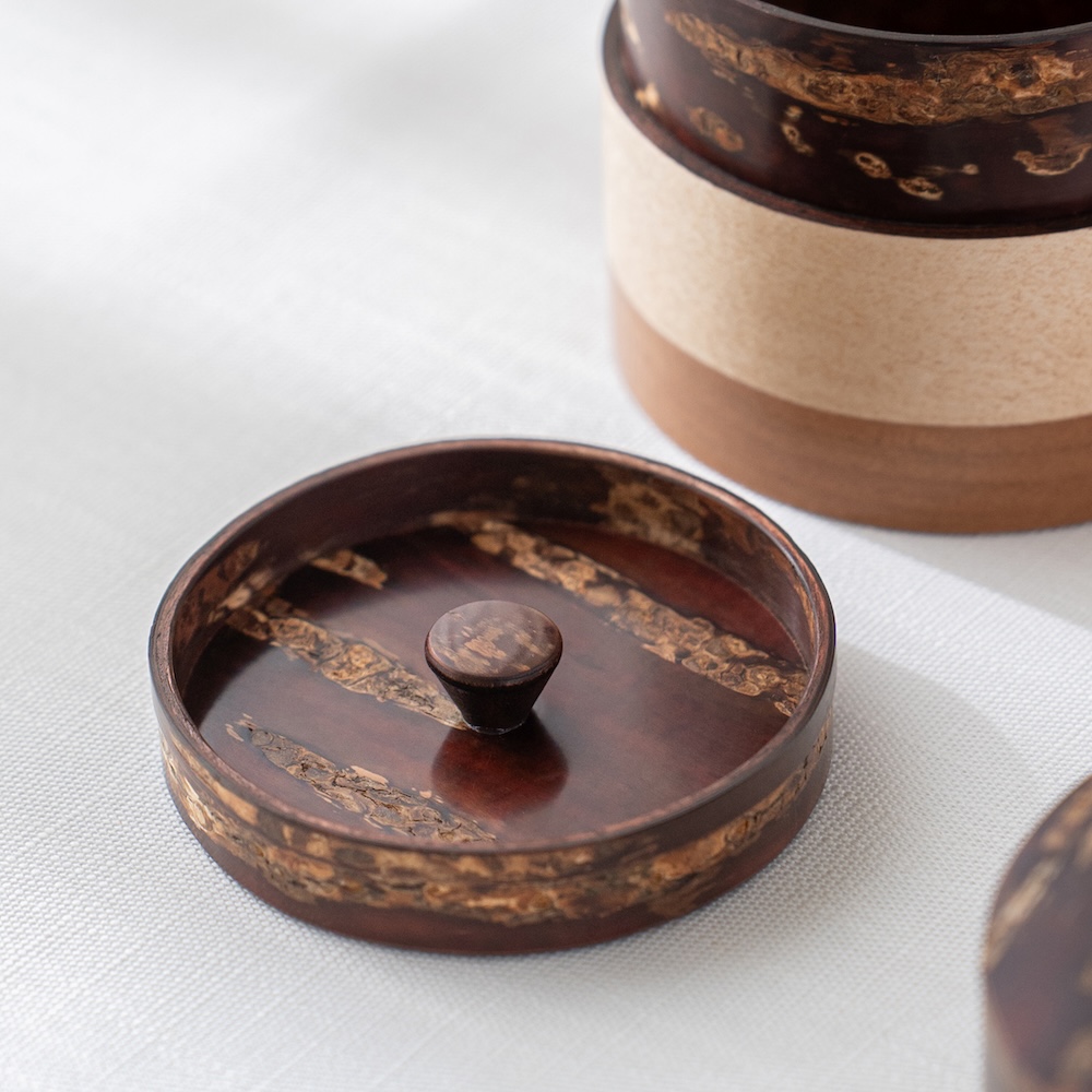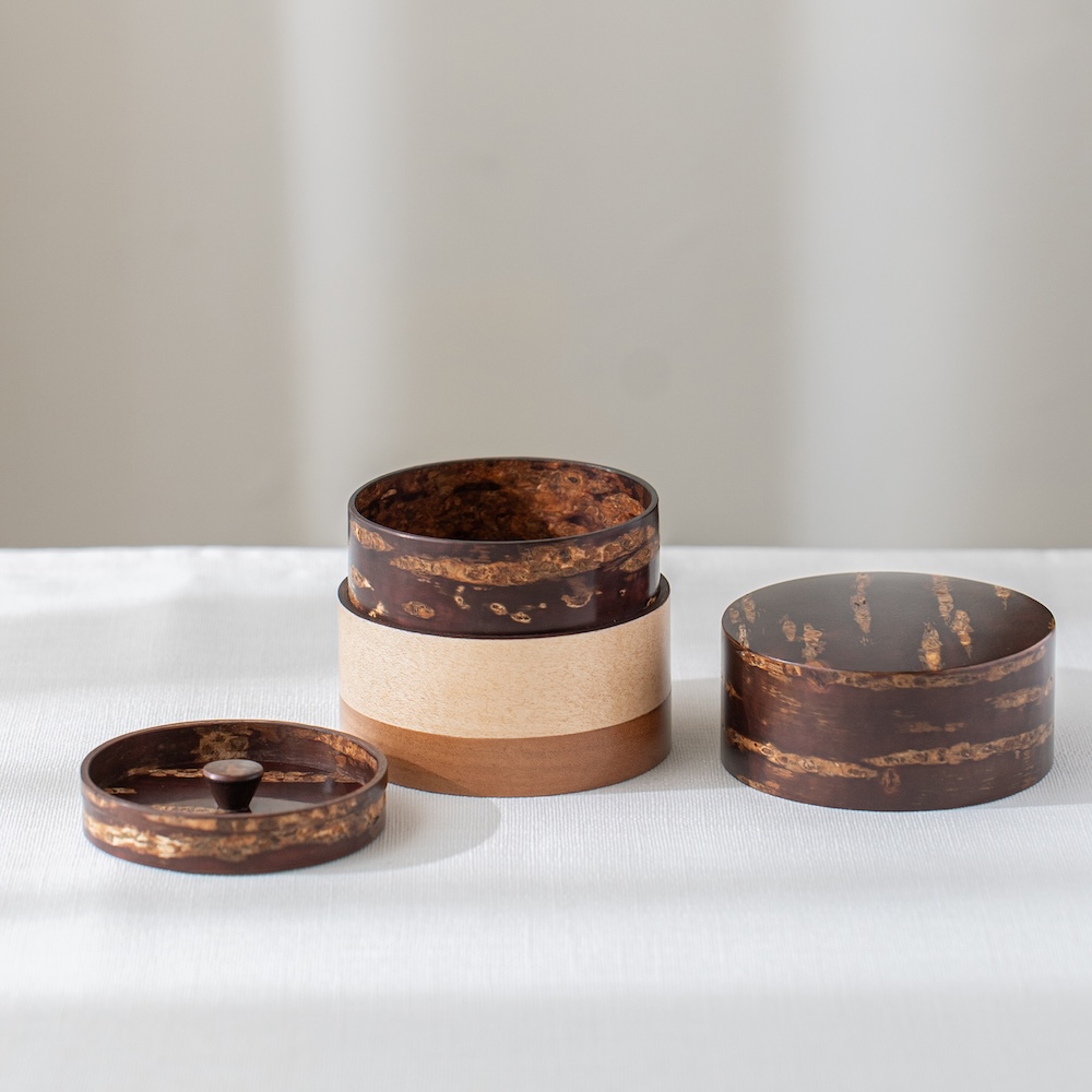 輪筒系列筒身分別由櫻木皮、櫻花木、和楓木製成,三段設計作工精細感受職人滿滿的細心與堅持,打造出這款色彩豐富的茶筒。不同木皮的自然色澤,襯托出櫻皮獨有的質感表情,更顯層次與魅力。製作時先分別做出以櫻皮、櫻木、楓木組成的外筒,再將每一種外筒切成四段圓環,重新排列組合後套在內筒外側,便形成具有環狀拼接效果的輪筒造型。