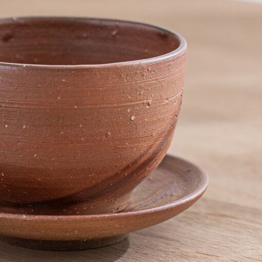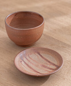 「緋襷(hidasuki)」是一種備前燒的技法,藉由稻草與器皿之間的貼合程度,當稻草燃燒完全後,在器皿留下緋紅色的美麗紋路,因此每件作品皆具有獨一無二的花紋。