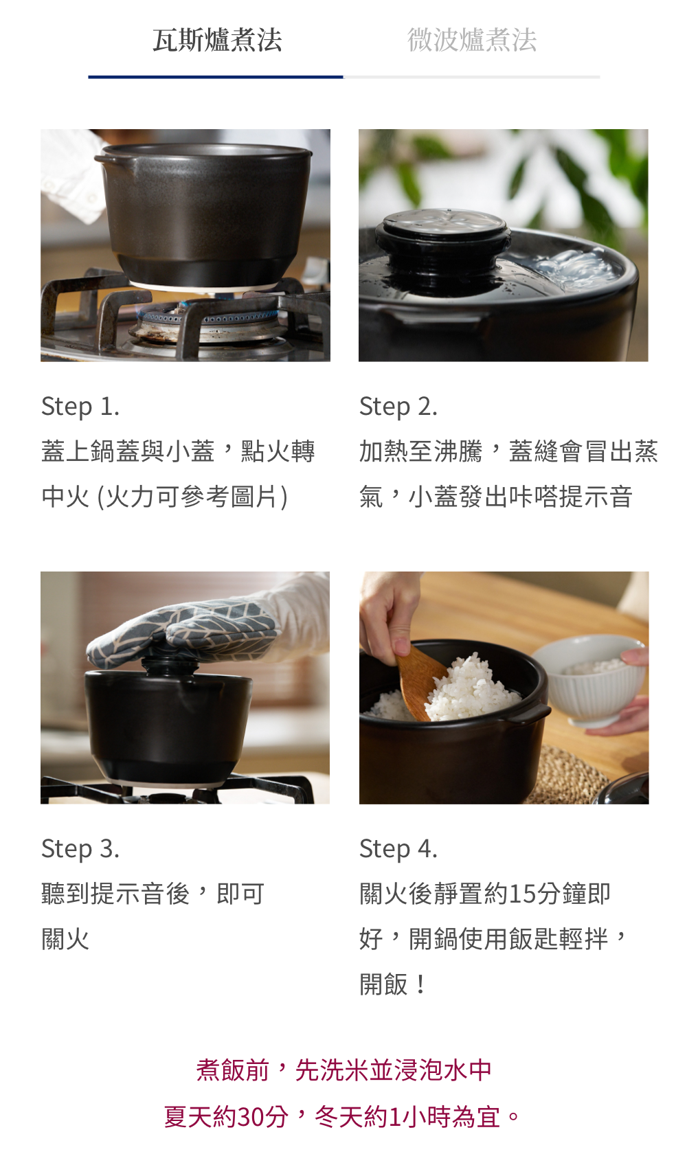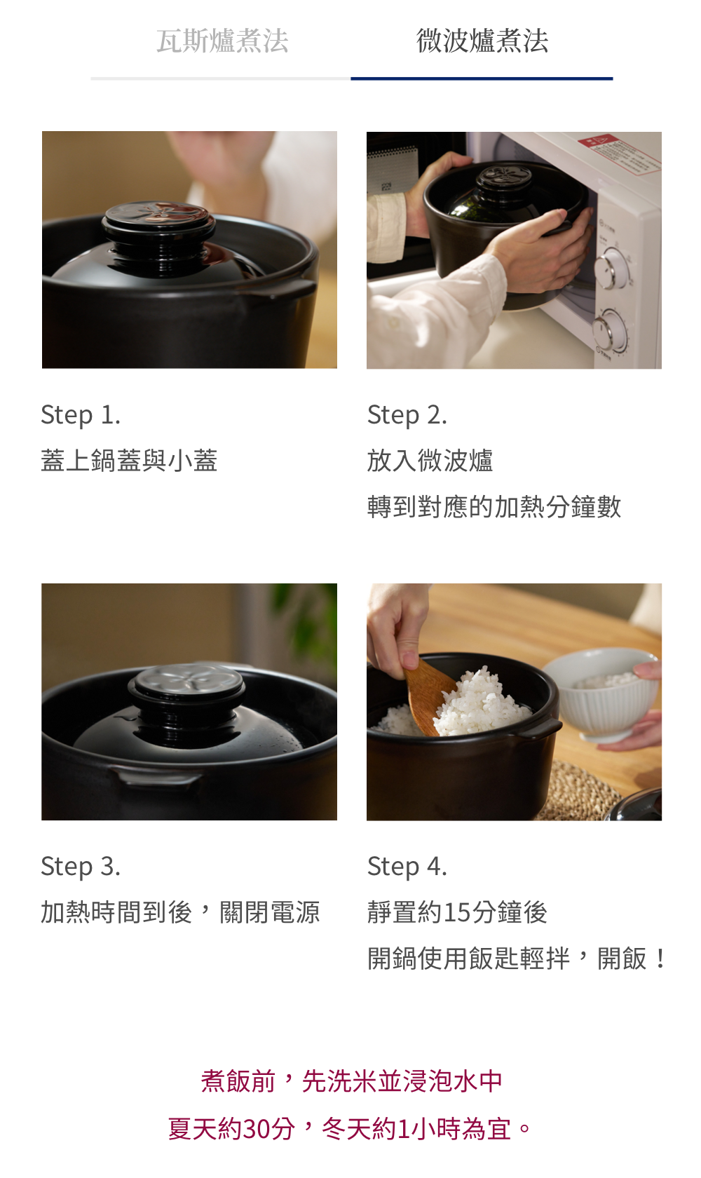 煮飯前,請先先洗米並浸泡水中:夏天約30分鐘;冬天約1小時為宜。