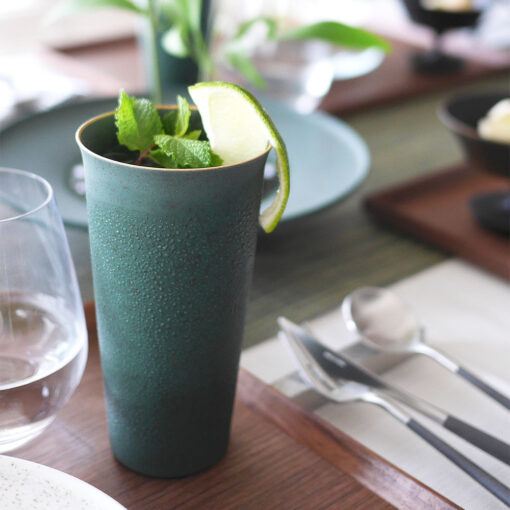 畑萬陶苑的「Tumbler 薄口陶瓷杯」追求絕佳的口感與握感,挑戰極致的輕薄設計。透過倒燒技法讓杯口微微外彎,實現順口滑順的飲用體驗。杯緣以金色點綴,為簡約造型增添一抹高雅。薄而輕便、易於握持,非常適合各種飲品,包括啤酒、調酒等酒類,還有冰咖啡或果汁等,清爽的口感讓冷飲更加美味。