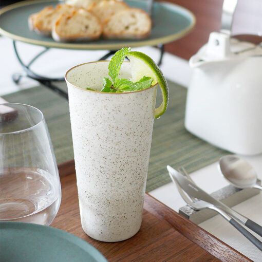 畑萬陶苑的「Tumbler 薄口陶瓷杯」追求絕佳的口感與握感,挑戰極致的輕薄設計。透過倒燒技法讓杯口微微外彎,實現順口滑順的飲用體驗。杯緣以金色點綴,為簡約造型增添一抹高雅。薄而輕便、易於握持,非常適合各種飲品,包括啤酒、調酒等酒類,還有冰咖啡或果汁等,清爽的口感讓冷飲更加美味。