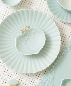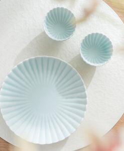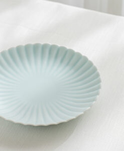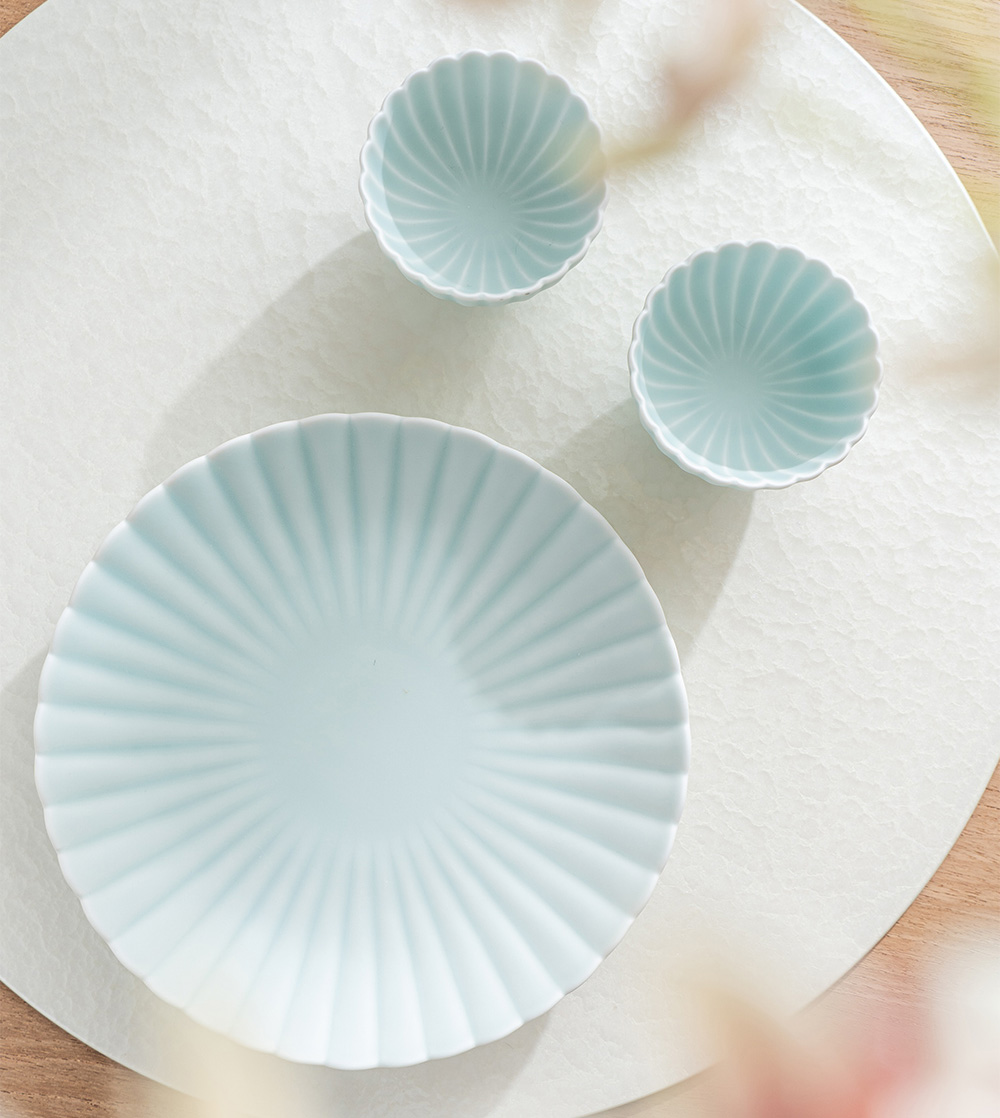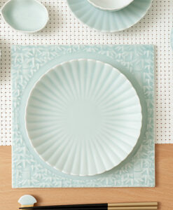 畑萬陶苑以傳統工藝,挑戰了青瓷的全新表現形式,並創造了帶有噴砂表面的啞光紋理“moist”系列。溫潤柔美的質地觸感非常順滑,清新的藍綠色漸層給人清爽的感覺。