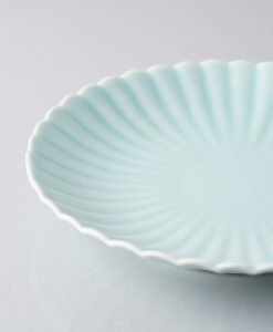 極為少見的霧面青瓷,啞光青瓷質地觸感柔和,超乎想像的溫潤柔美表面處理,是畑萬陶苑獨有的技術。畑萬陶苑以鍋島燒的傳統技法,呈現如寧靜湖水的淡藍色,讓人聯想到畑萬陶苑所在的大川內山清晨,薄霧籠罩的夢幻場景。