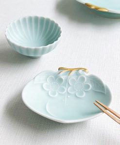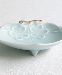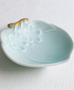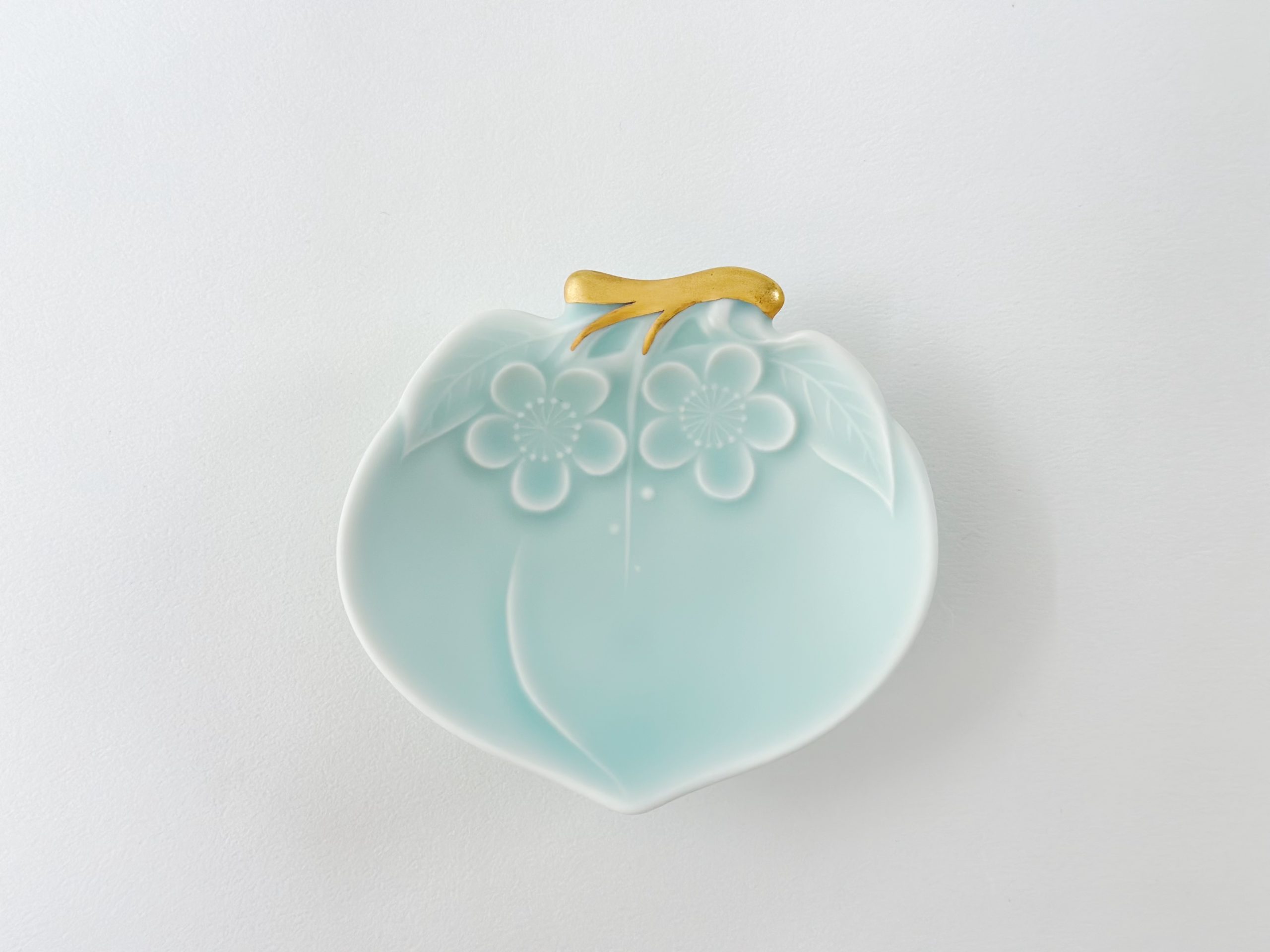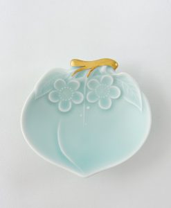 金枝蜜桃小皿,結合具有溫柔啞光質感的淺綠色青瓷,及高質感純金釉料的金彩枝部。利用蜜桃的形狀,將鍋島青瓷的魅力和Moist原創系列相結合,成為現代感十足的獨特器皿,也是小巧玲瓏的可愛物件。