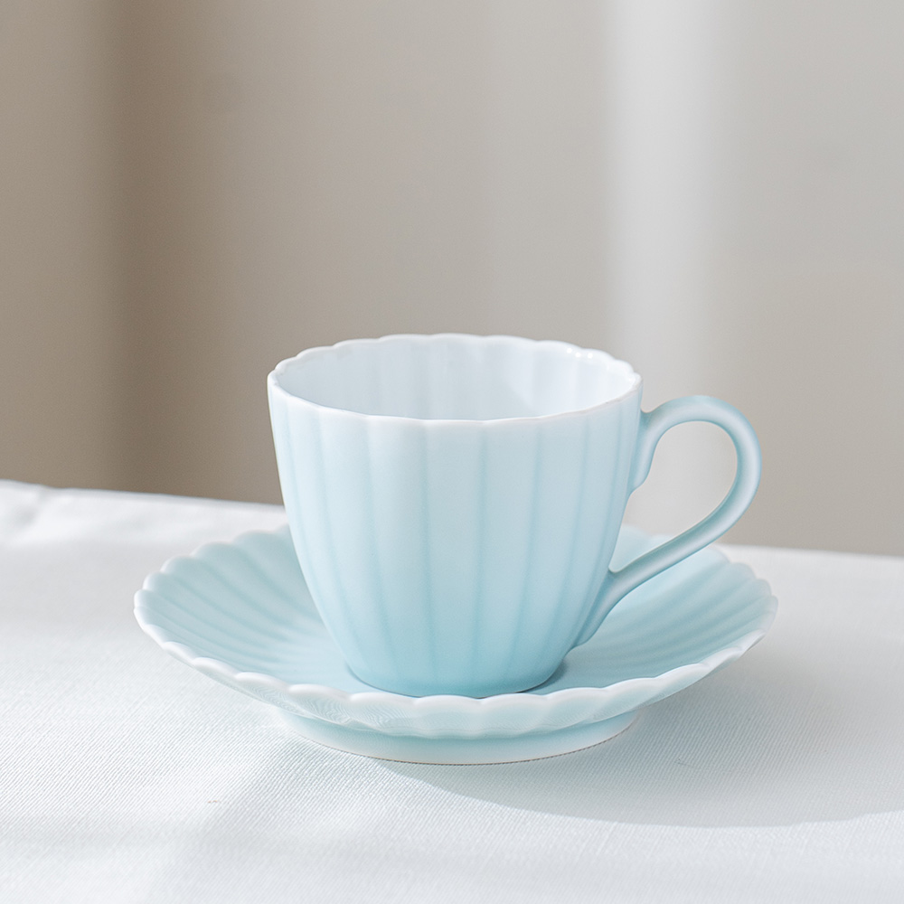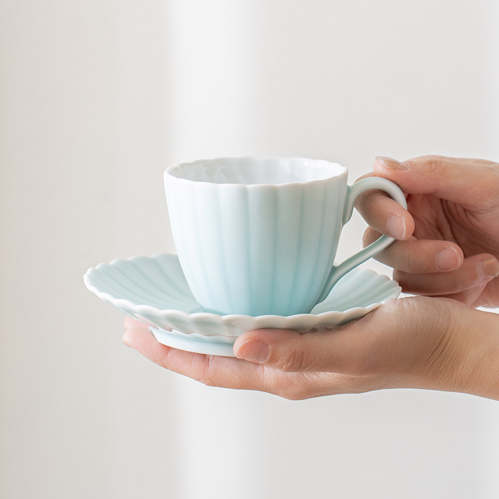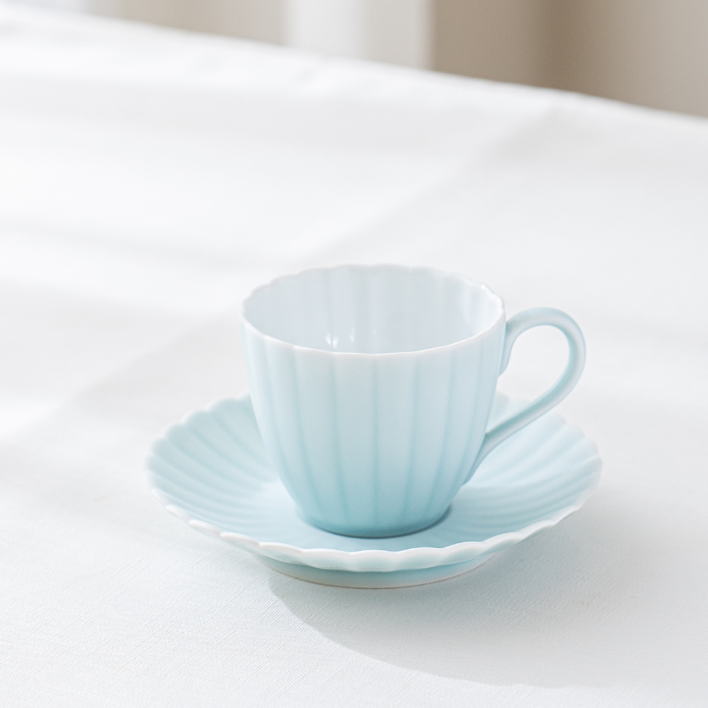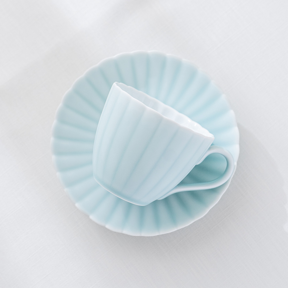 來自 Moist Moist 系列的咖啡杯和碟子,咖啡杯以柔和的薄綠色呈現,搭配經典的日式菊割圓盤,霧面質感如絲般細膩,帶來沉靜而雅緻的氛圍。拿在手中時,那份溫潤而輕盈的觸感,讓人忍不住想一再觸摸。這份獨特的質感與視覺的柔和調和,不僅提升了餐桌的品味,更讓每日的咖啡時光多了一份愜意與舒適,適合家庭聚會等招待場合。