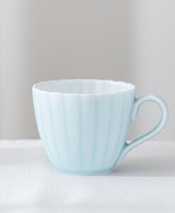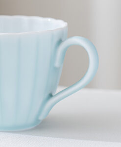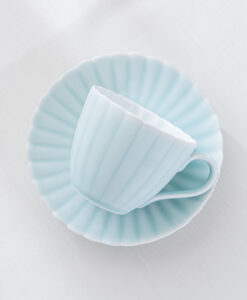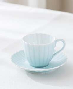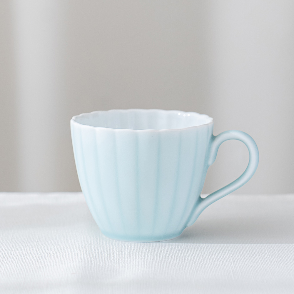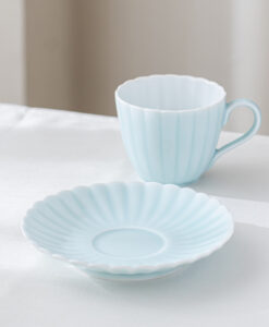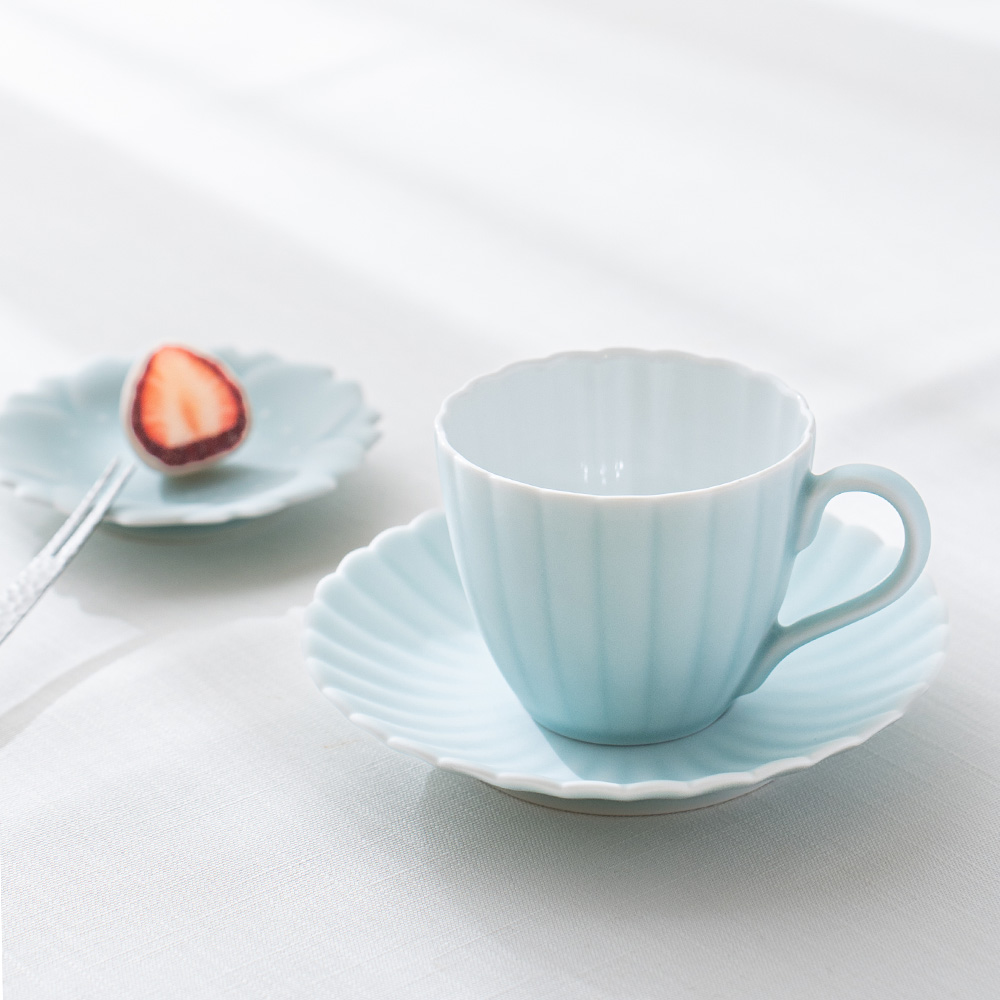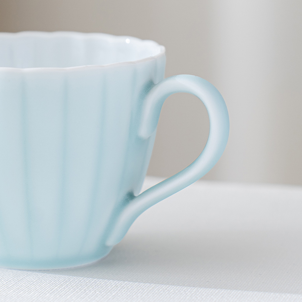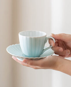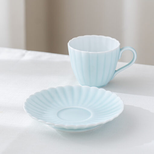 來自 Moist Moist 系列的咖啡杯和碟子,咖啡杯以柔和的薄綠色呈現,搭配經典的日式菊割圓盤,霧面質感如絲般細膩,帶來沉靜而雅緻的氛圍。拿在手中時,那份溫潤而輕盈的觸感,讓人忍不住想一再觸摸。這份獨特的質感與視覺的柔和調和,不僅提升了餐桌的品味,更讓每日的咖啡時光多了一份愜意與舒適,適合家庭聚會等招待場合。