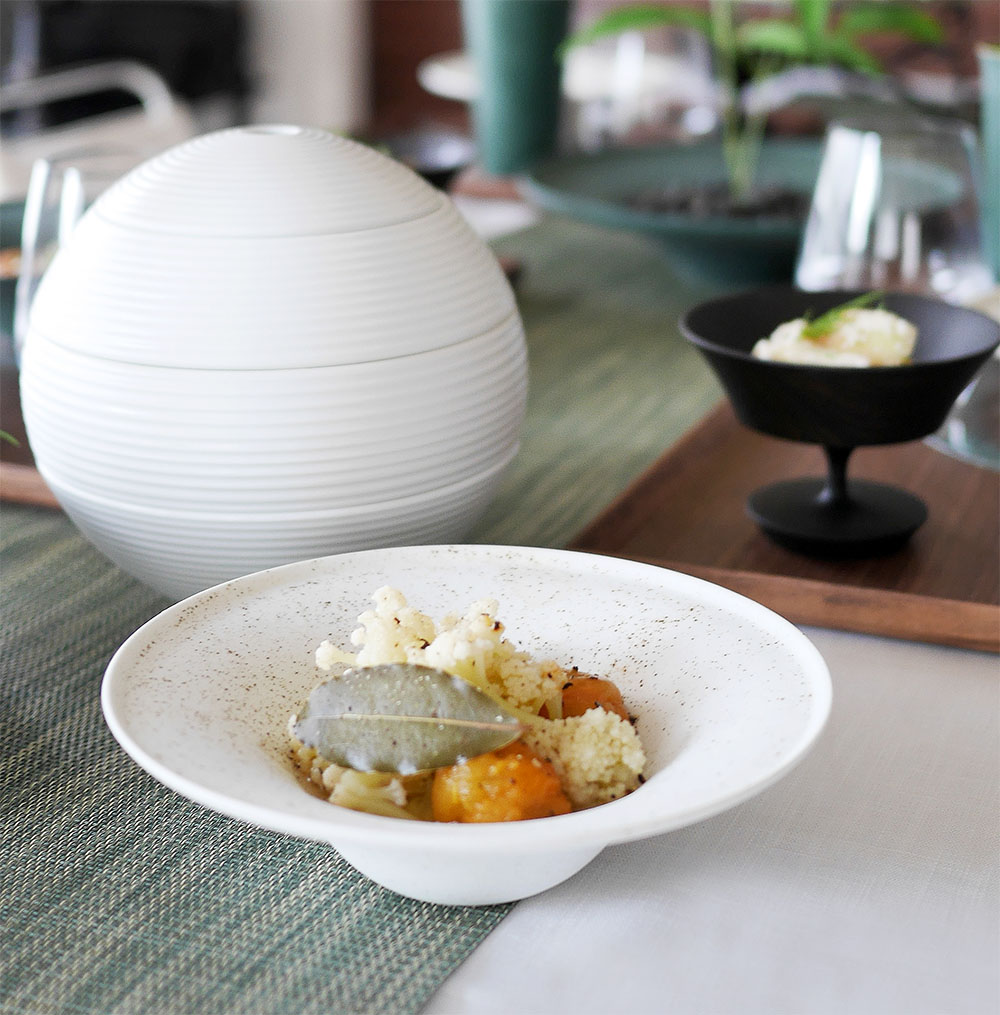盤緣設有突出的邊緣(Rim),在擺盤時能襯托料理,使食材更加吸睛。不論是濃湯或是一道簡單的料理,都能為餐桌增添層次與氛圍。