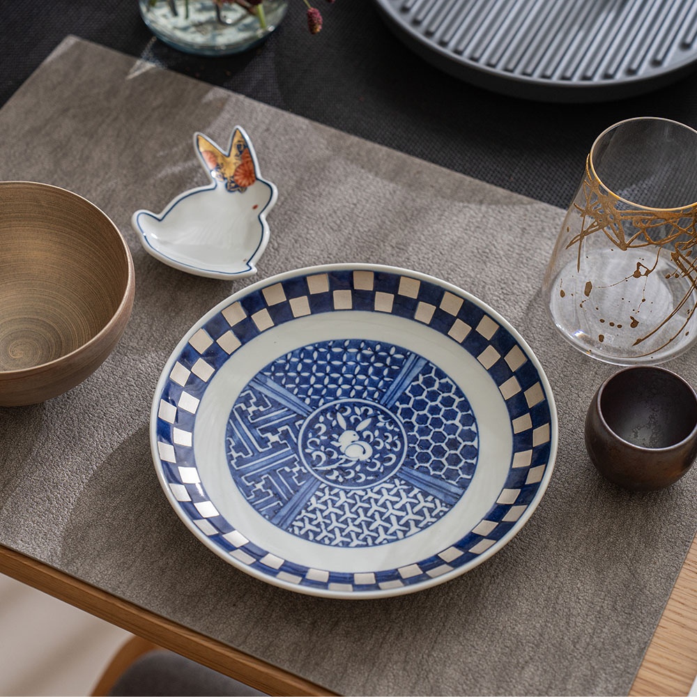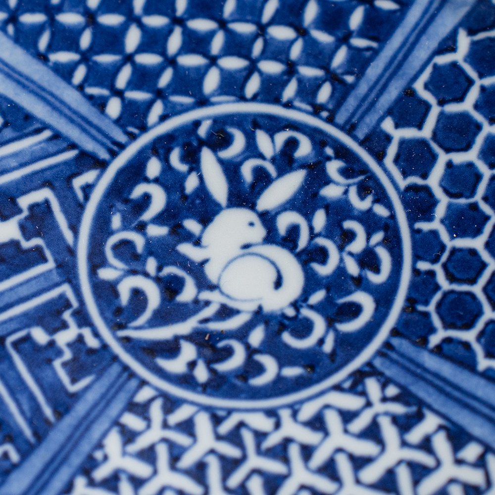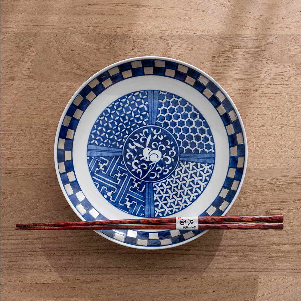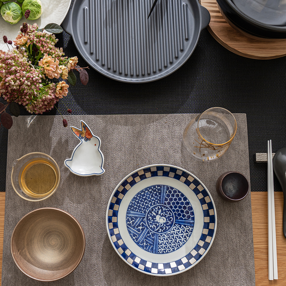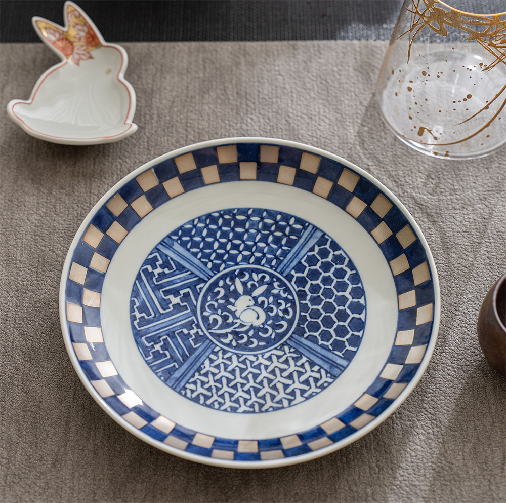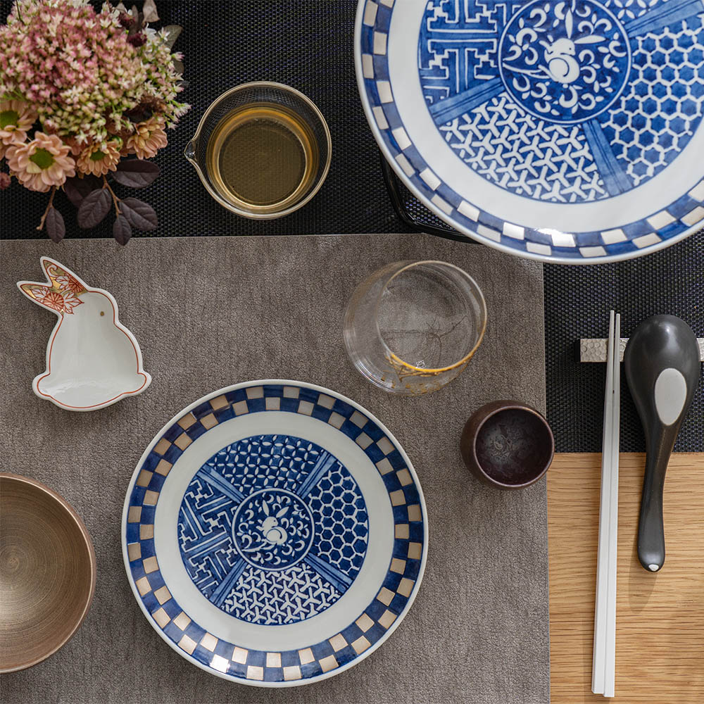 盤面中心以兔子圖案為主題,周圍則以古典市松紋樣環繞,以染付與銀彩分色表現,創造出不同於以往傳統染付的全新感受。因此即使與西式餐具搭配也毫不違和,能夠演繹出時尚又雅緻的現代和風餐桌氛圍。