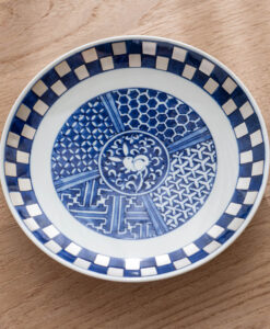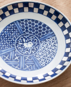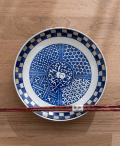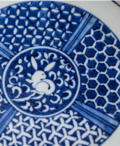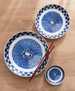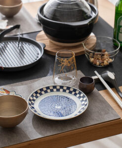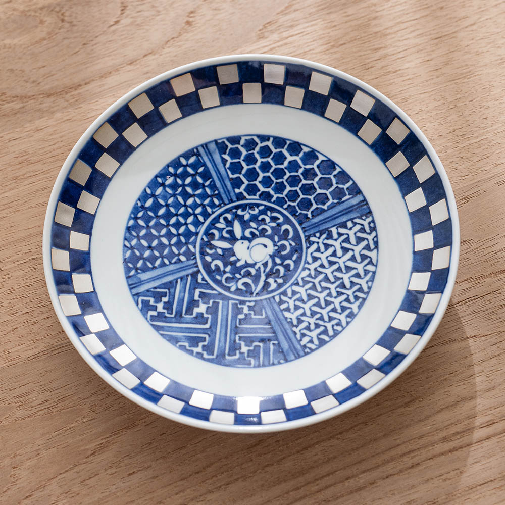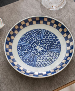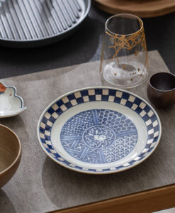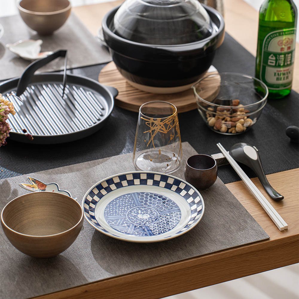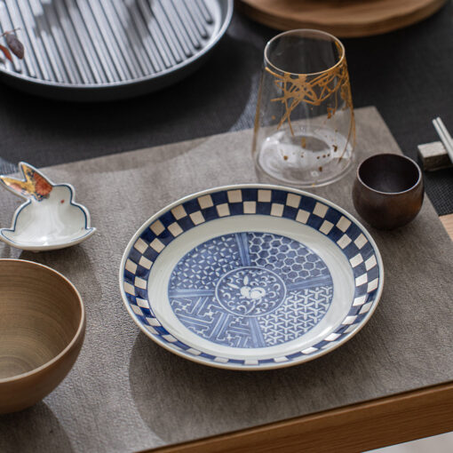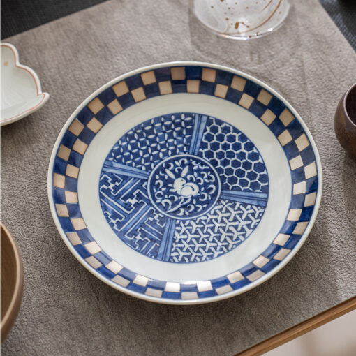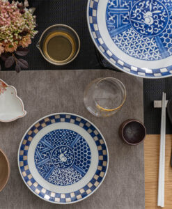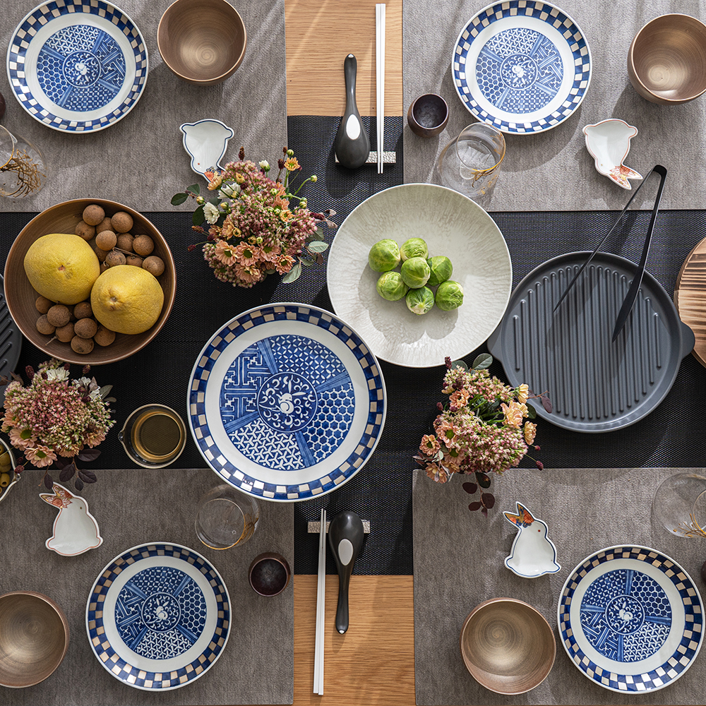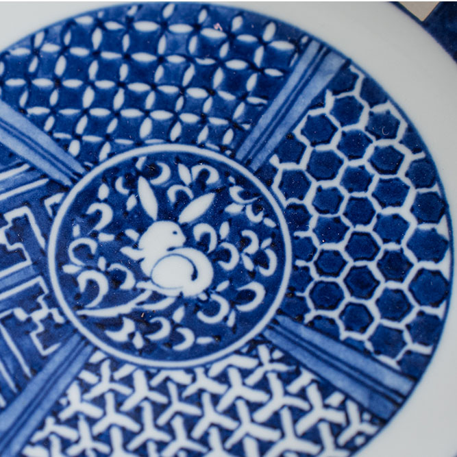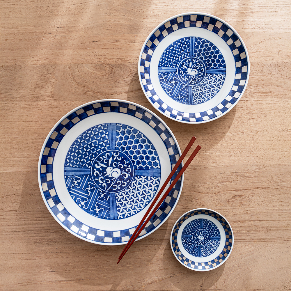盤面中心以兔子圖案為主題,周圍則以古典市松紋樣環繞,以染付與銀彩分色表現,創造出不同於以往傳統染付的全新感受。因此即使與西式餐具搭配也毫不違和,能夠演繹出時尚又雅緻的現代和風餐桌氛圍。