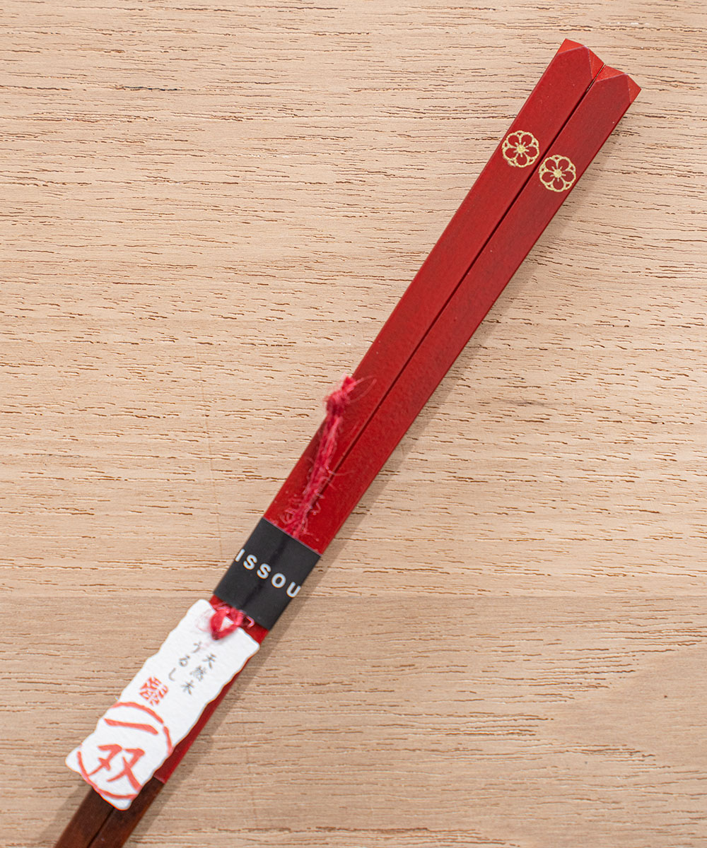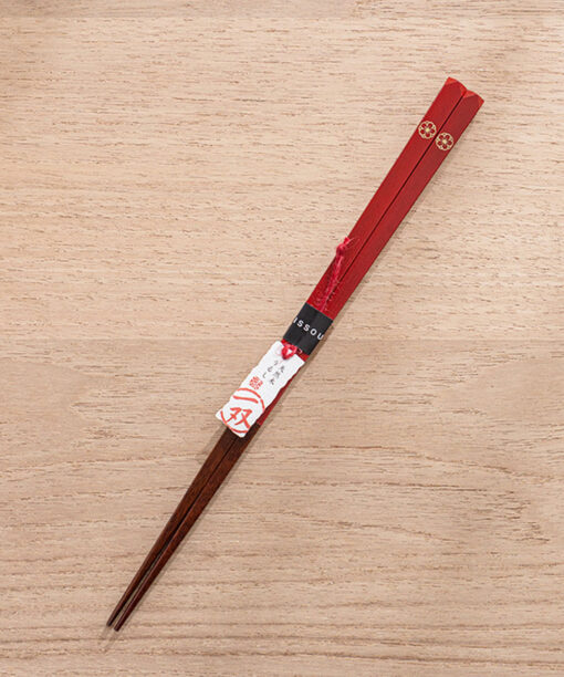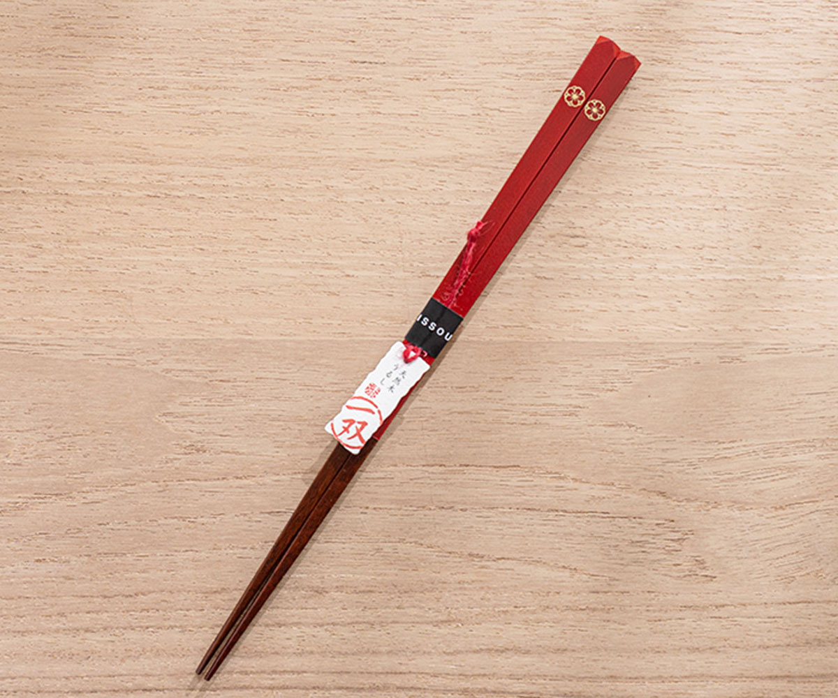 以溫暖的紅色為底,綴以一朵盛放的櫻花圖紋,彷彿春日記憶悄然綻放於器物之上。筷身選用天然木材製成,質地輕盈、手感溫潤,細膩傳遞日常用餐的講究與美意。筷尖略為細長,便於夾取各式食材,握持處亦經過特別設計,更加穩固好握,是一款兼具優雅外型與實用機能的精緻之選。