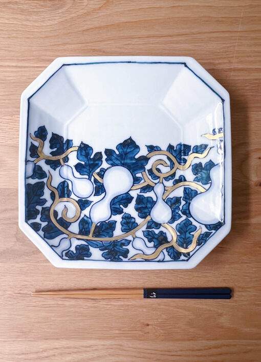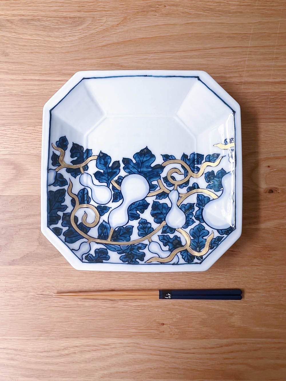 以藍色及金色釉彩,手繪出吉祥的葫蘆圖紋,獨特風格,典雅有型。別緻的八角小盤,適合盛放點心,零嘴或是餐桌的小配菜。