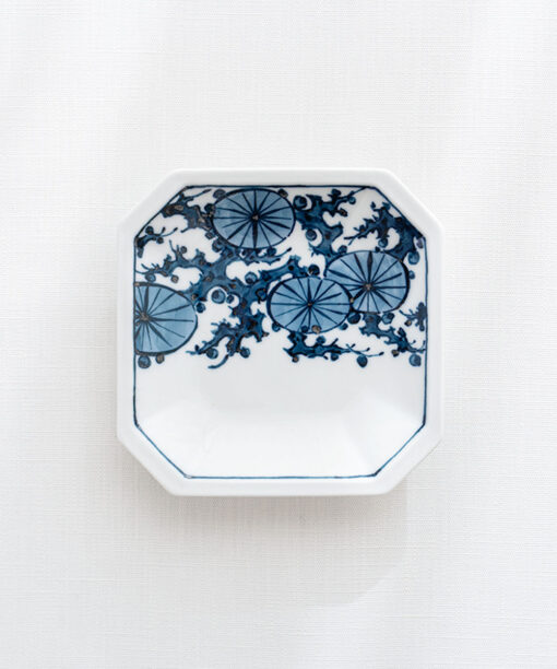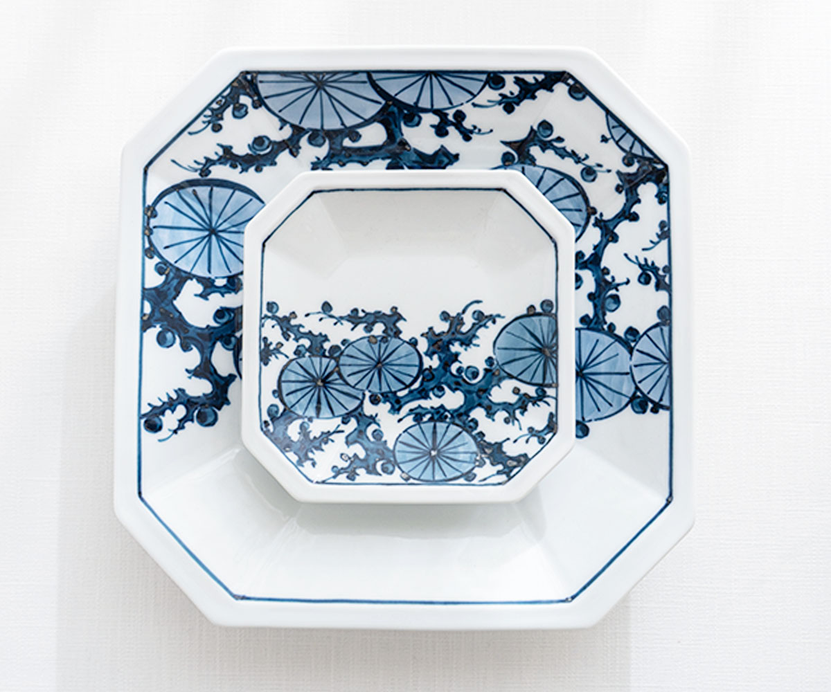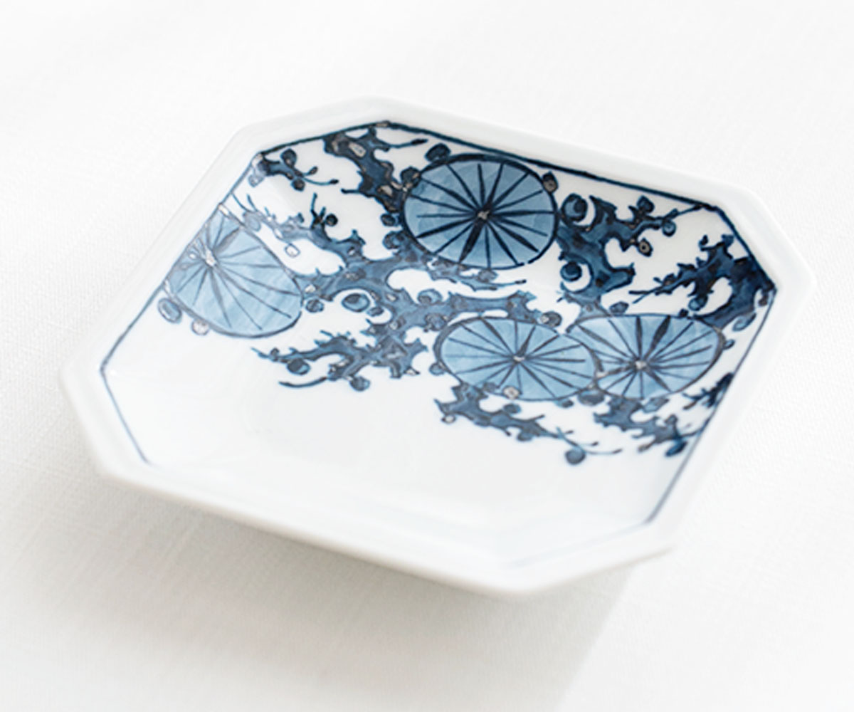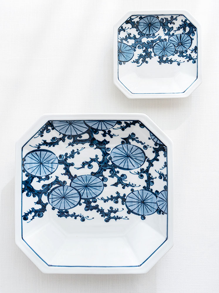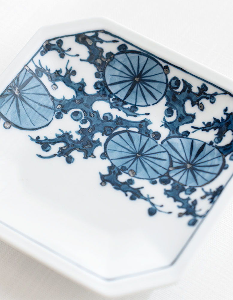 伊萬里陶苑所使用的釉料不含任何膠質物,而是由天然茶葉發酵製成,因此釉料需要置放3年之久,待發酵產生的異味完全消除。以典雅的染付技法描繪出松葉與花交織的紋樣,展現細膩雅緻的藍白對比。