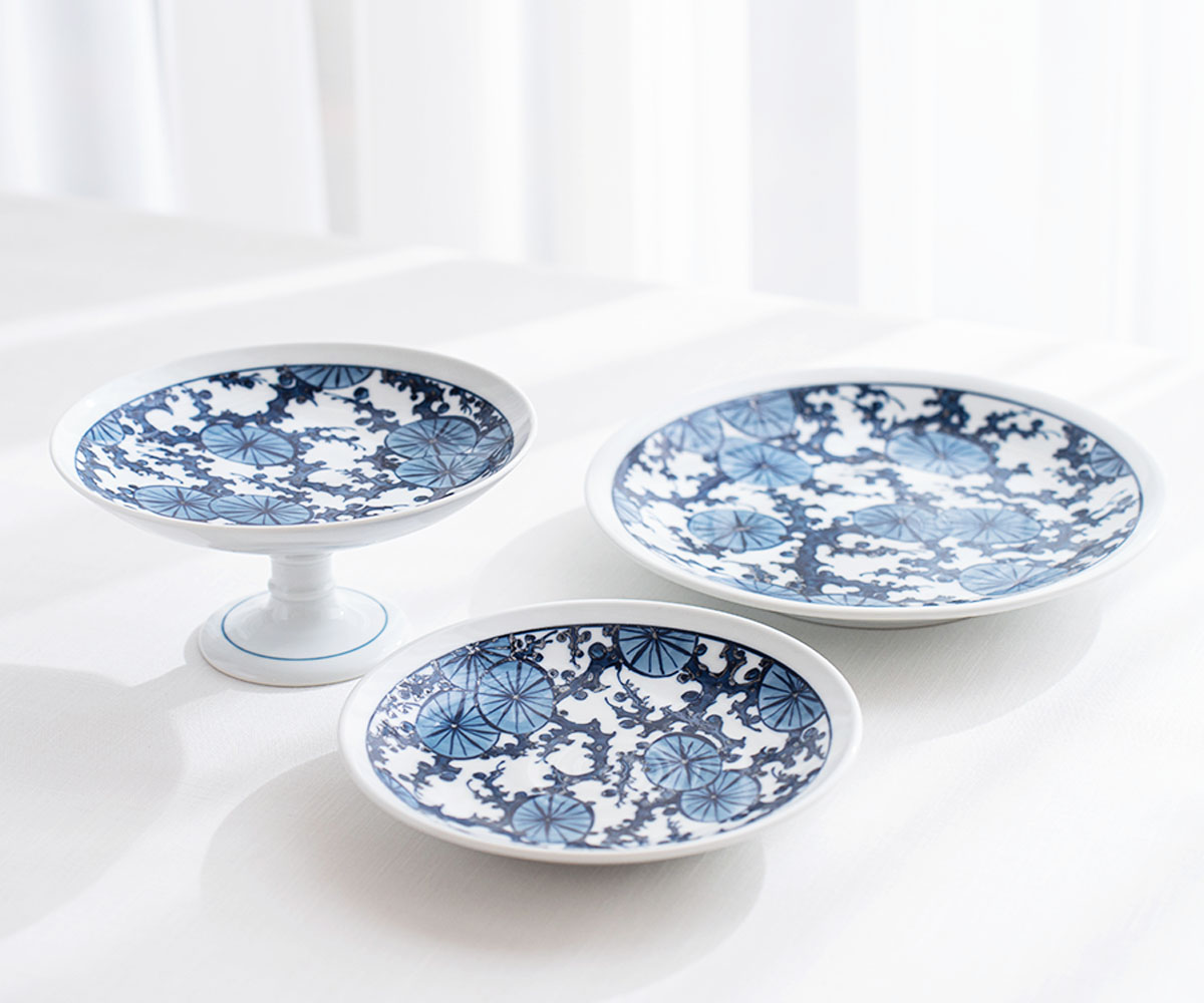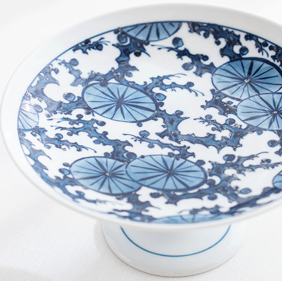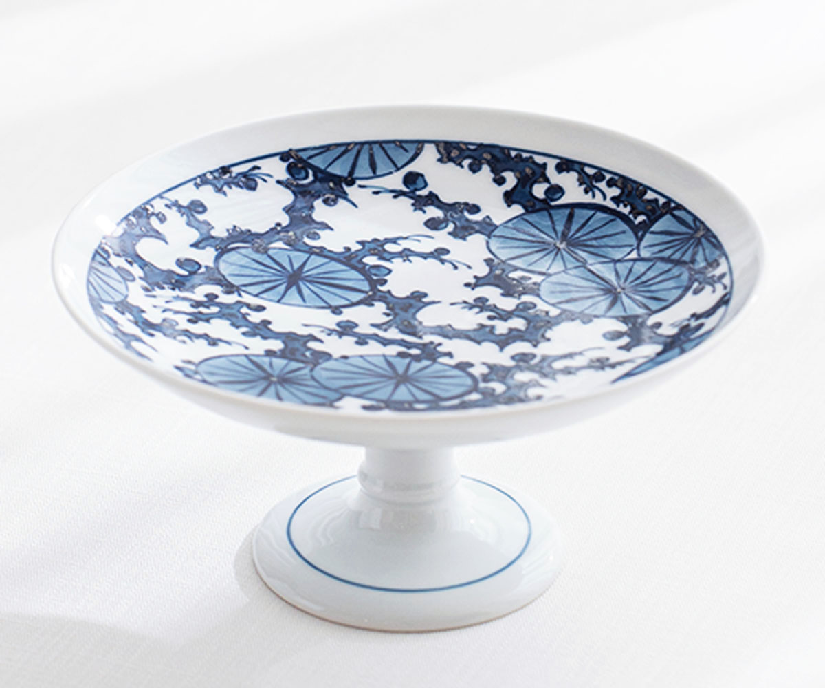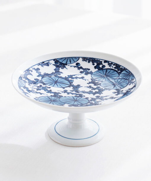 伊萬里陶苑所使用的釉料不含任何膠質物,而是由天然茶葉發酵製成,因此釉料需要置放3年之久,待發酵產生的異味完全消除。以典雅的染付技法描繪出松葉與花交織的紋樣,展現細膩雅緻的藍白對比。高腳造型不僅優美,更提升了餐桌的立體層次感,適合盛放和菓子、前菜或茶席點心,為日常用餐注入一抹古樸與格調。