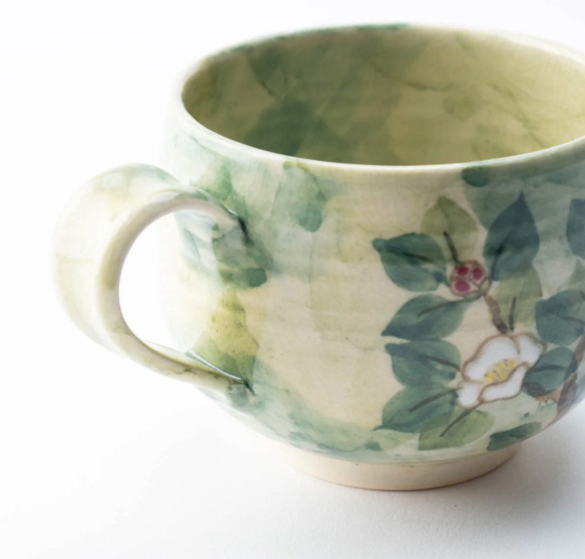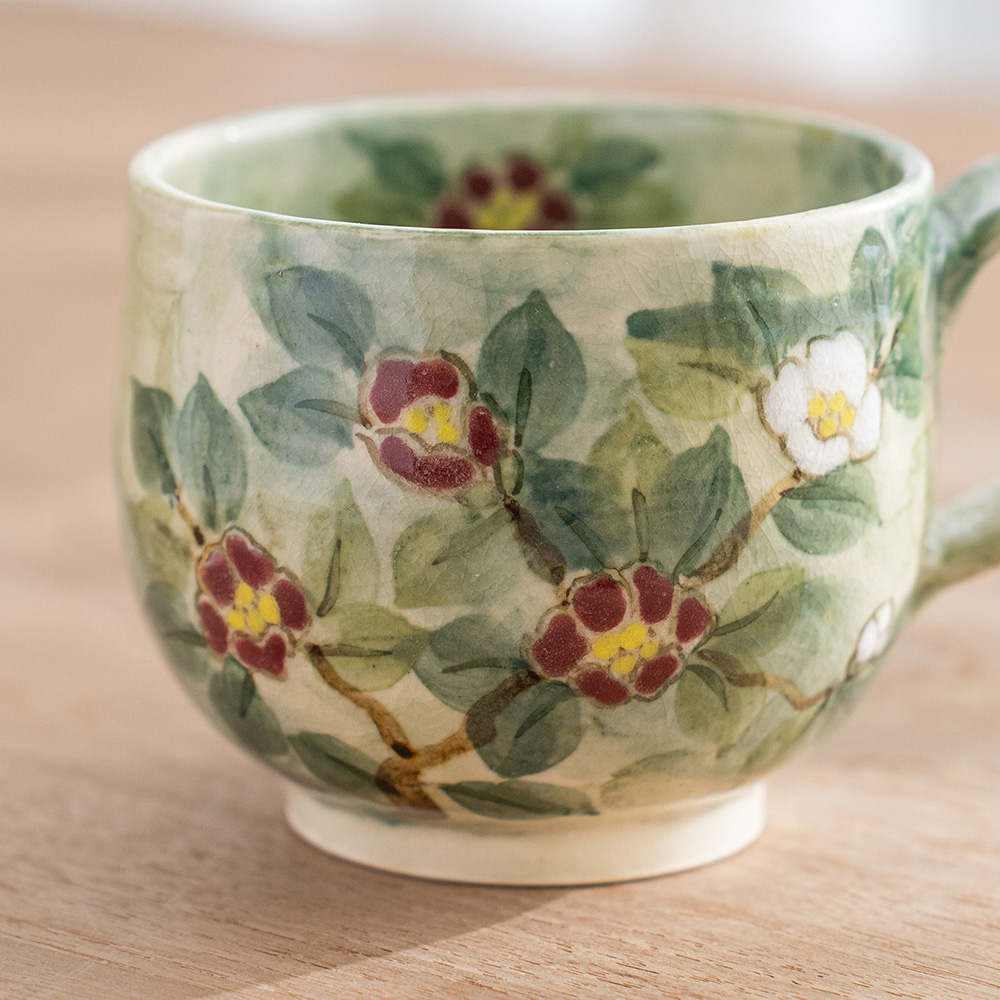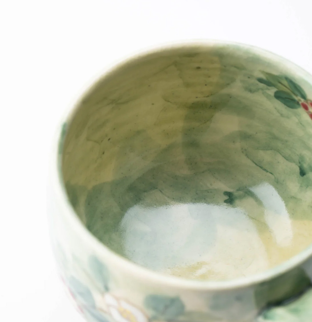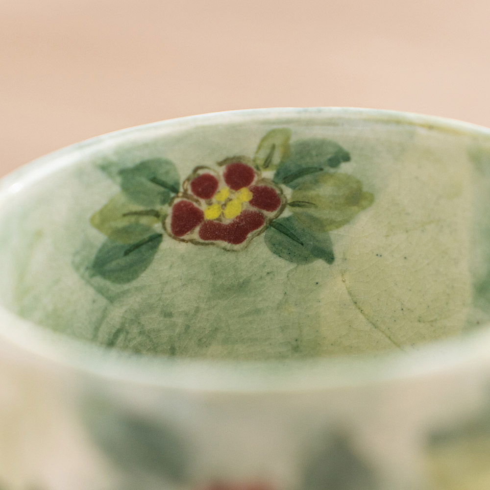 這款描繪了京都祇園優雅的垂枝櫻花的梅型缽,展現了京都的獨特氛圍。櫻花的粉色和淡綠枝葉,美麗地裝飾著清水燒獨有的微黃奶油釉色,而垂枝櫻花正是京都的代表花卉之一。