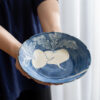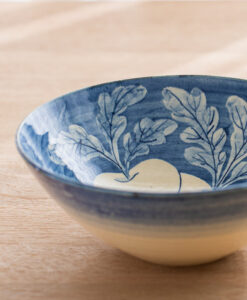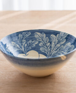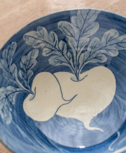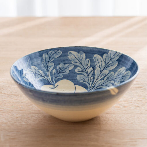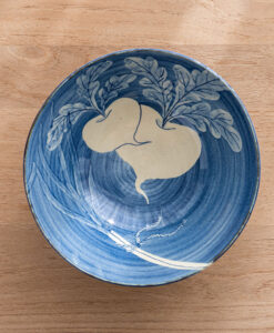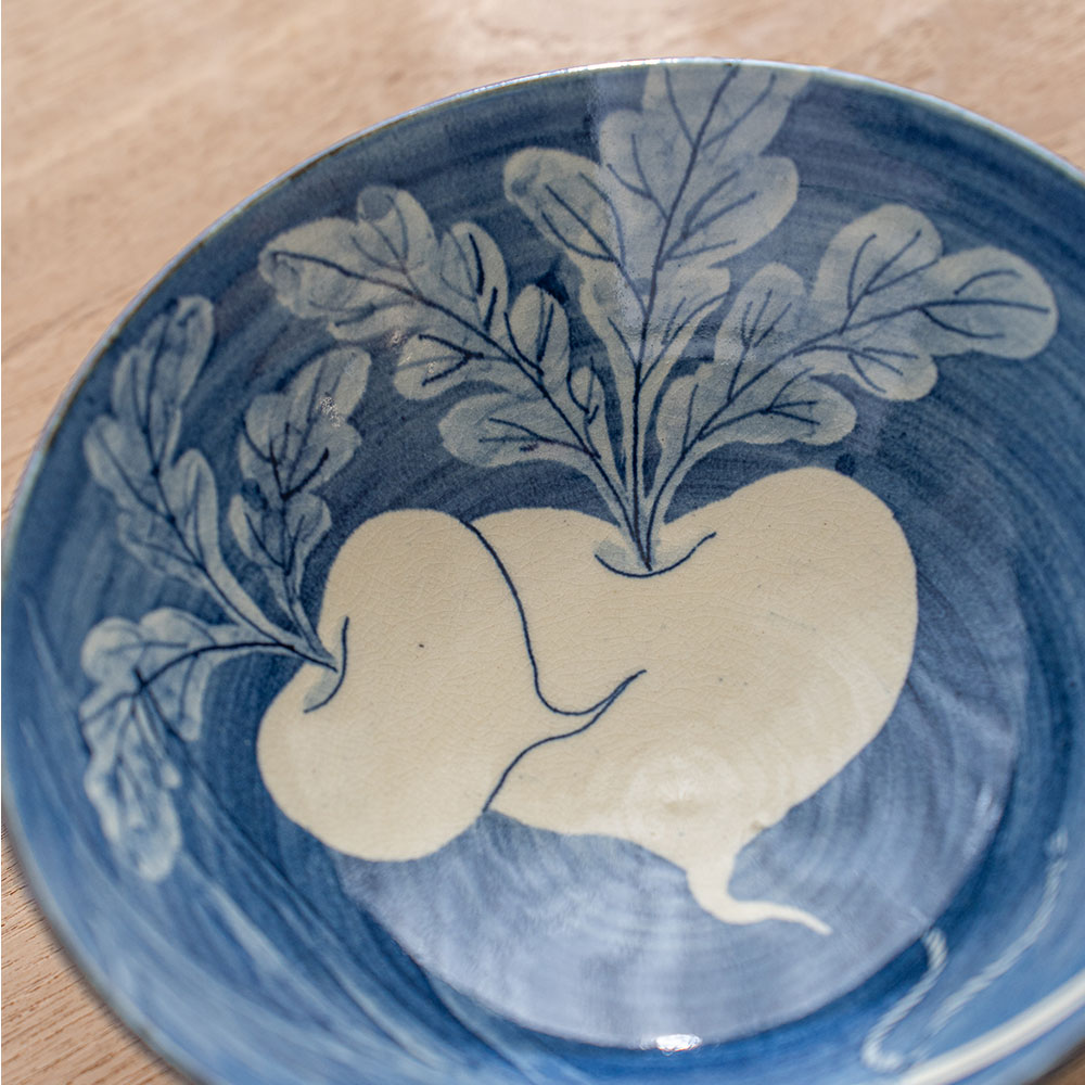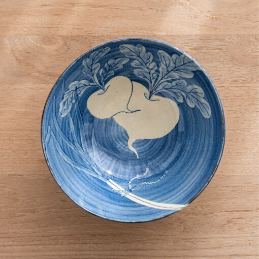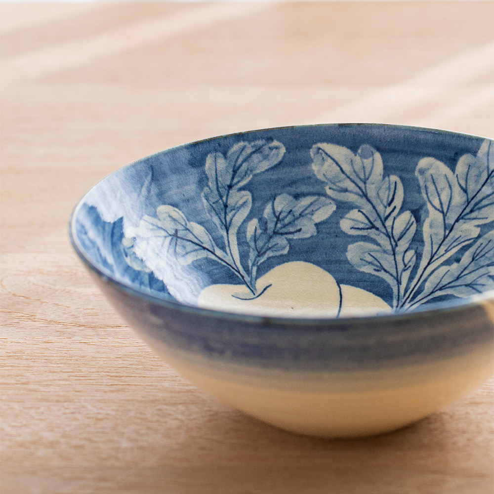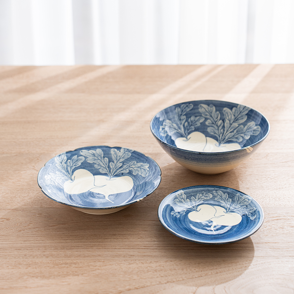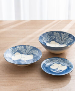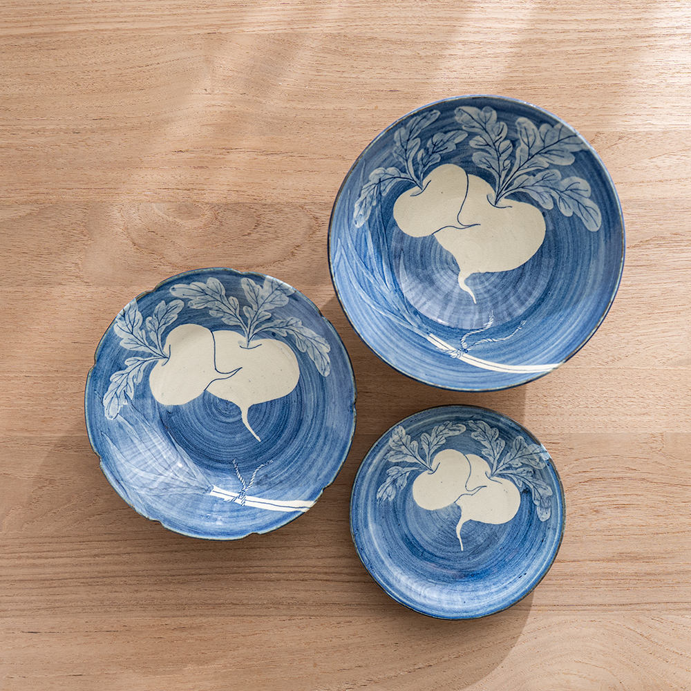 這款濃豔的染付餐盤,以京都的蔬菜-聖護院蕪菁為主題,染付青花的清雅藍白色調,襯托出清水燒的傳統魅力,也展現京野菜獨有的風采。蔬菜圖案的製作,是先以防水材料勾勒出形狀輪廓,再於表面手繪上吳須釉料,二次素燒後,再以細緻的吳須線條為每個圖案添加最後的細節。