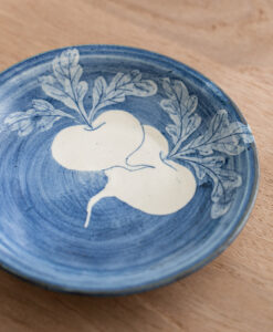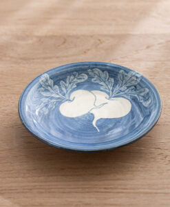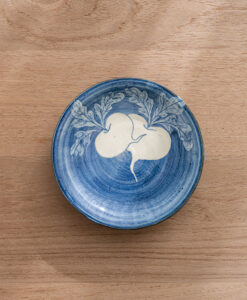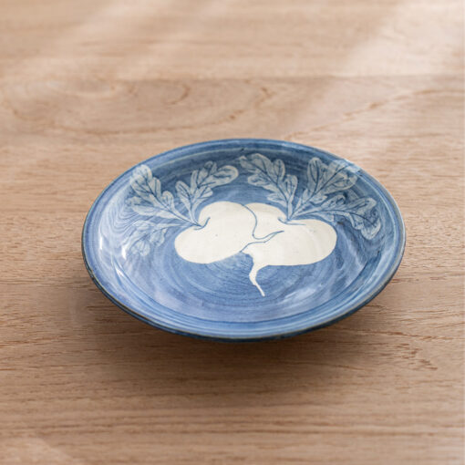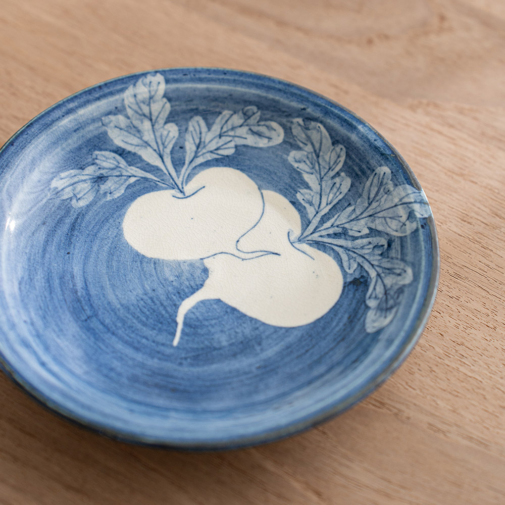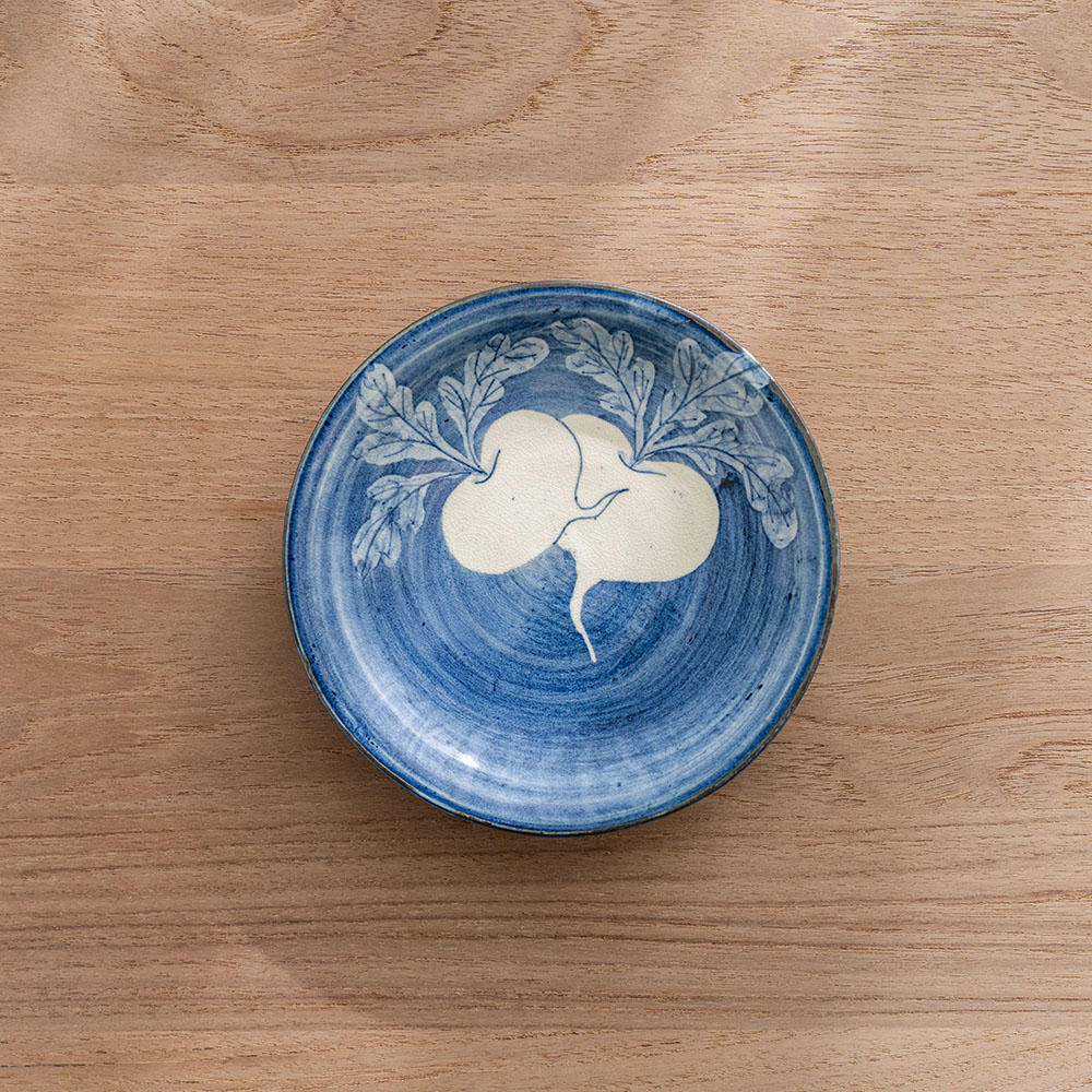 這款濃豔的染付餐盤,以京都的蔬菜-聖護院蕪菁為主題,染付青花的清雅藍白色調,襯托出清水燒的傳統魅力,也展現京野菜獨有的風采。蔬菜圖案的製作,是先以防水材料勾勒出形狀輪廓,再於表面手繪上吳須釉料,二次素燒後,再以細緻的吳須線條為每個圖案添加最後的細節。