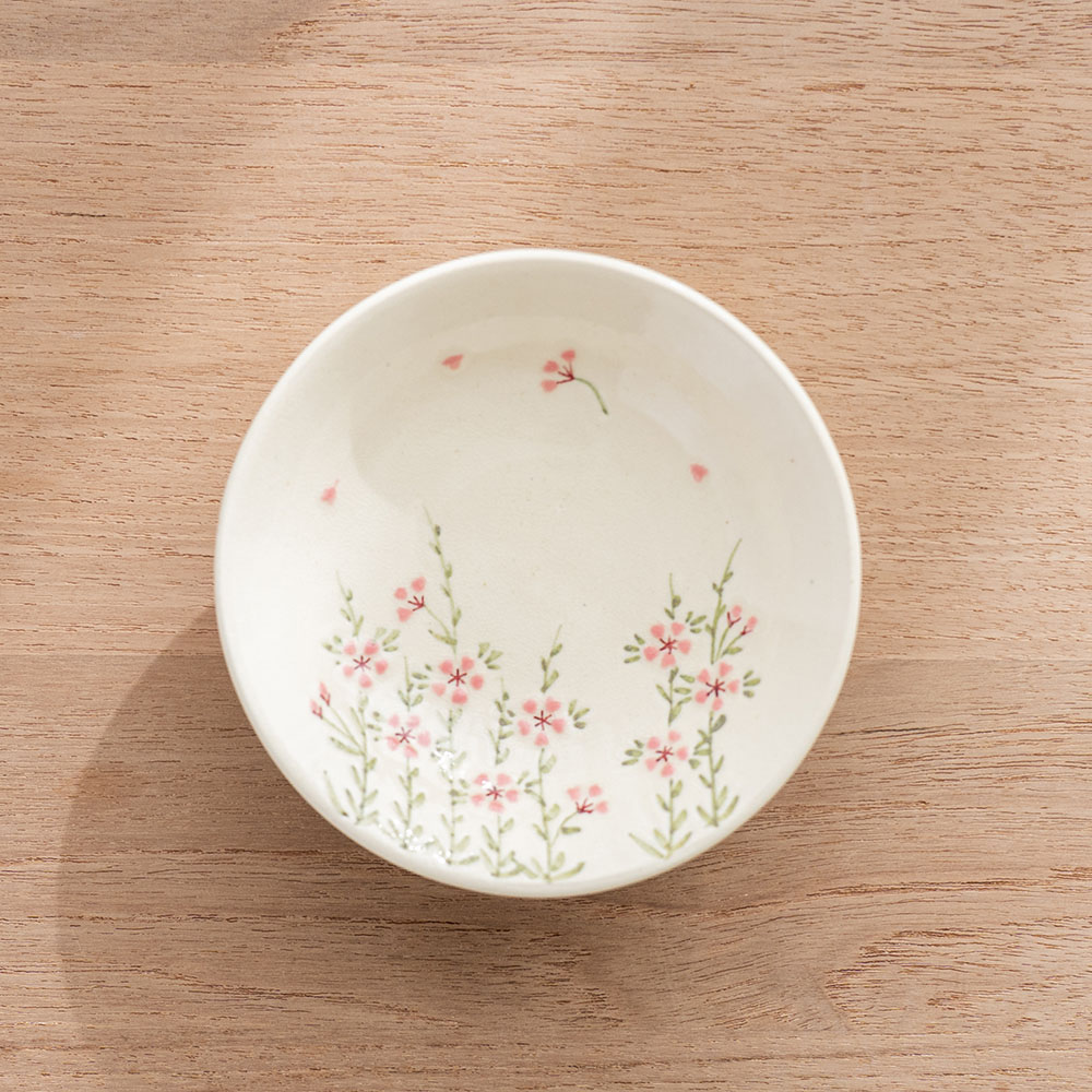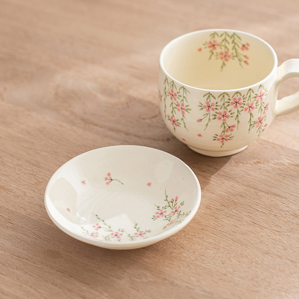 這款描繪了京都祇園優雅的垂枝櫻花的梅型缽,展現了京都的獨特氛圍。櫻花的粉色和淡綠枝葉,美麗地裝飾著清水燒獨有的微黃奶油釉色,而垂枝櫻花正是京都的代表花卉之一。