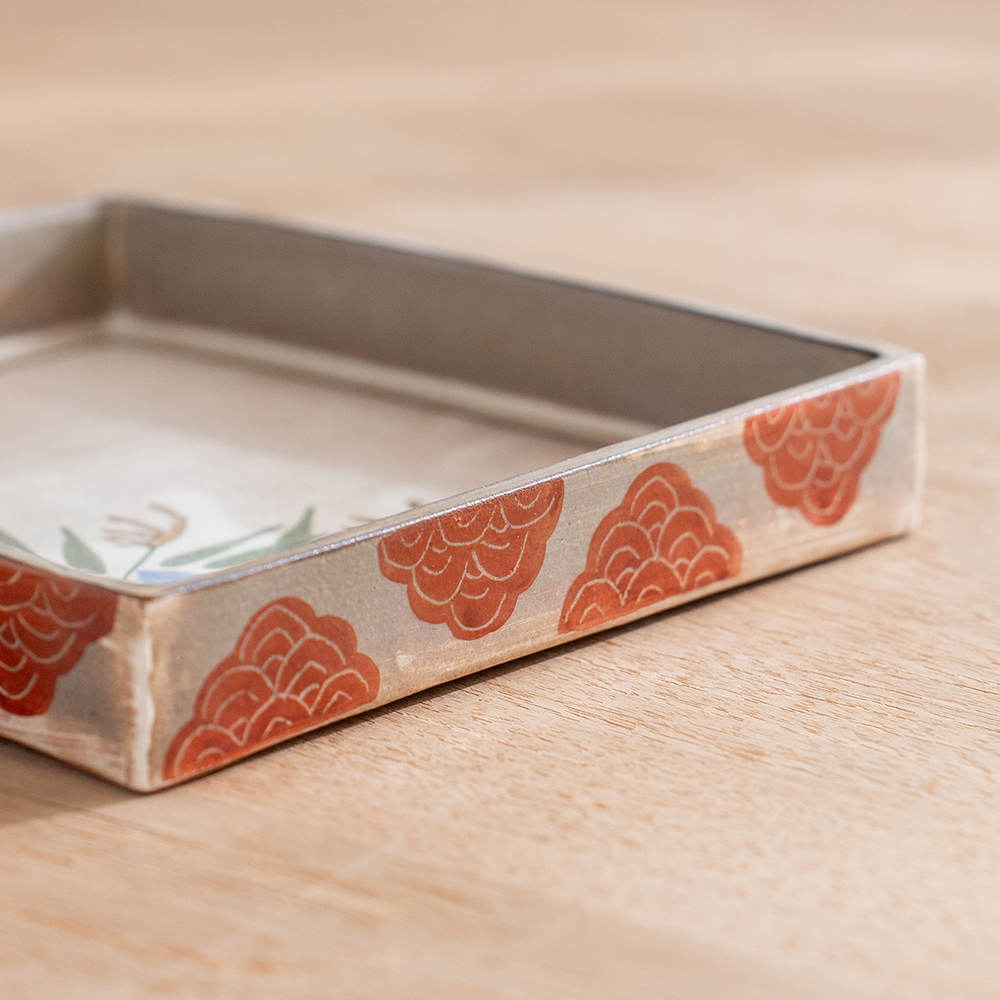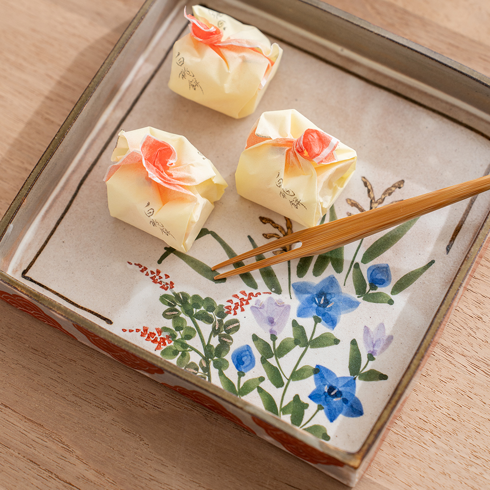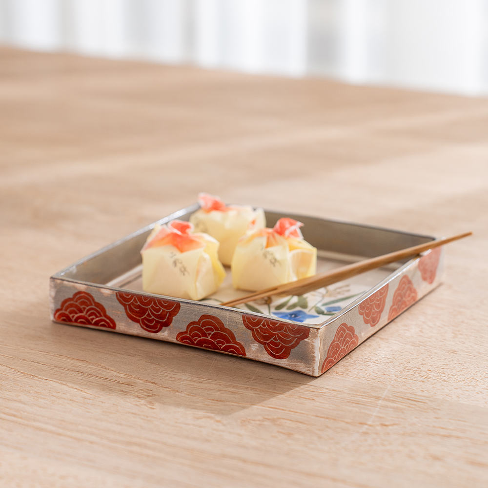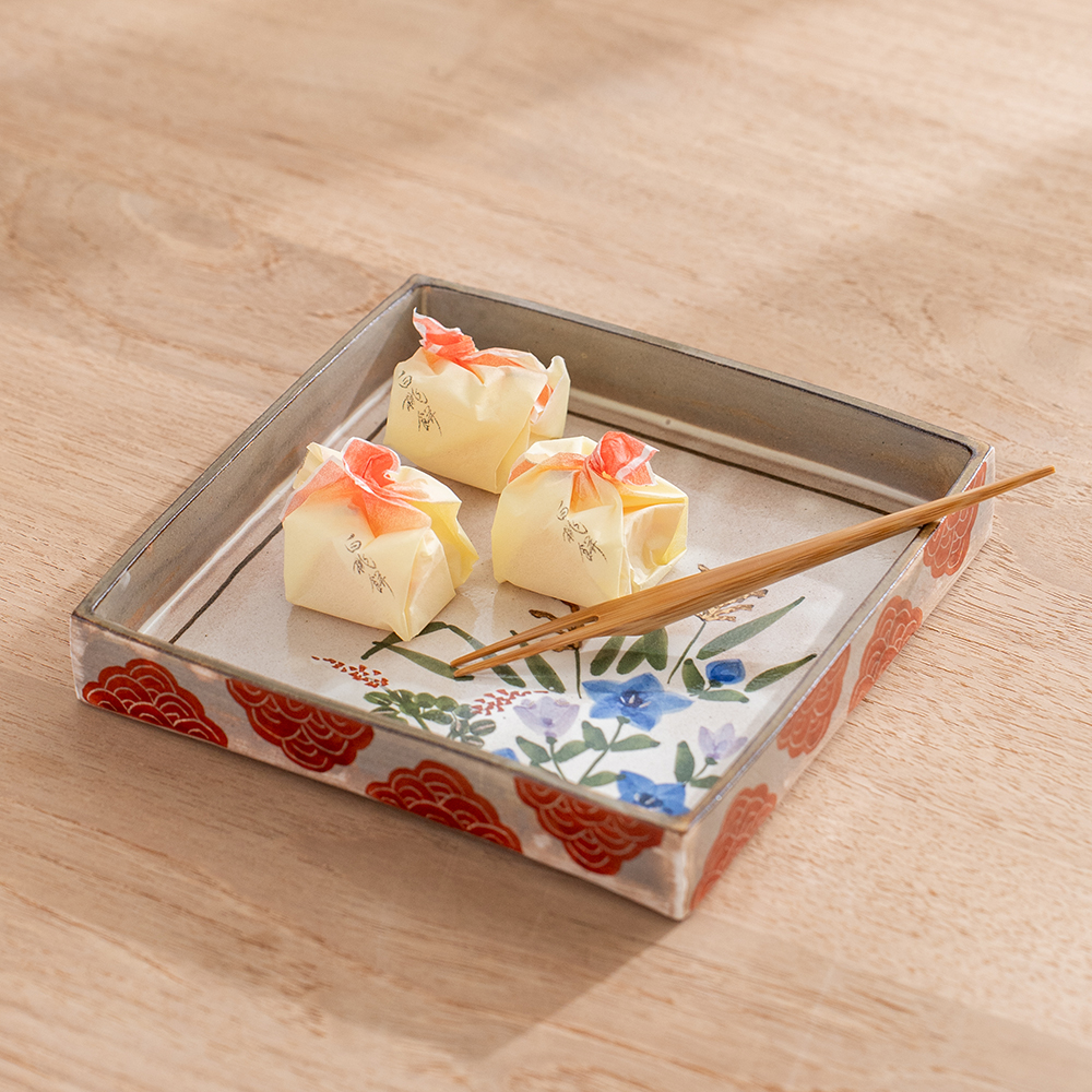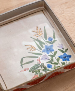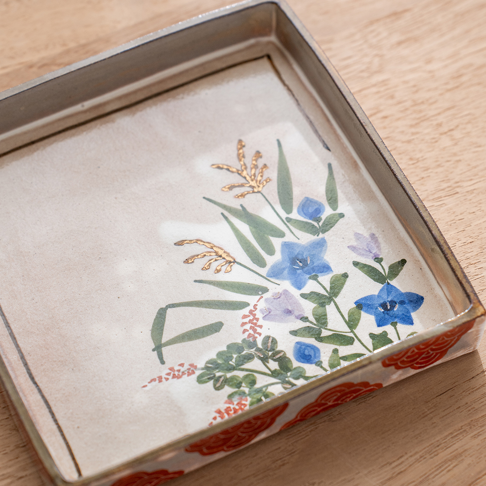 這款以京都秋日花草為主題的點心方盤,以淡雅色彩手繪出秋日花草,呈現出京都的風雅之情。方盤可做為盛放點心,炸物,壽司…等小點,也是做為贈禮的最佳選擇。
